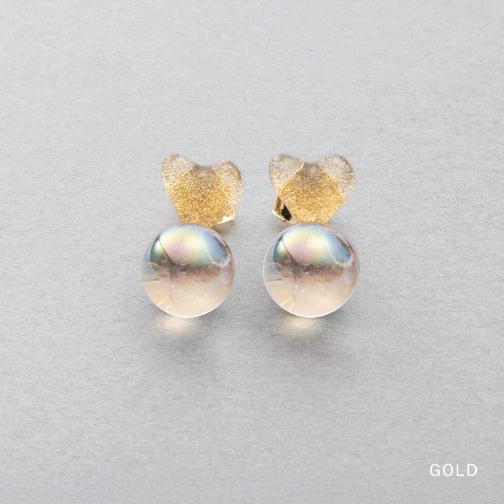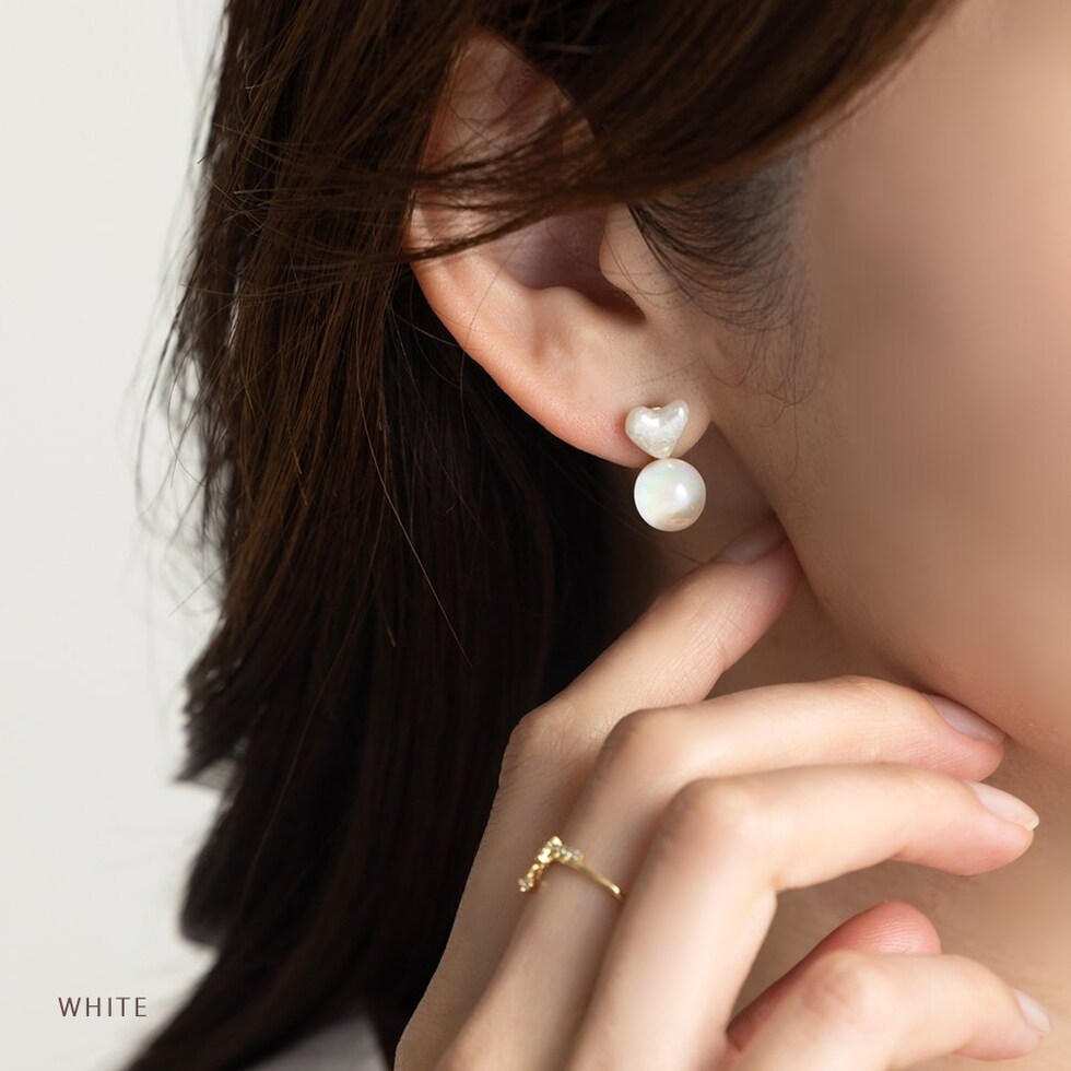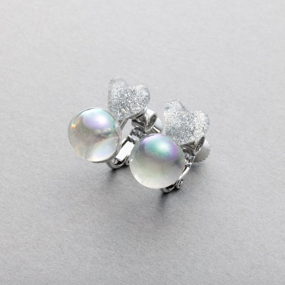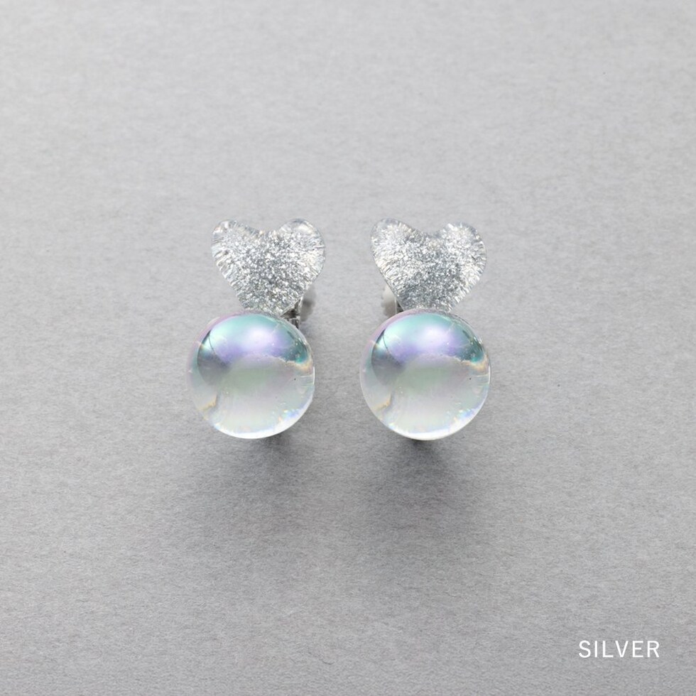 コロンとしたオーロスフィアとハートのイヤリング/ピアス。主張しすぎないサイジングで大人っぽく身につけられます。涼しげなカラーリングで春夏コーデのワンポイントとして活躍しそう。