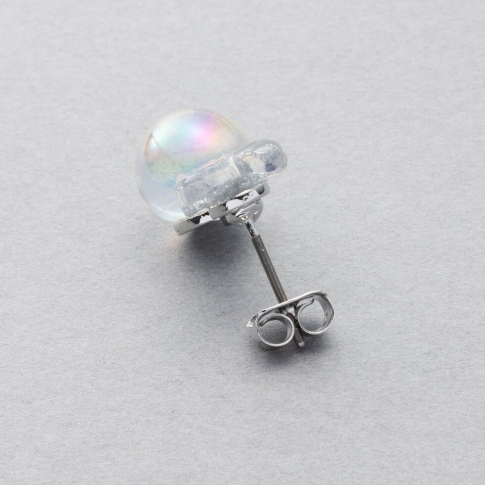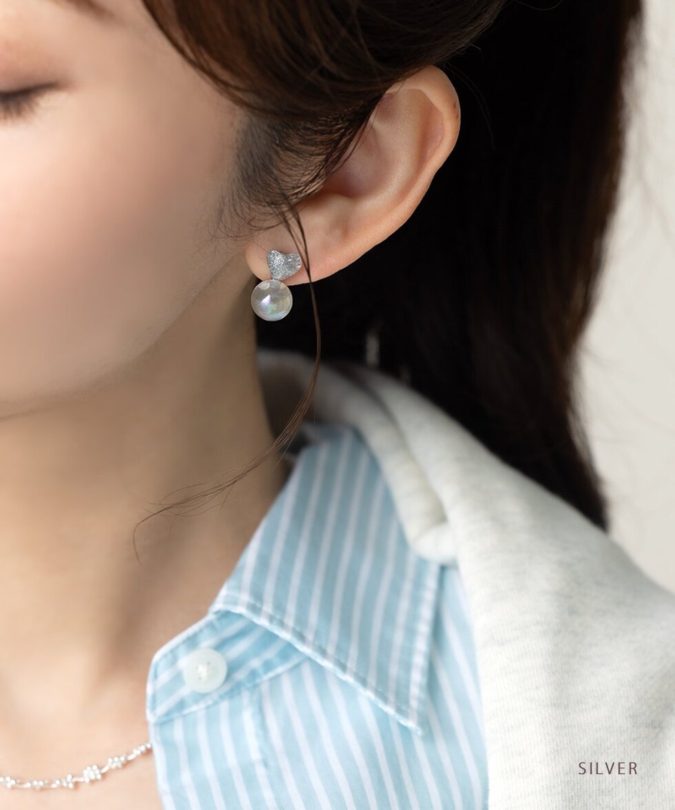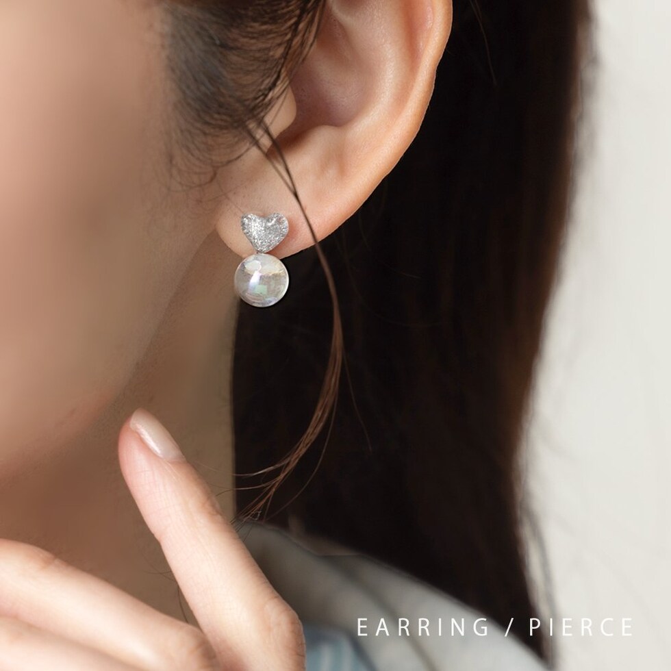 コロンとしたオーロスフィアとハートのイヤリング/ピアス。主張しすぎないサイジングで大人っぽく身につけられます。涼しげなカラーリングで春夏コーデのワンポイントとして活躍しそう。