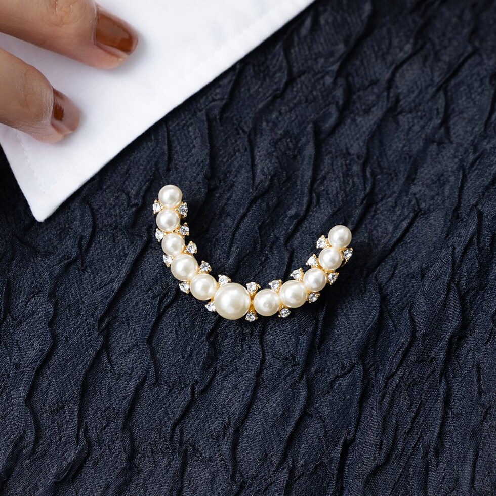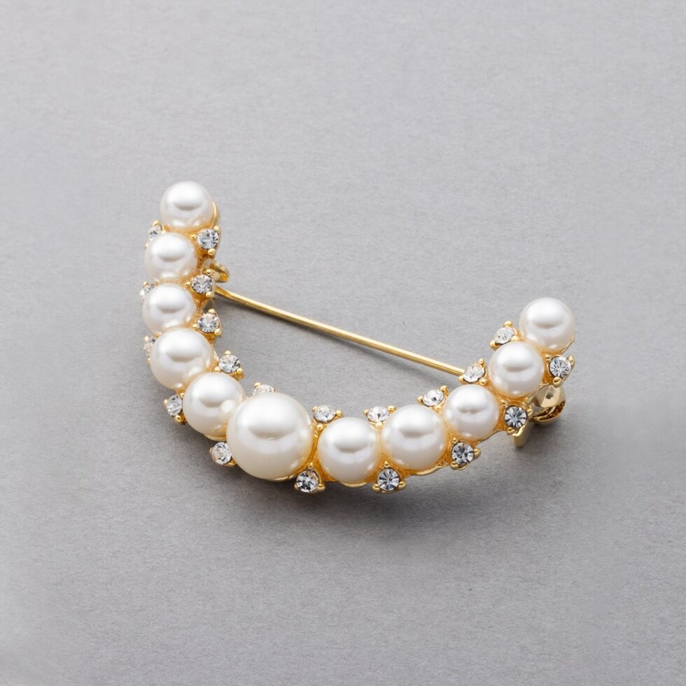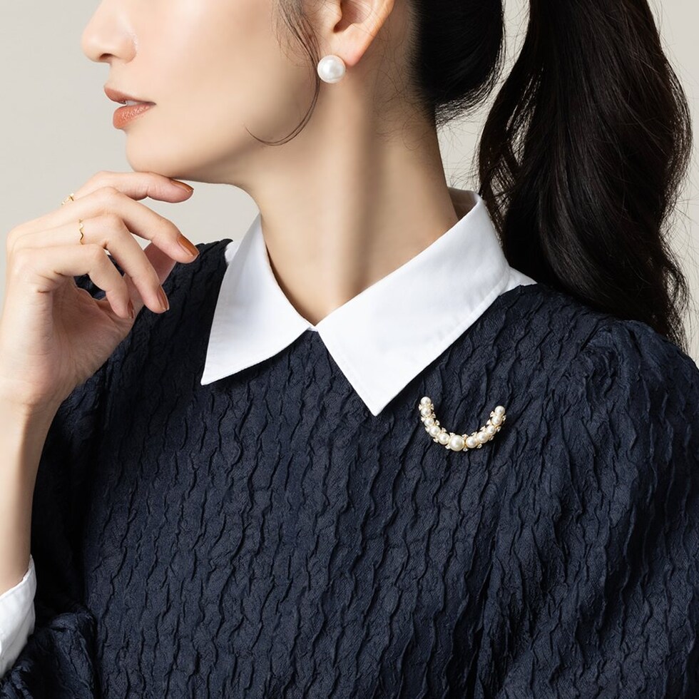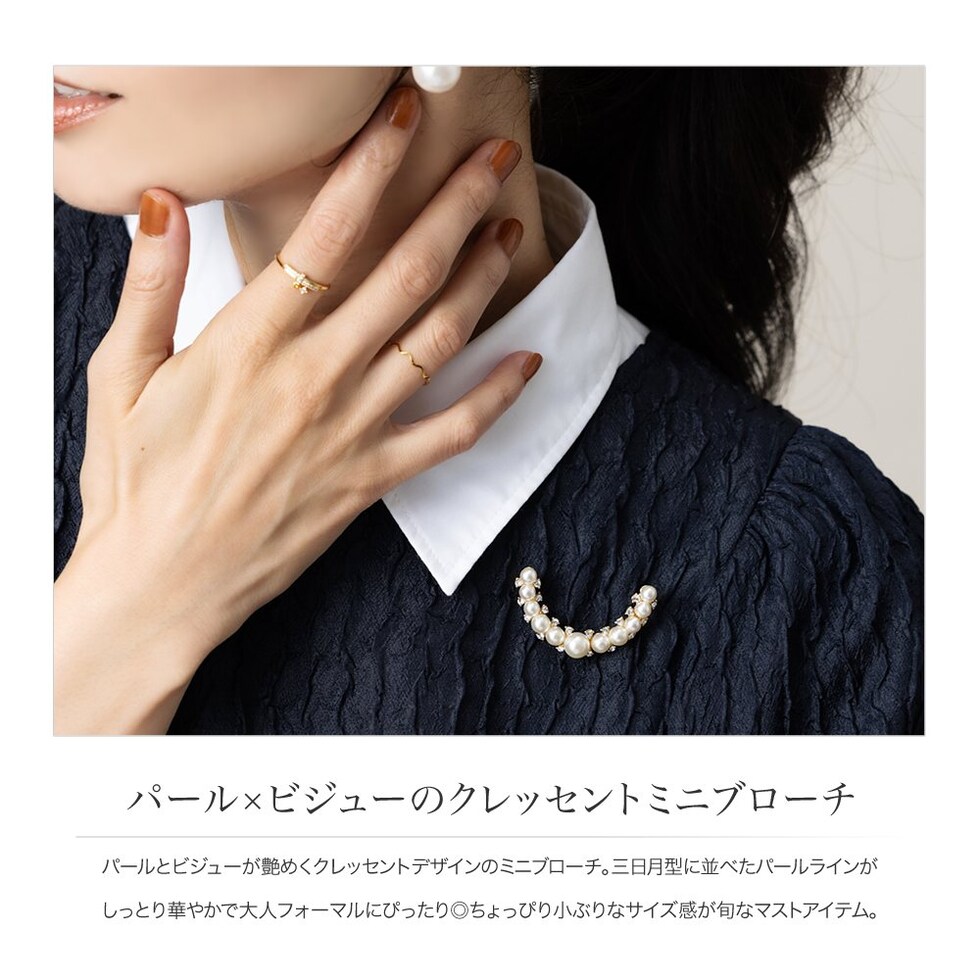 パールとビジューが艶めくクレッセントデザインのミニブローチ。三日月型に並べたパールラインがしっとり華やかで大人フォーマルにぴったり◎ちょっぴり小ぶりなサイズ感が旬なマストアイテム。