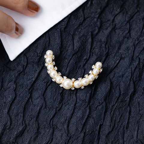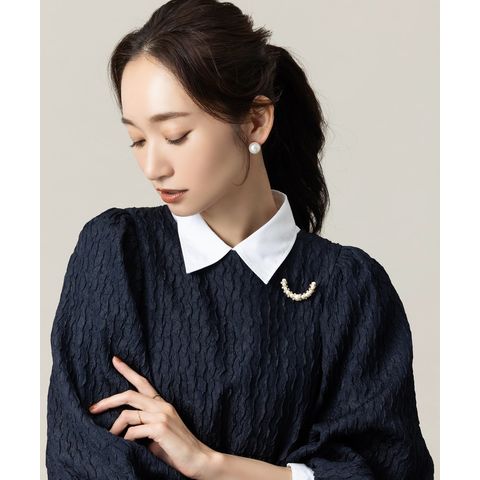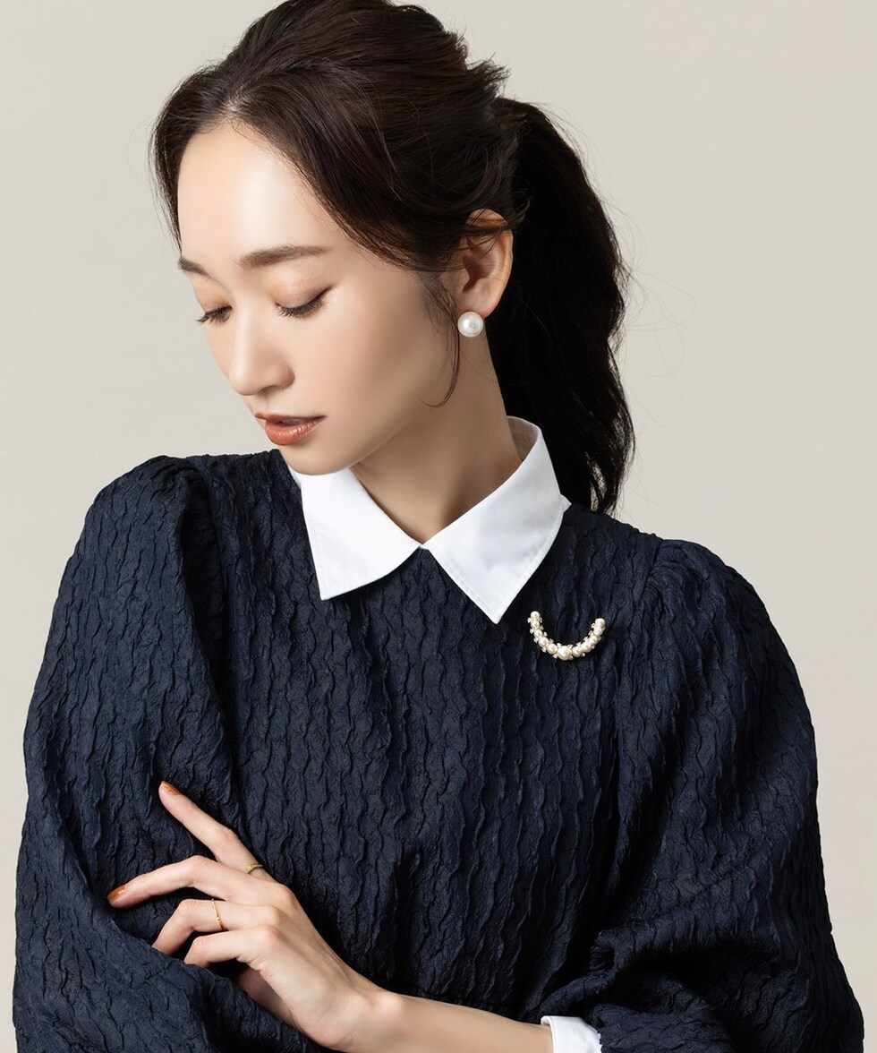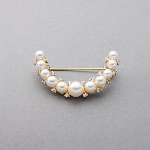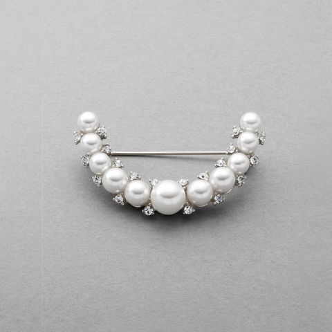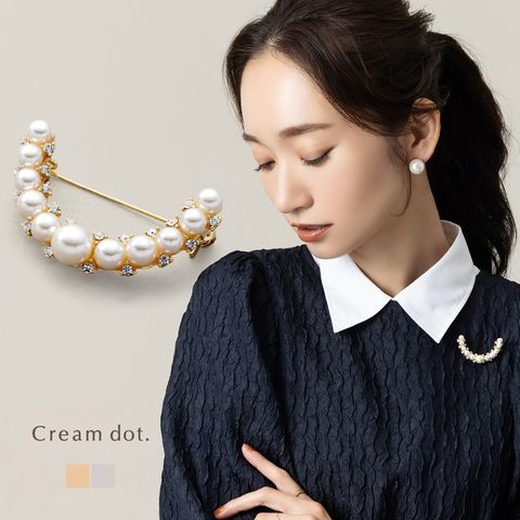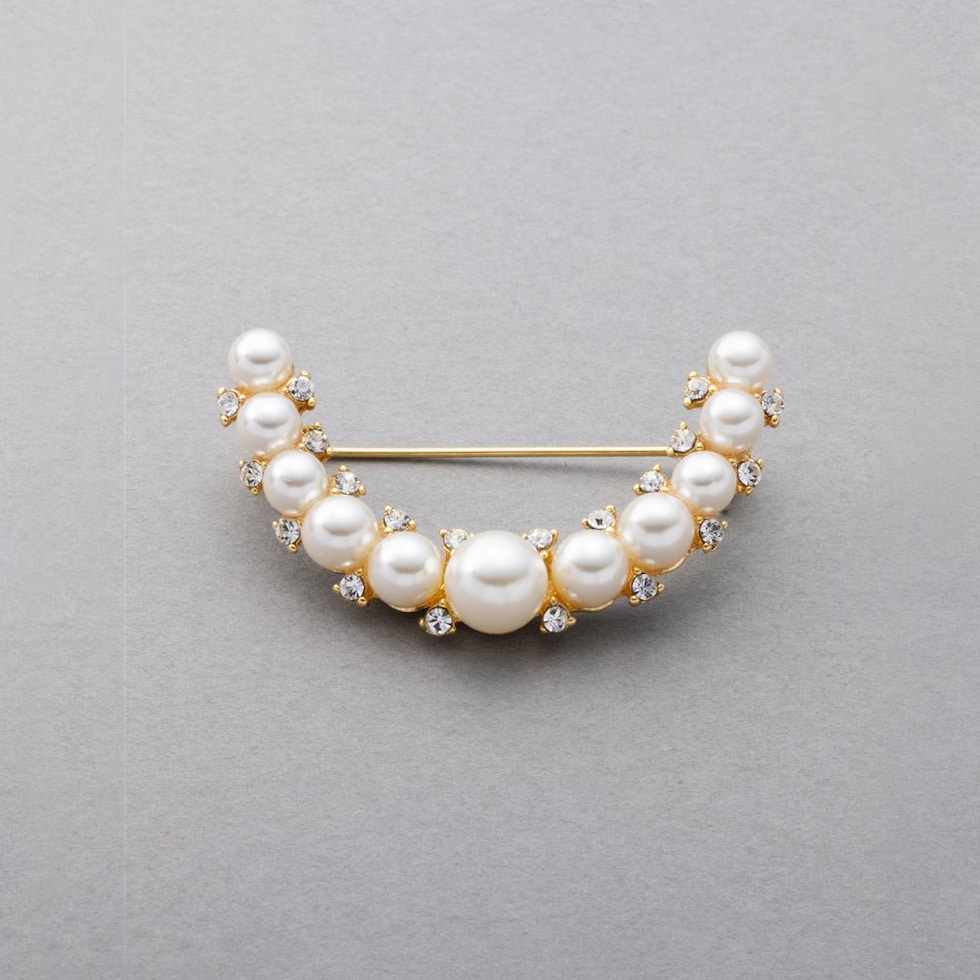 パールとビジューが艶めくクレッセントデザインのミニブローチ。三日月型に並べたパールラインがしっとり華やかで大人フォーマルにぴったり◎ちょっぴり小ぶりなサイズ感が旬なマストアイテム。