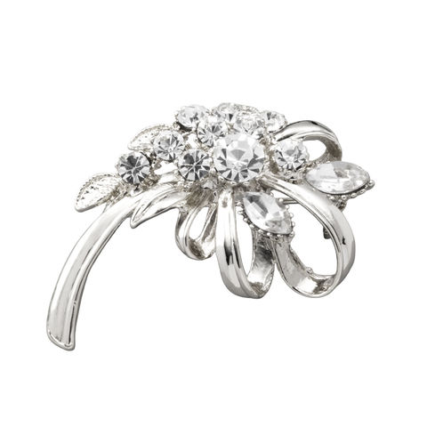 キラキラと煌くビジューを飾ったミニブローチ。フラワーとアシンメトリーなリボンを組み合わせた大人っぽいデザインです。華やかになりすぎない小ぶりなサイズ感でパーティーや卒入園式コーデに活躍します◎