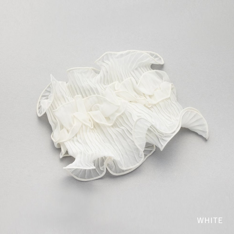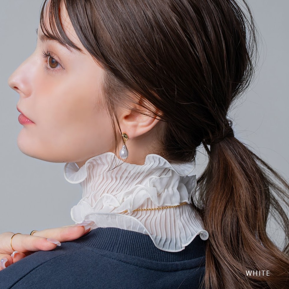 透け感あるシフォン生地のプリーツフリルデザインが大人可愛いネックカバー。頭からかぶるだけの簡単仕様が◎カーディガンやスウェットなどに合わせるだけでいつものコーデをガラッと変えてくれるから、1つ持っておくだけでスタイリングの幅が広がります。