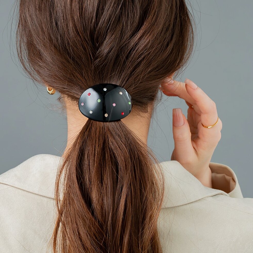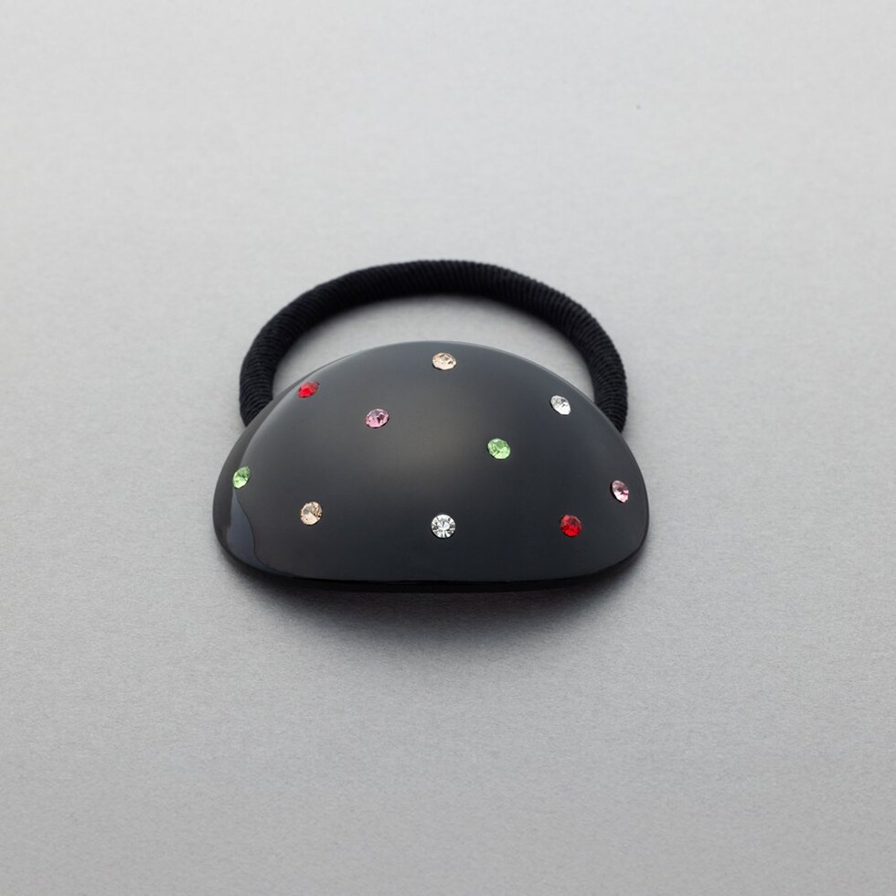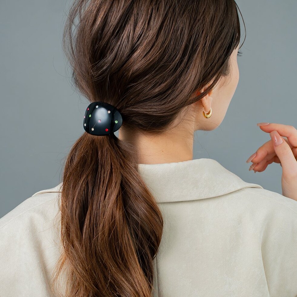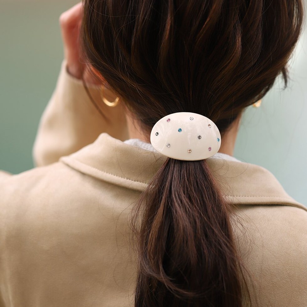 オーバルモチーフにマルチビジューのドット模様が大人可愛いヘアゴム。程よいサイズ感で取り入れやすいひと品◎ラフなまとめ髪も今っぽい雰囲気に仕上げてくれるアイテムです。