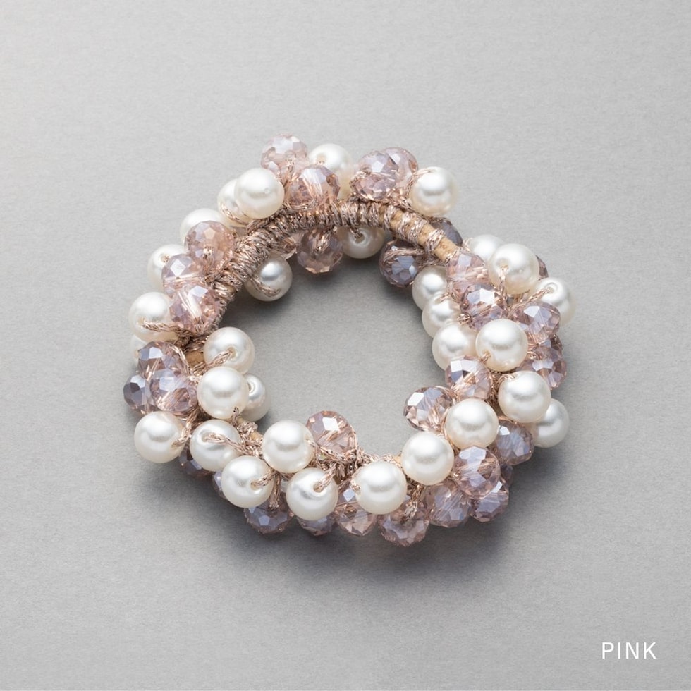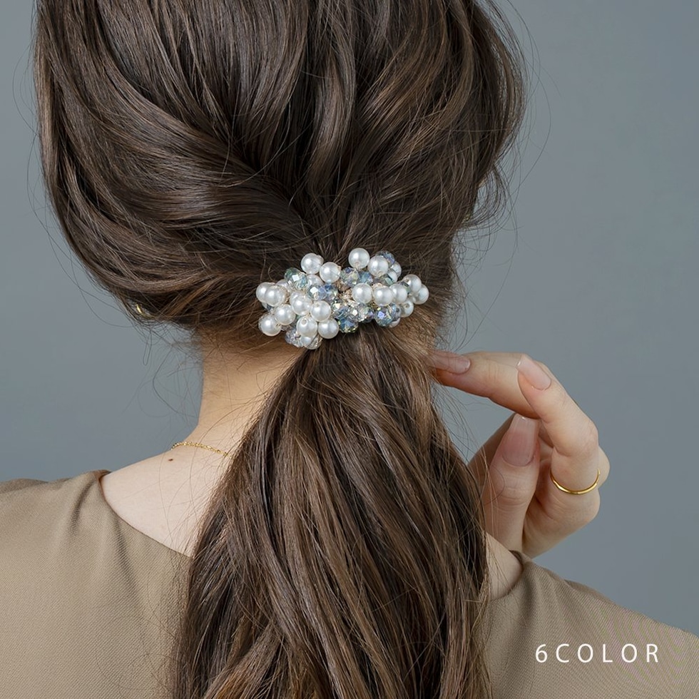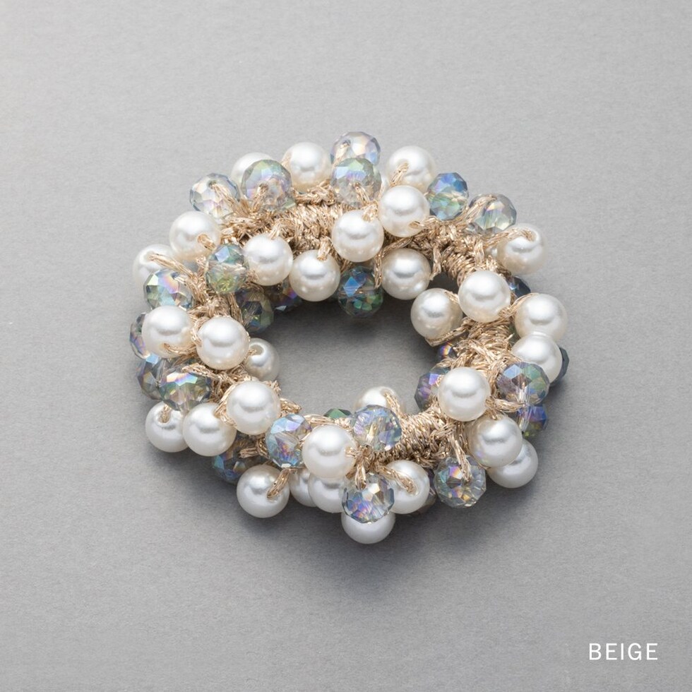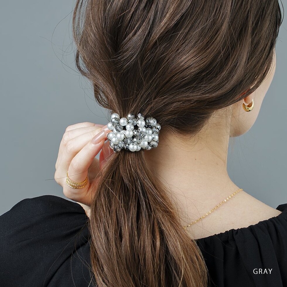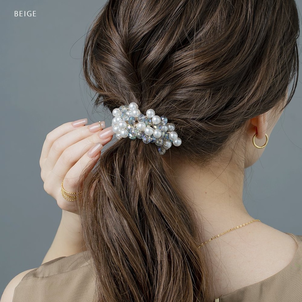 ランダムパール×ビジューのバブルヘアゴム。小粒の艶パールと多角形ビーズをラメ入りの糸にランダムに飾った贅沢デザイン。さっとまとめるだけで華やかな雰囲気にクラスアップします。使わない時にはブレスレットにもなるから優秀◎