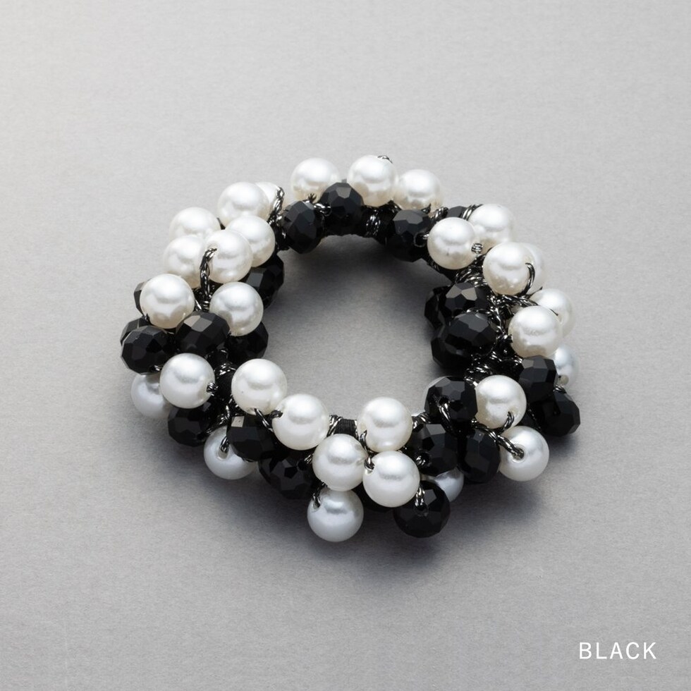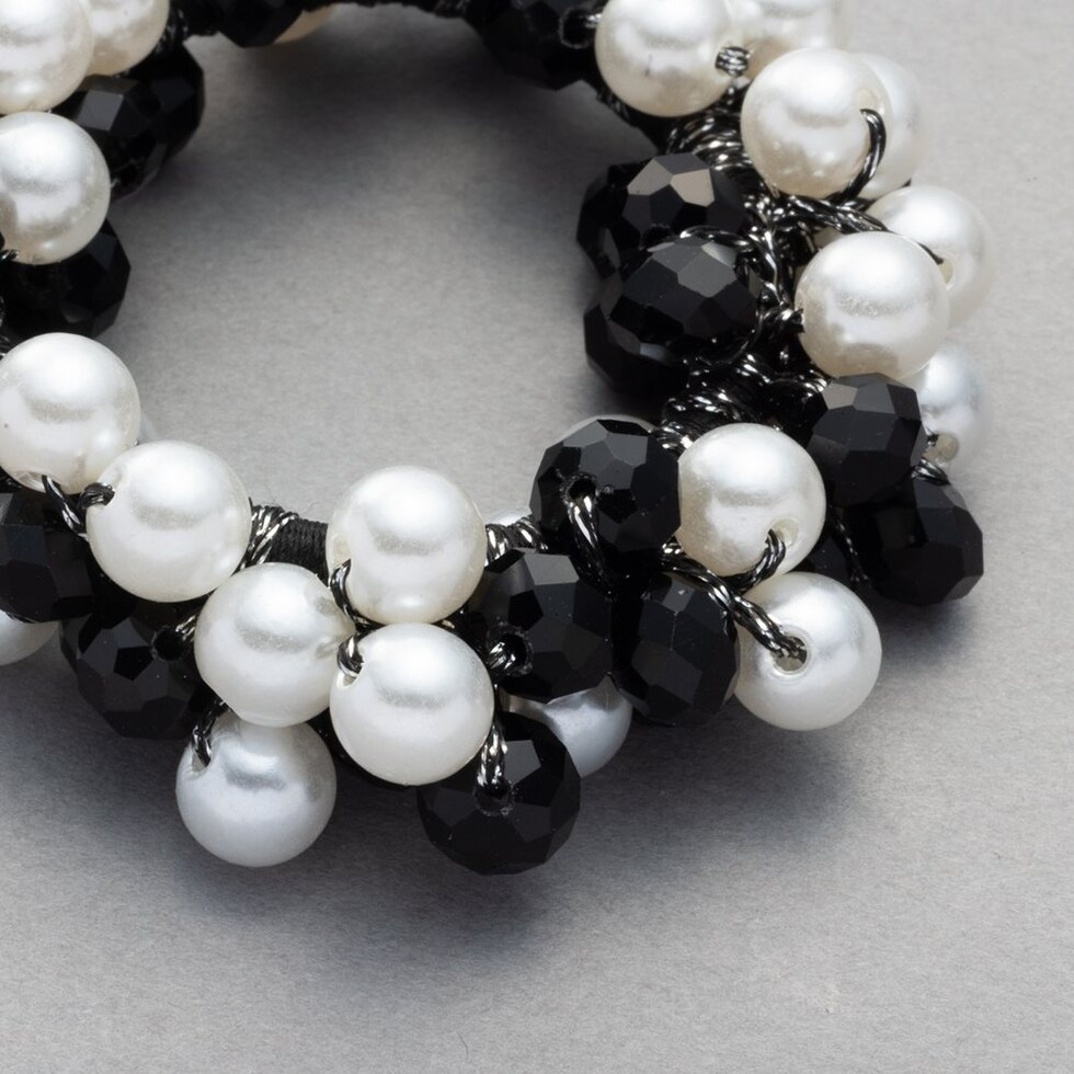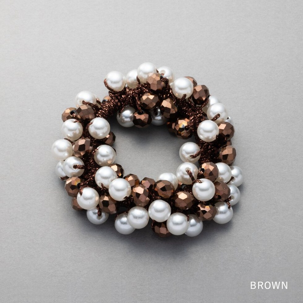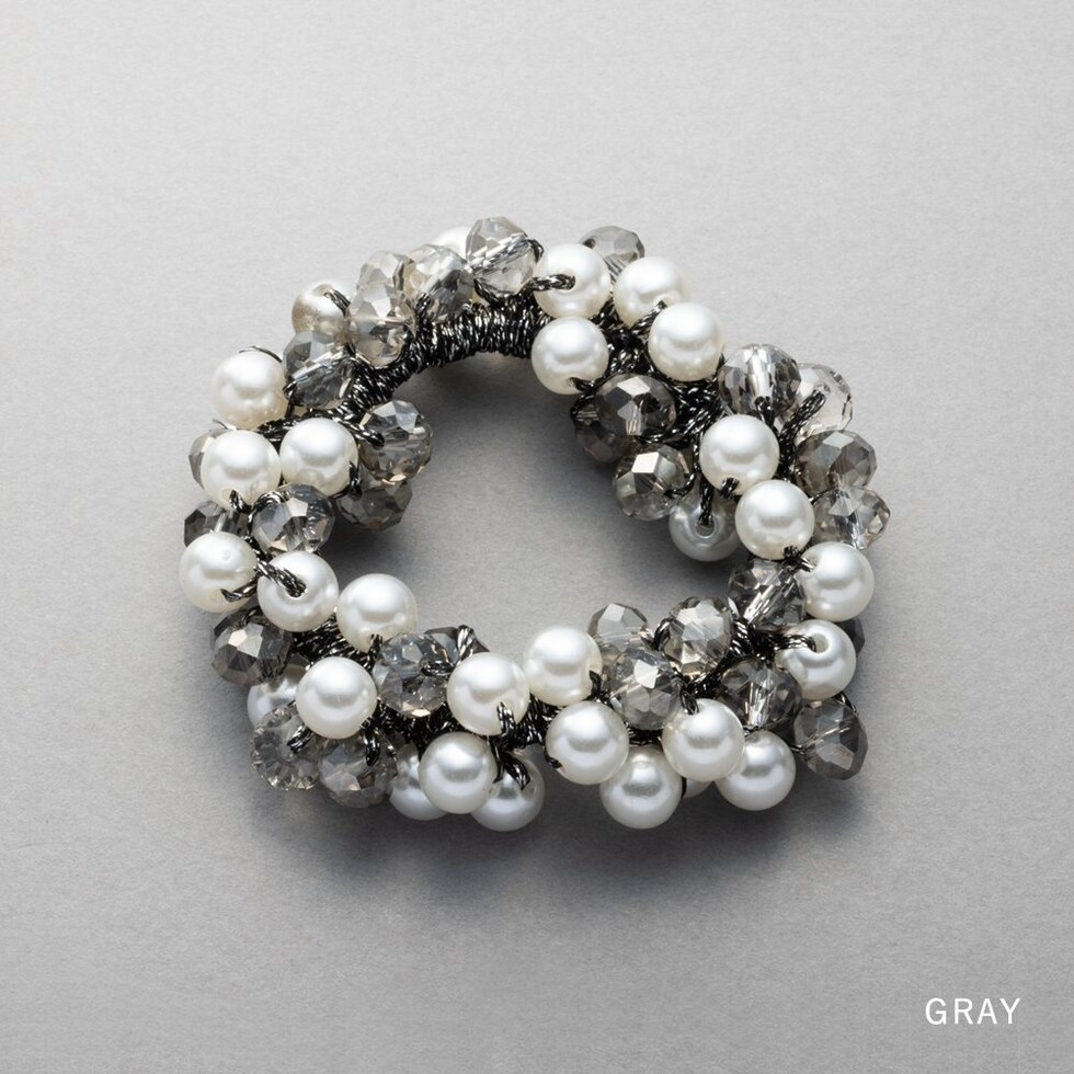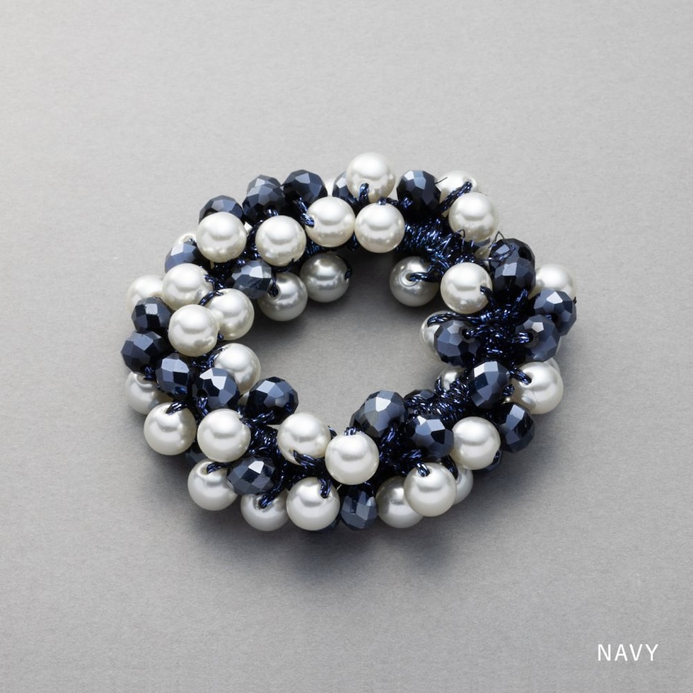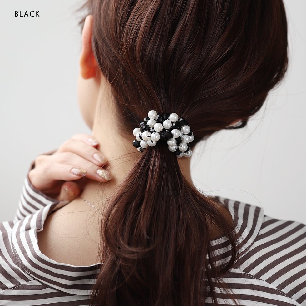 ランダムパール×ビジューのバブルヘアゴム。小粒の艶パールと多角形ビーズをラメ入りの糸にランダムに飾った贅沢デザイン。さっとまとめるだけで華やかな雰囲気にクラスアップします。使わない時にはブレスレットにもなるから優秀◎