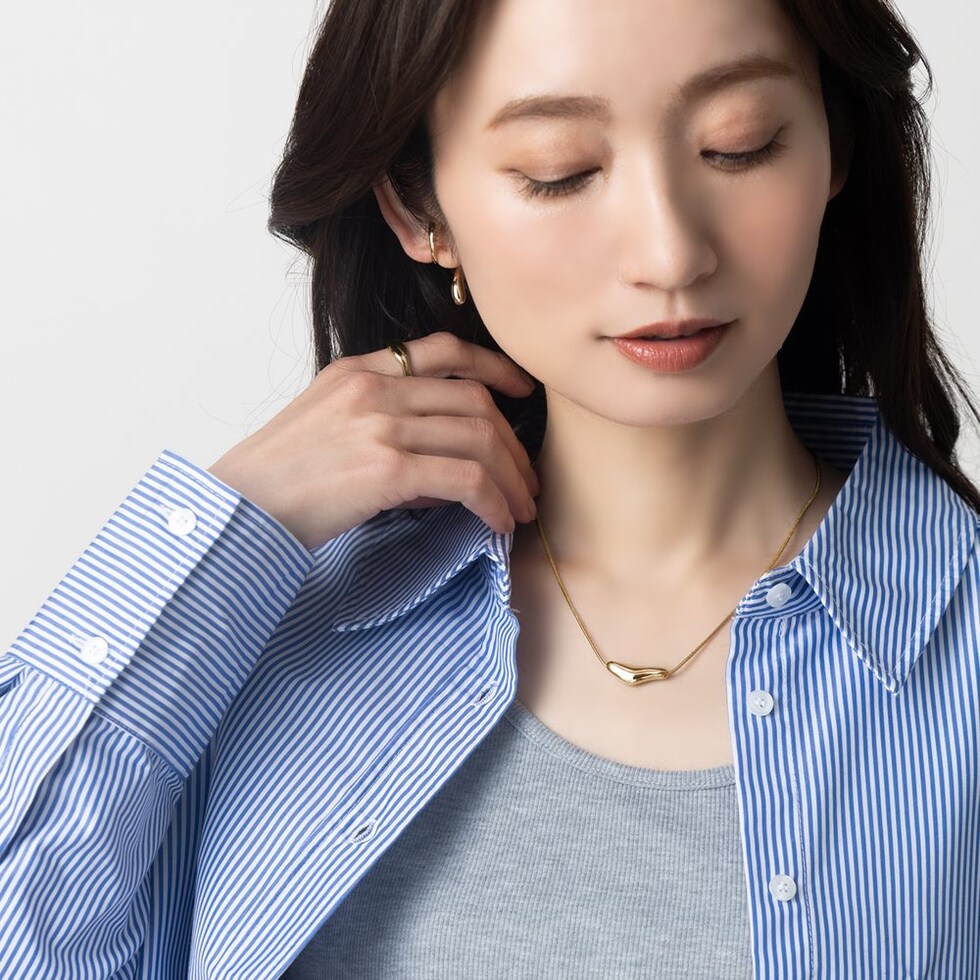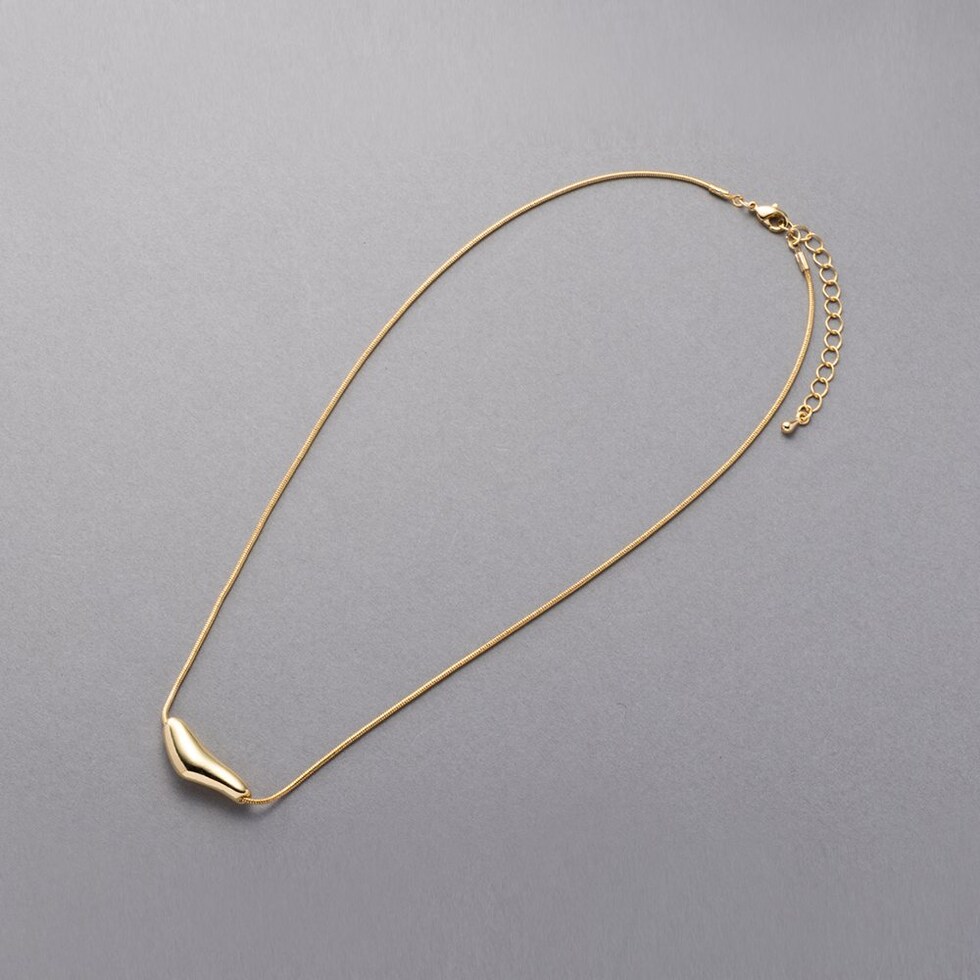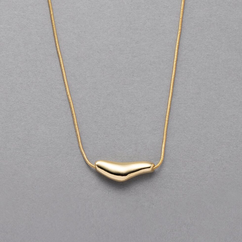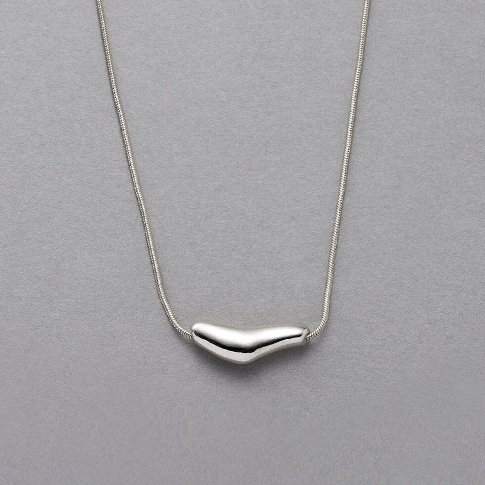 ハートを横長にして変形させたようなぷっくりモチーフのスネークチェーンネックレス。しなやかスネークチェーンに大人の遊び心をくすぐるデザインがこなれた雰囲気を演出します。品よく大人っぽく身につけられる、コーデのアクセントにぴったりなひと品◎