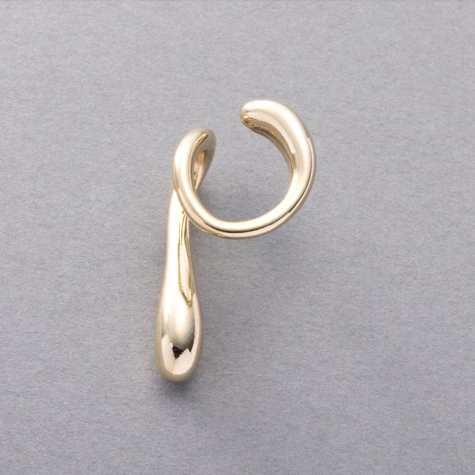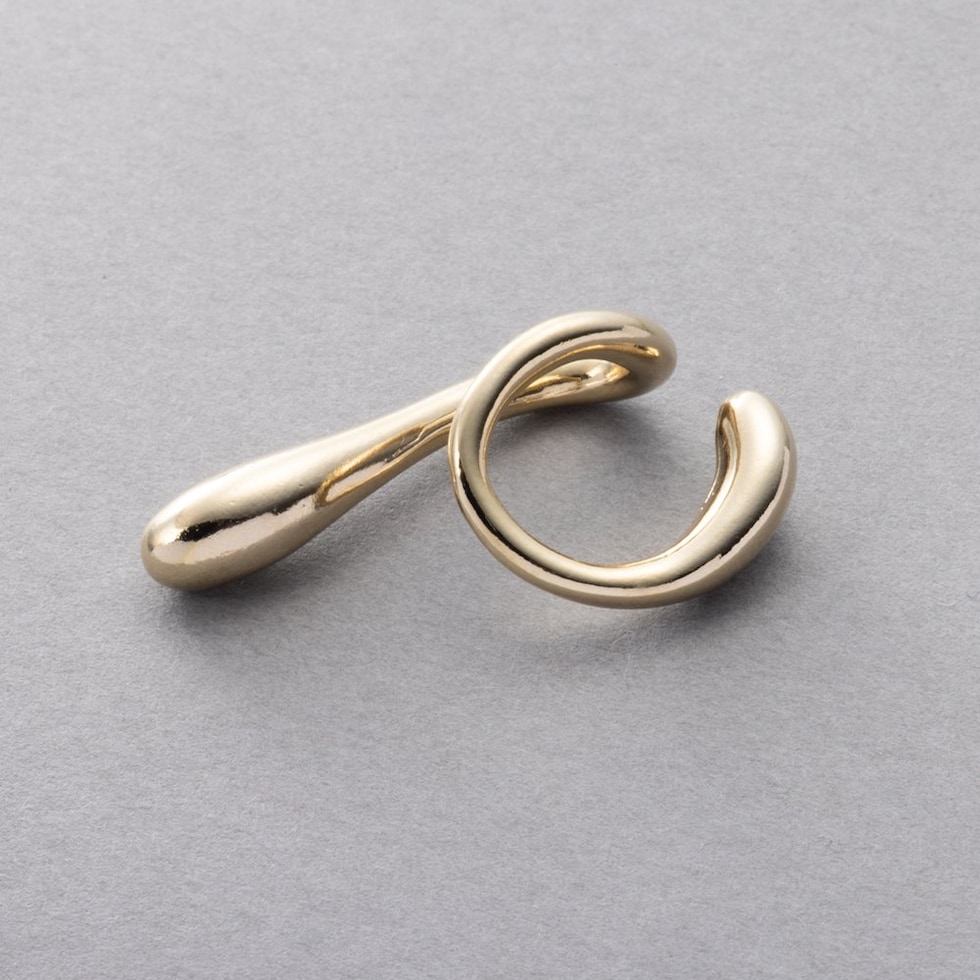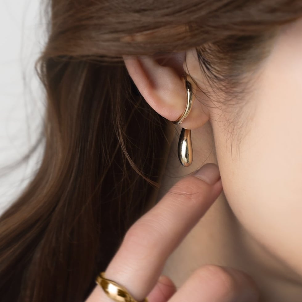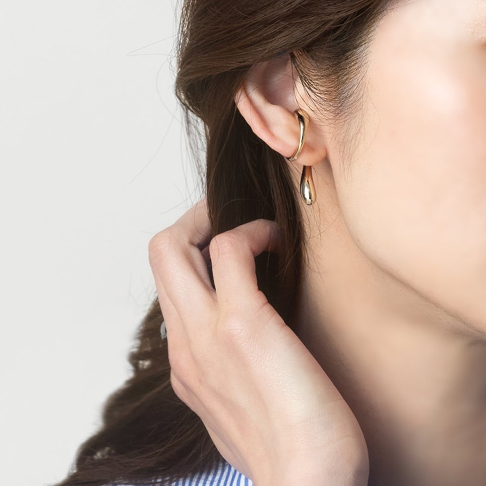 レイヤードのようなデザインの片耳用イヤーカフ。耳の後ろから覗くドロップがニュアンスたっぷりで周りと差のつくデザイン。