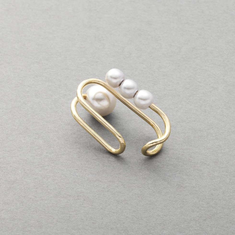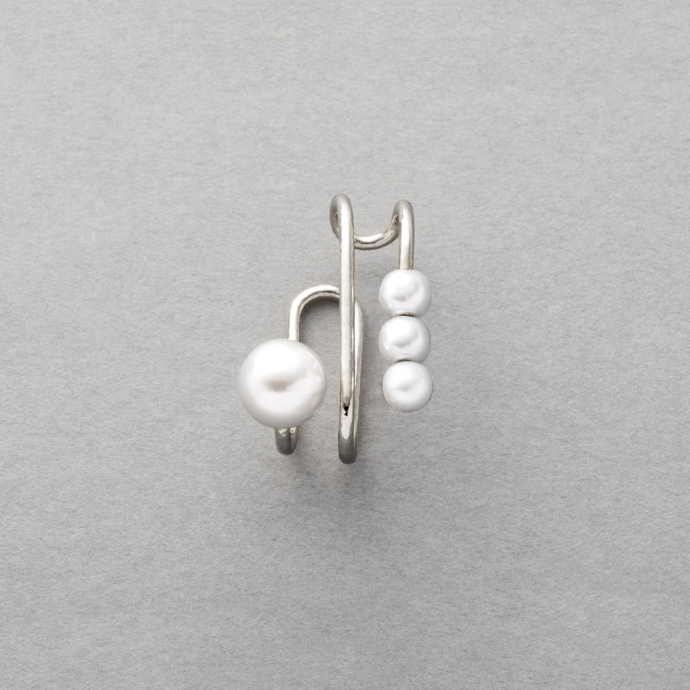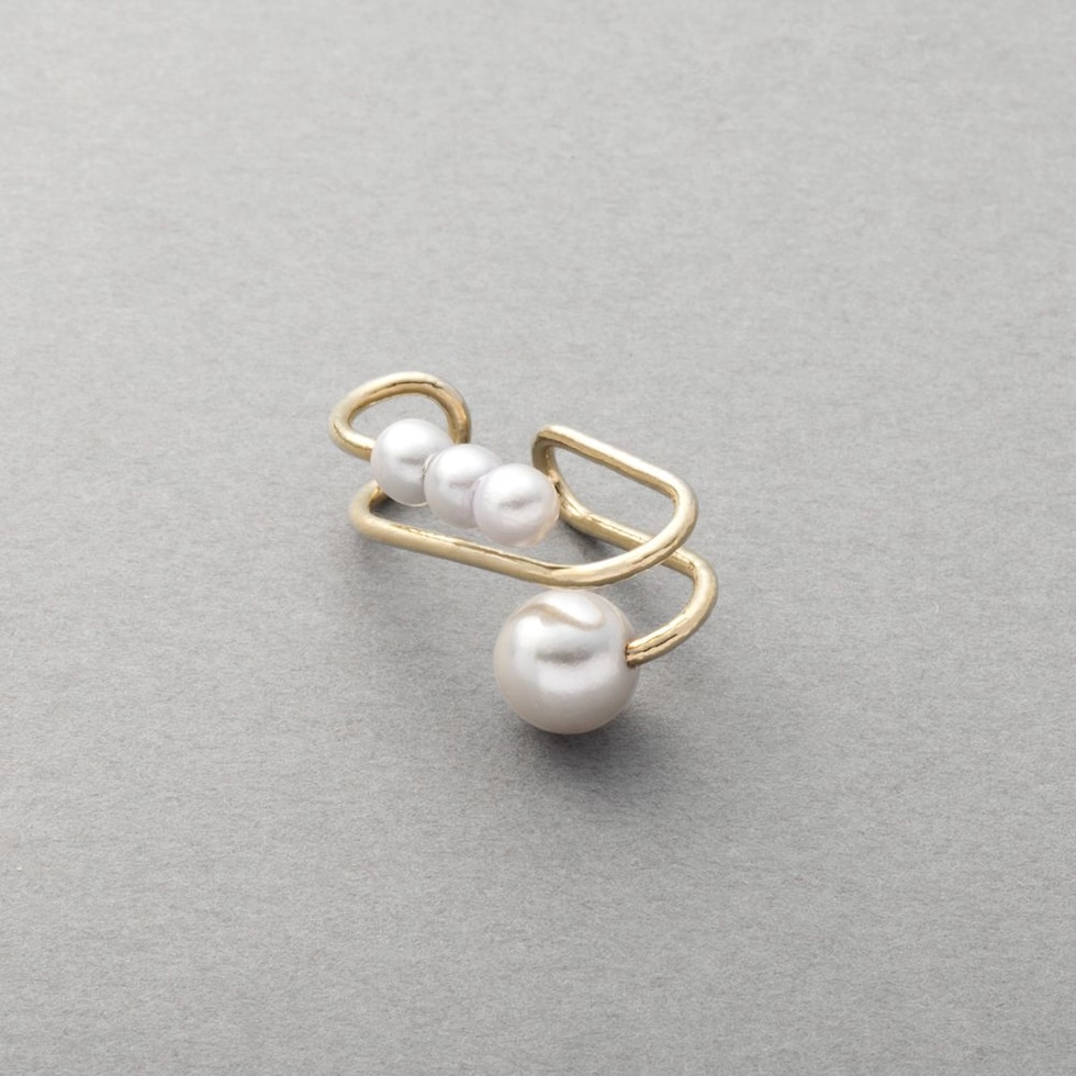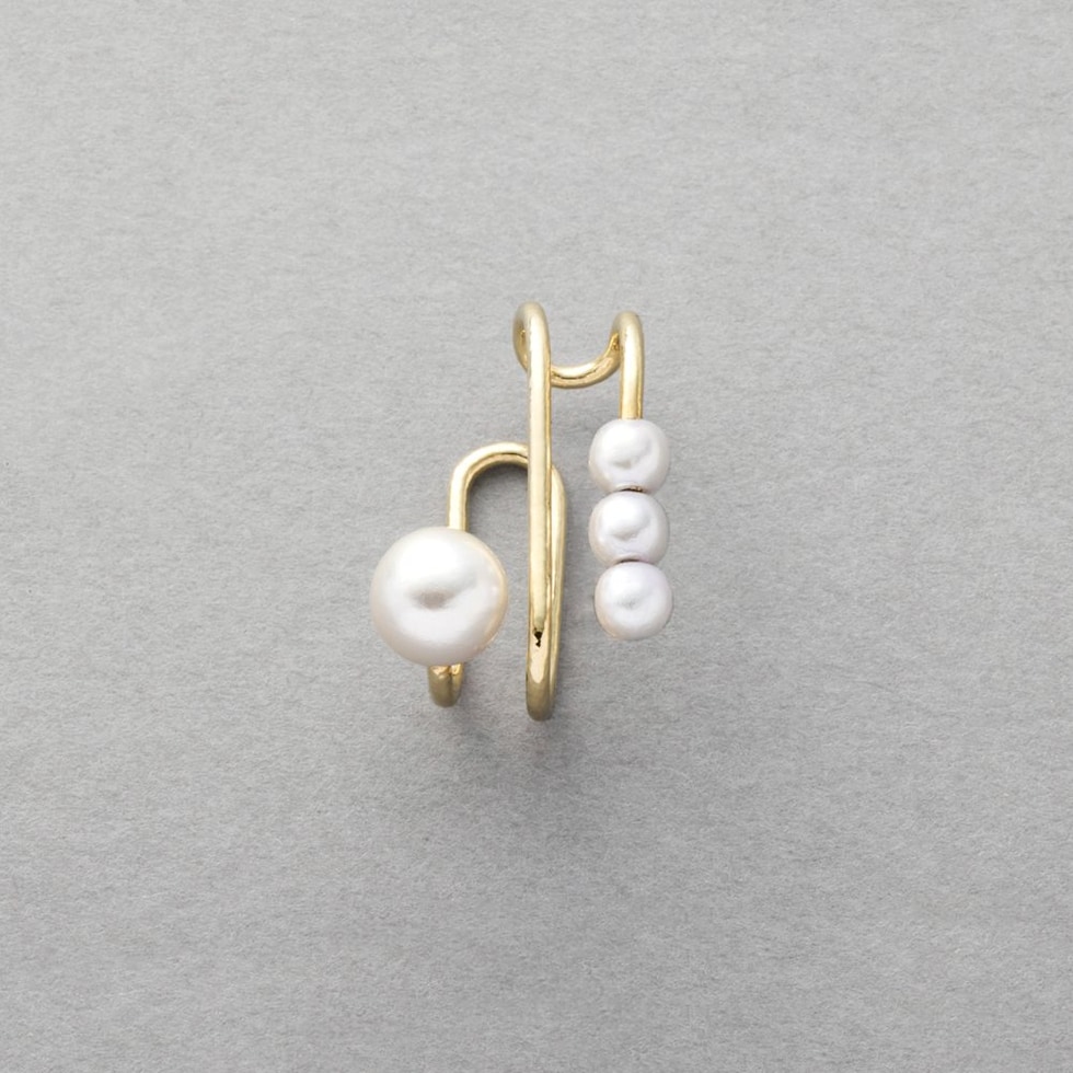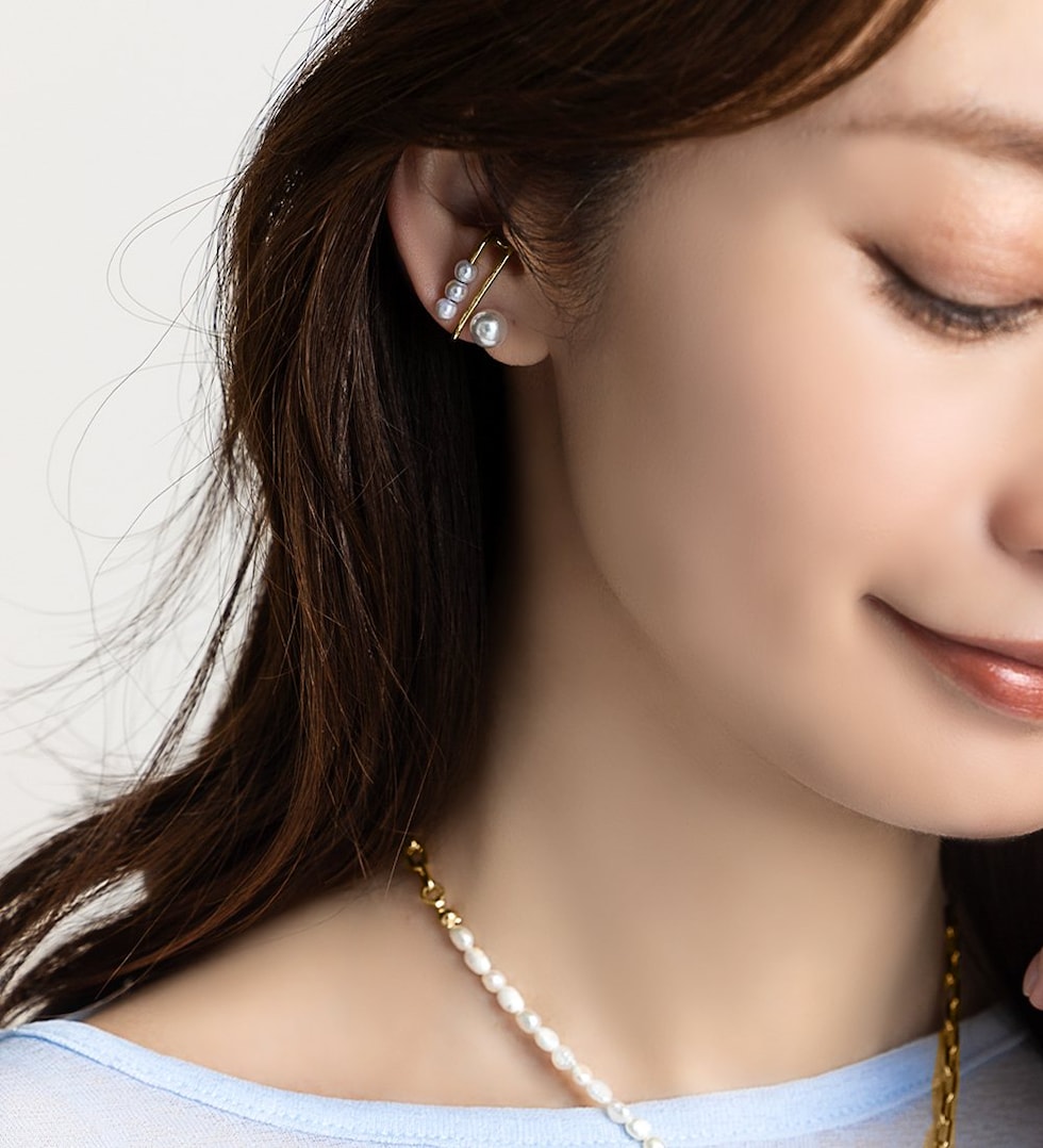 ニュアンスたっぷりパール×2連メタルの片耳用イヤーカフ。一つでこなれ感あるレイヤード風メタルにパールを配したオーバル型デザイン。程よいボリューム感と華やかさがデイリーに取り入れやすいアイテムです。