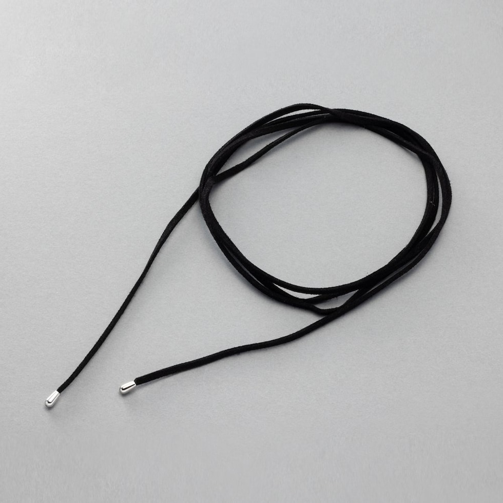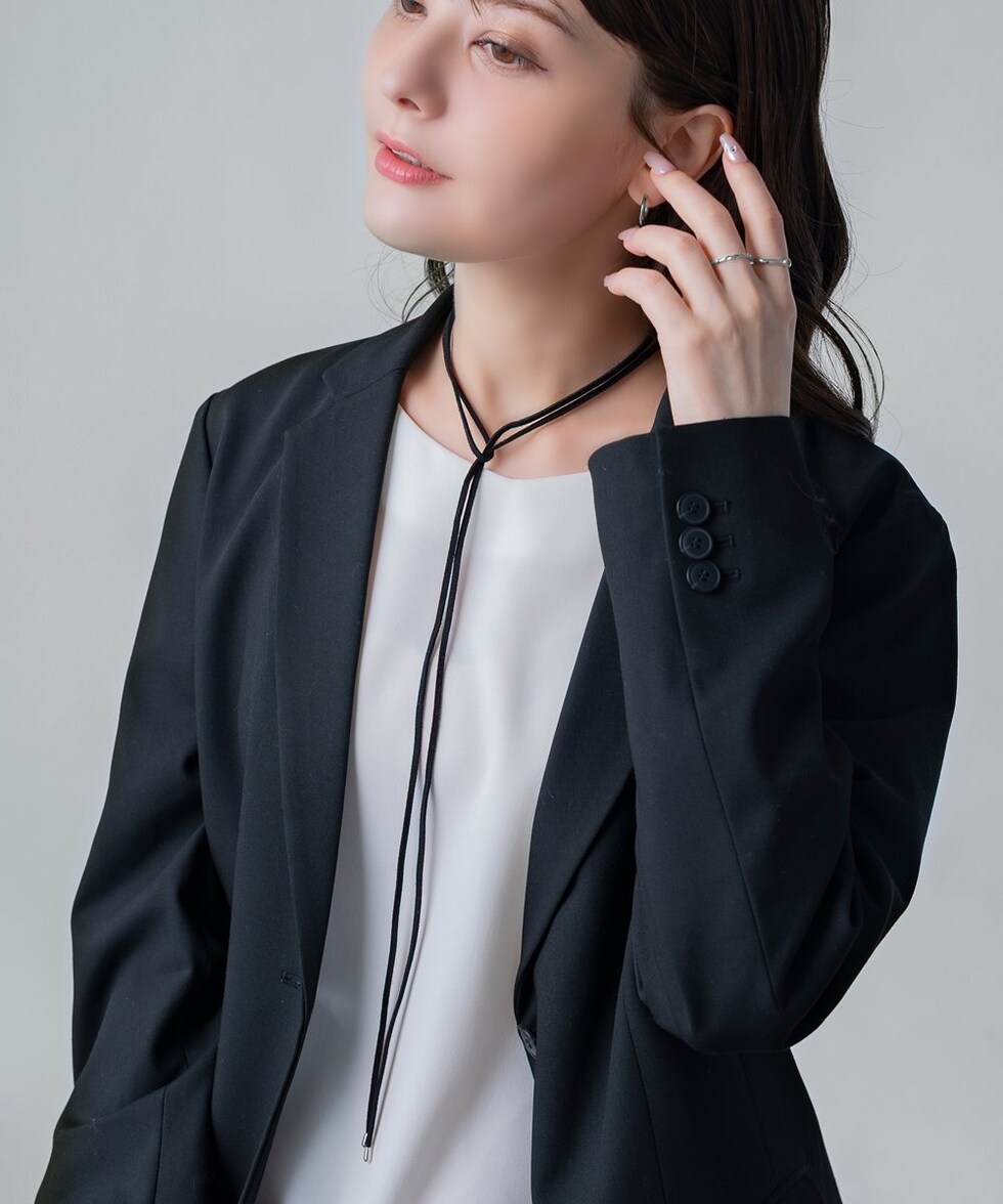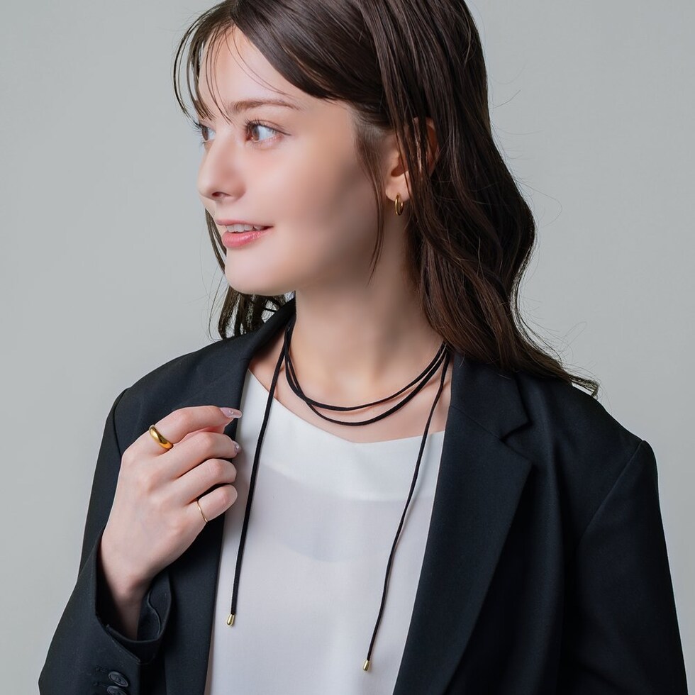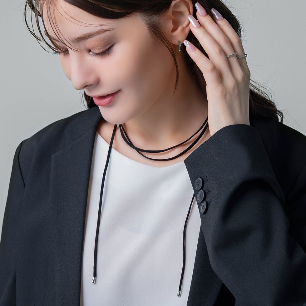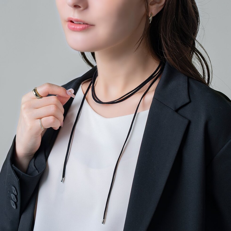 色々な付け方が楽しめるブラックコードのロングチョーカー。首元に巻きつけるだけでも旬の雰囲気になり、トレンド感溢れる印象に◎リボン結びにしたり二重に巻き付けたり、結び方次第でマルチなスタイリングがお楽しみいただけるアイテムです。