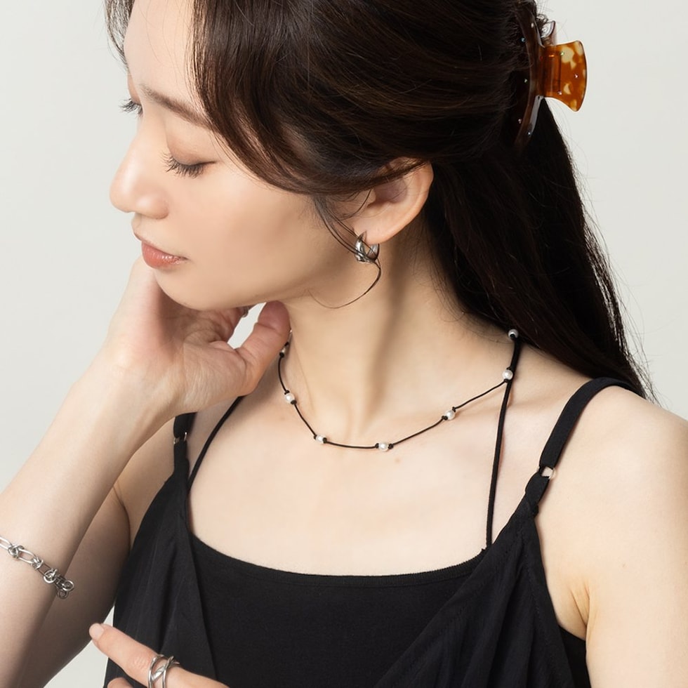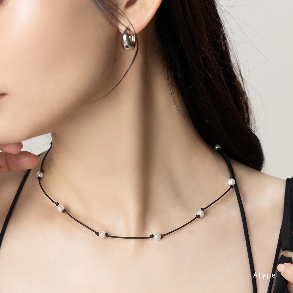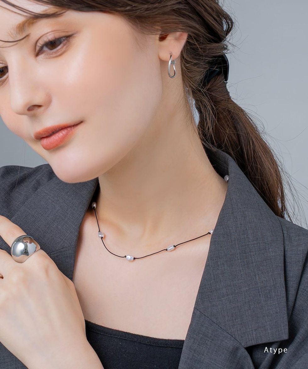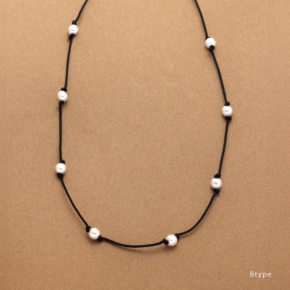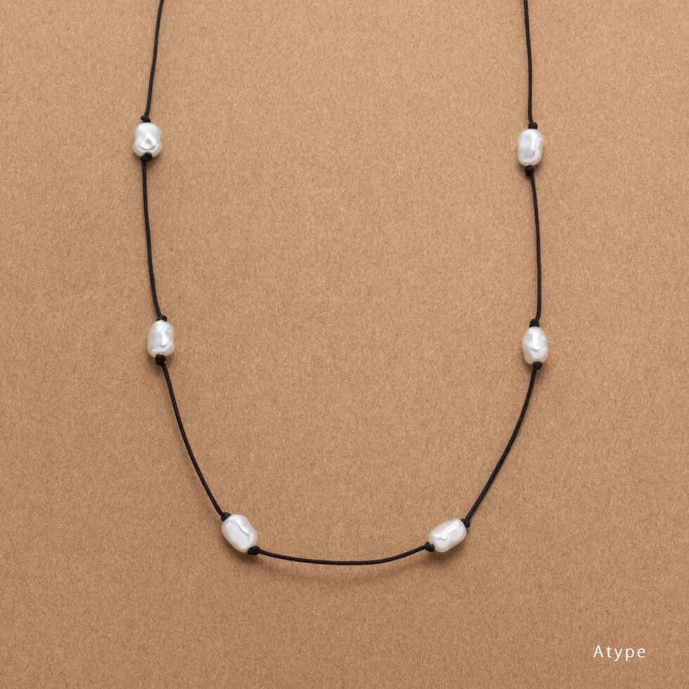 2typeから選べる、ステーションパールとコードのネックレス。留め具部分は錆びにくいステンレス製&着脱簡単なマグネットタイプでデイリーに活躍間違いナシ◎ブラックカラーのコード使いでカッチリしすぎずカジュアルにもキレイめにも使える絶妙デザインです。