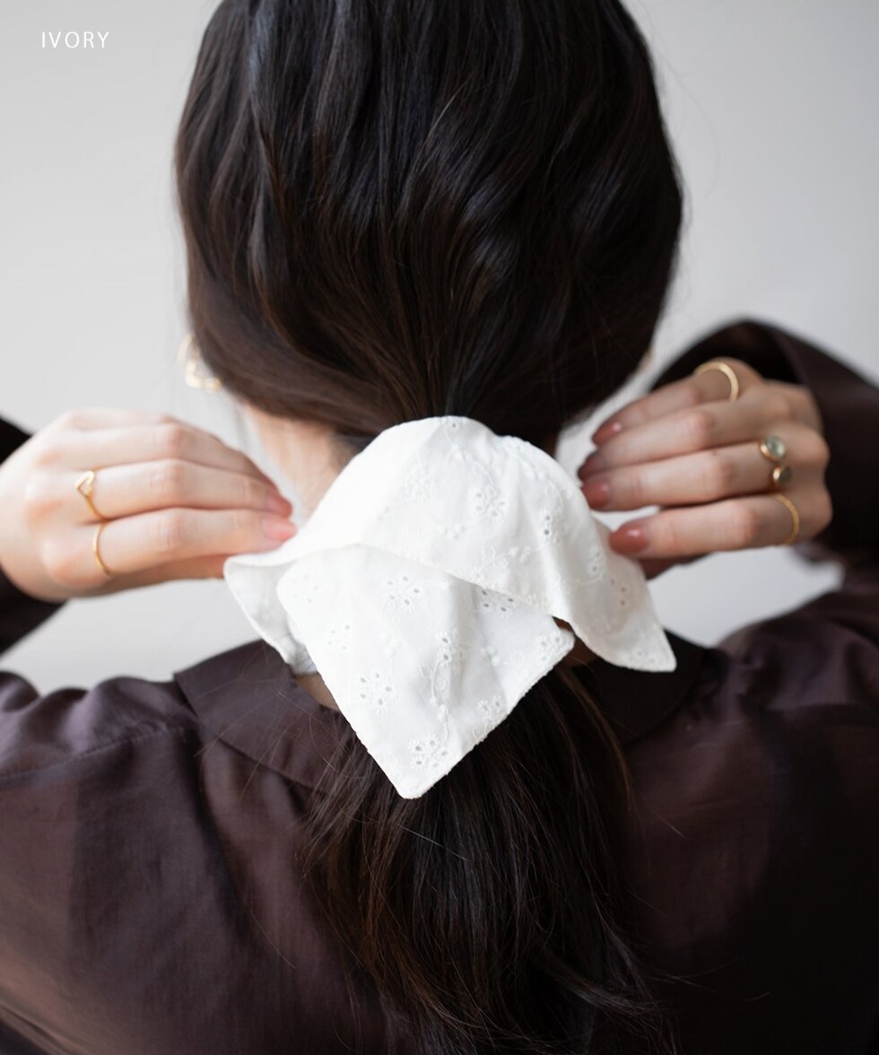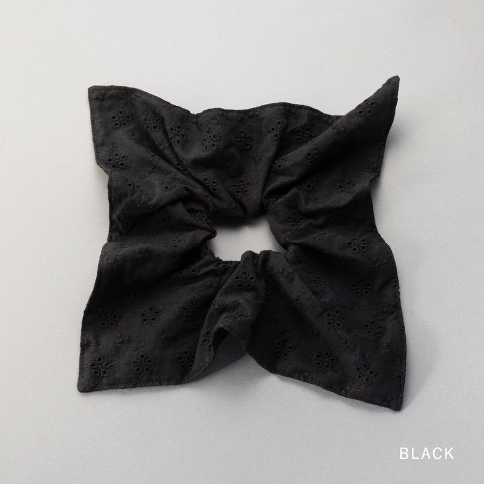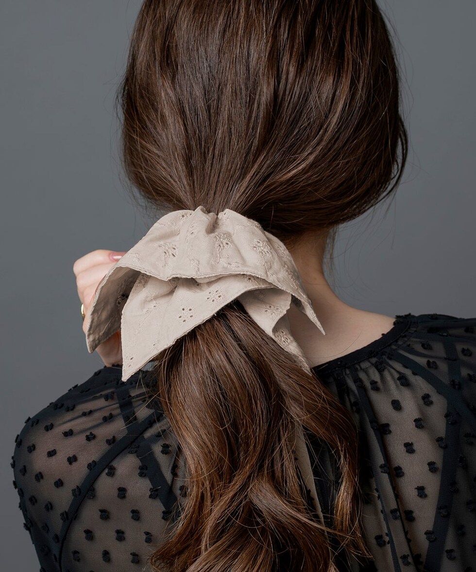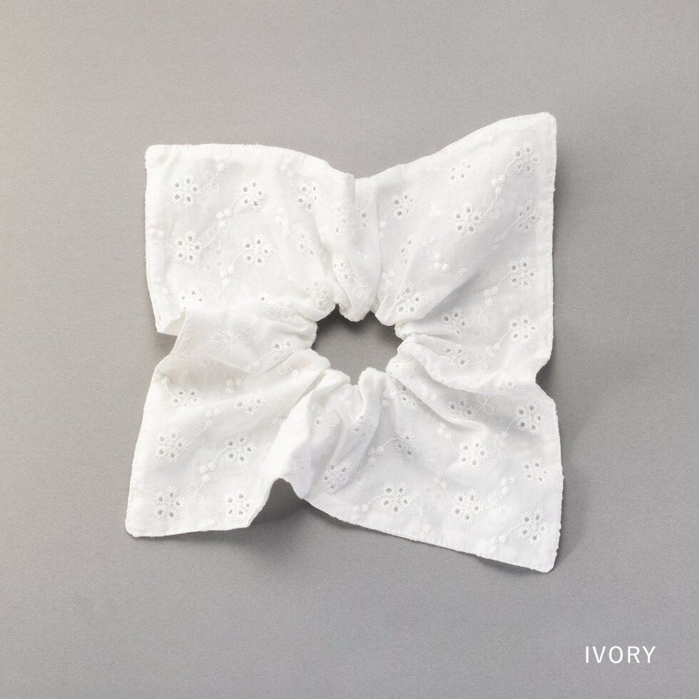 こなれたシルエットに仕上がるスクエアシュシュ。さりげない花柄の刺繍と涼しげな素材感でシーズンライクな雰囲気に◎ボリュームのあるフォルムが、コーデにアクセントを添えてくれるひと品。