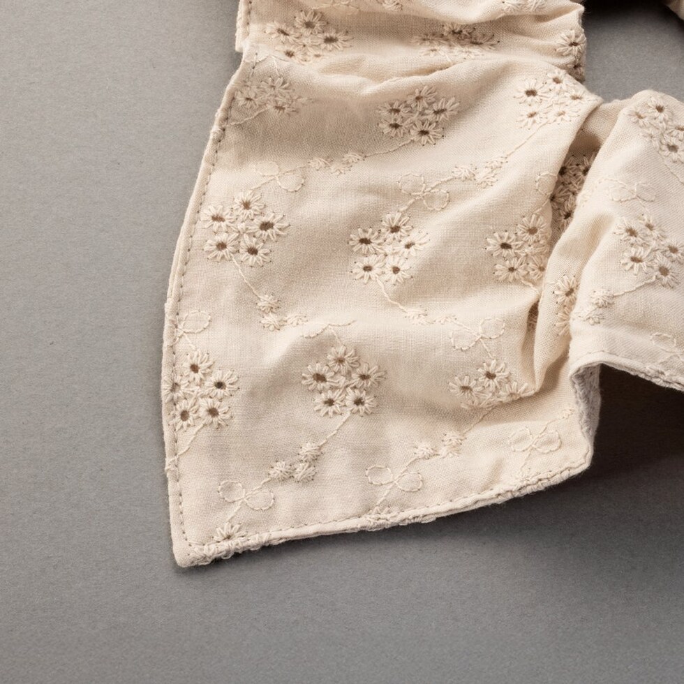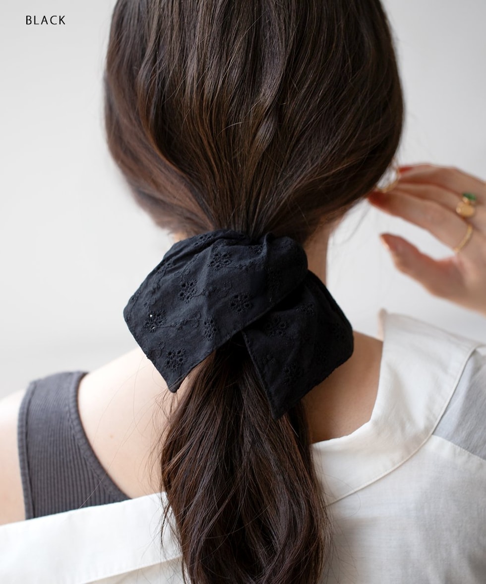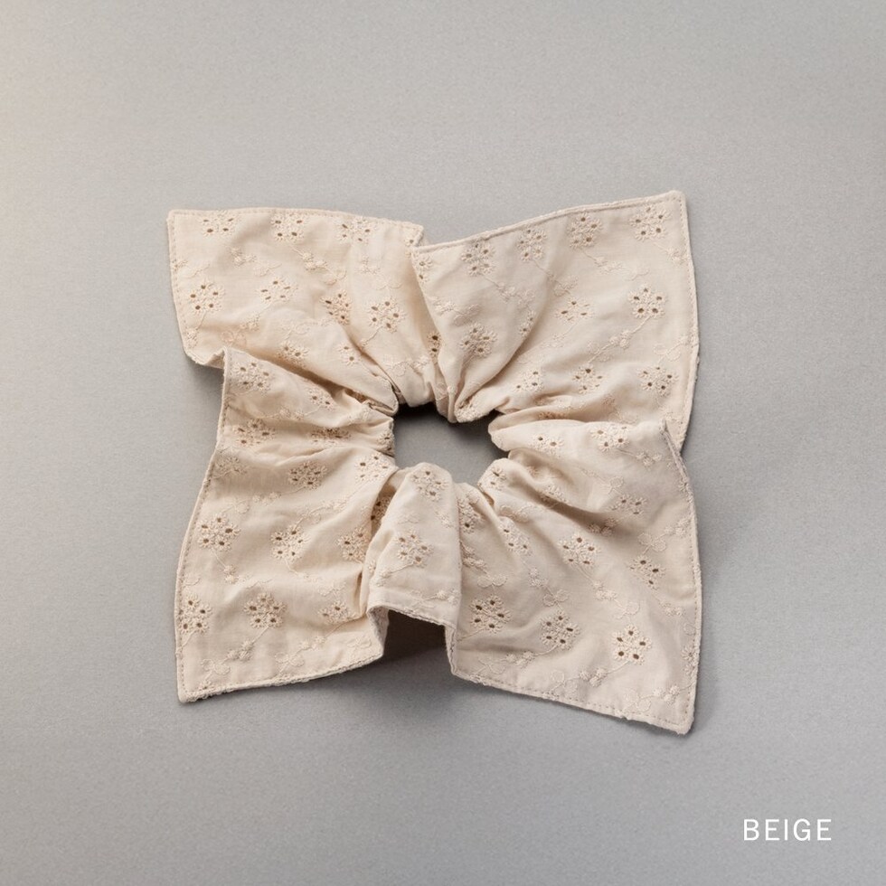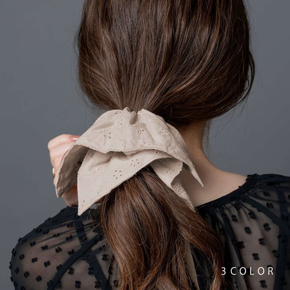 こなれたシルエットに仕上がるスクエアシュシュ。さりげない花柄の刺繍と涼しげな素材感でシーズンライクな雰囲気に◎ボリュームのあるフォルムが、コーデにアクセントを添えてくれるひと品。