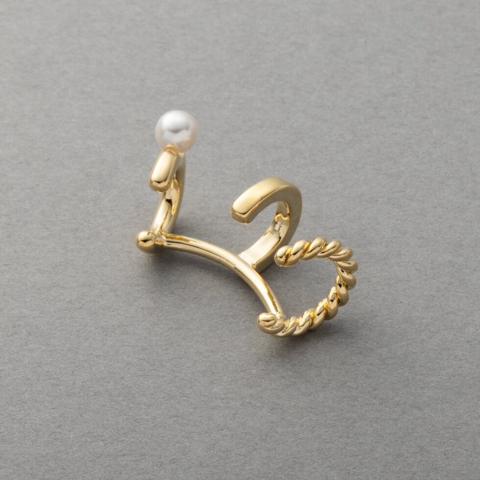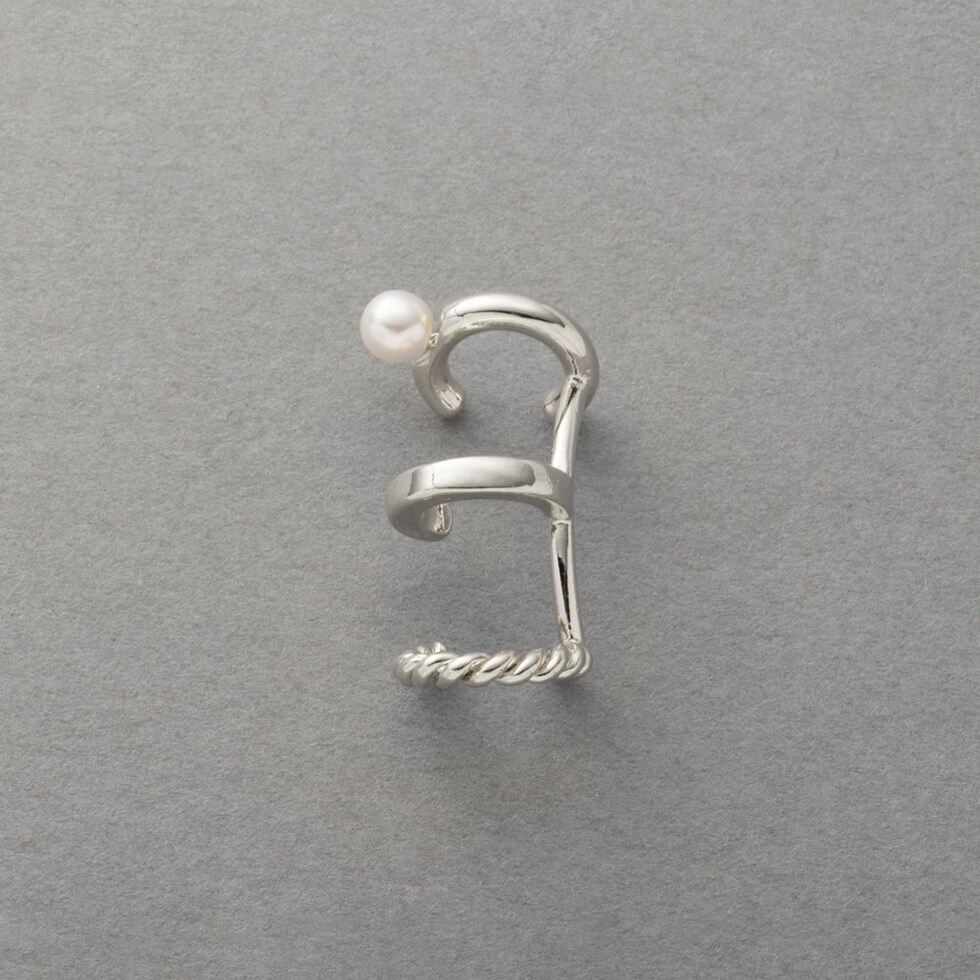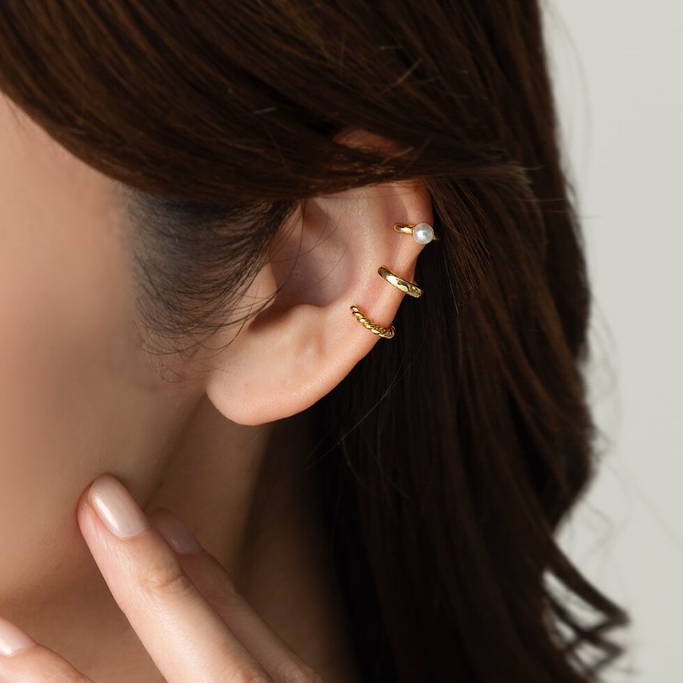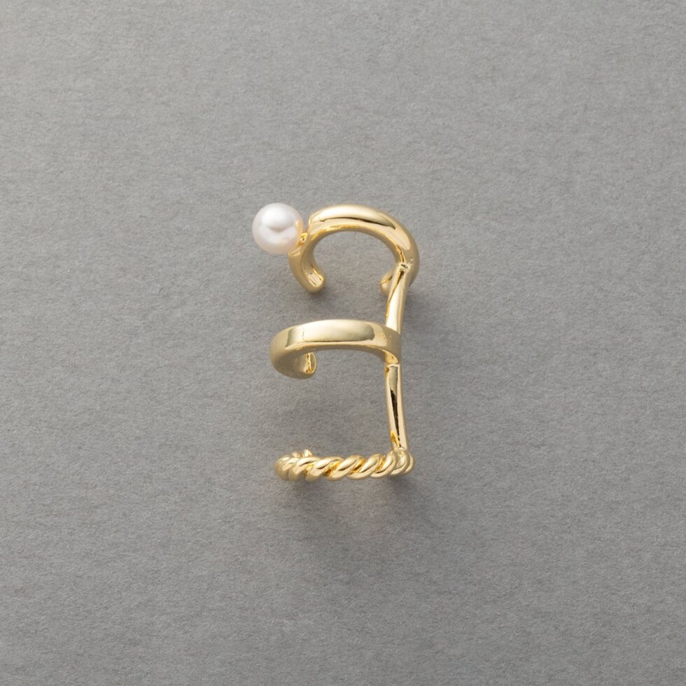 ツイストやパールを飾った3連レイヤード風メタルの片耳用イヤーカフ。着用した際にさりげなく重ね着けしたようなデザインが、こなれた雰囲気を演出します。シンプルコーデのアクセント使いにピッタリなアイテムです◎