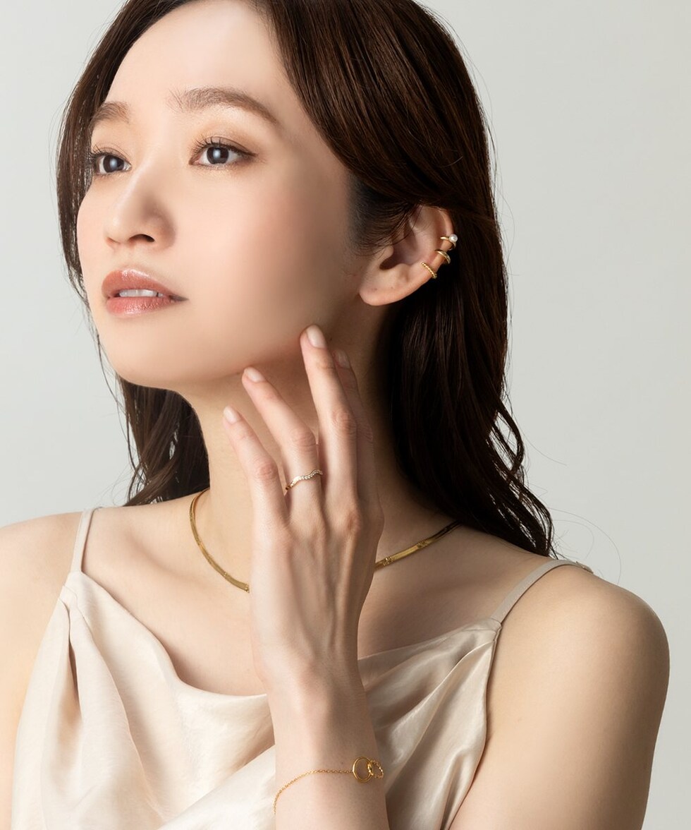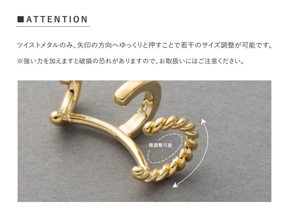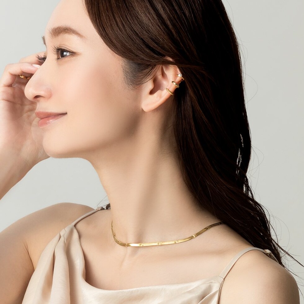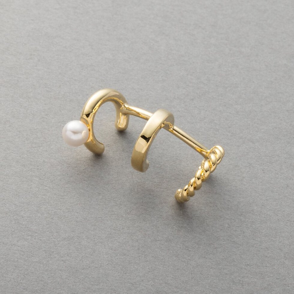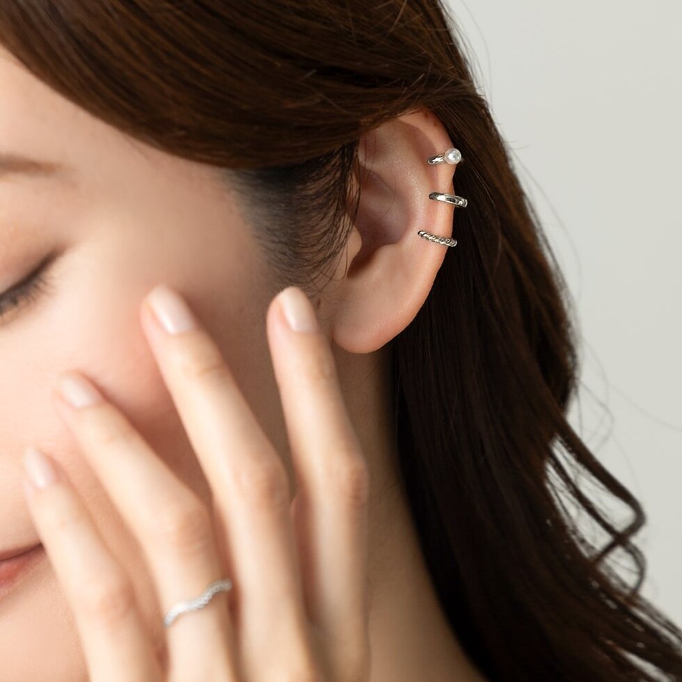 ツイストやパールを飾った3連レイヤード風メタルの片耳用イヤーカフ。着用した際にさりげなく重ね着けしたようなデザインが、こなれた雰囲気を演出します。シンプルコーデのアクセント使いにピッタリなアイテムです◎