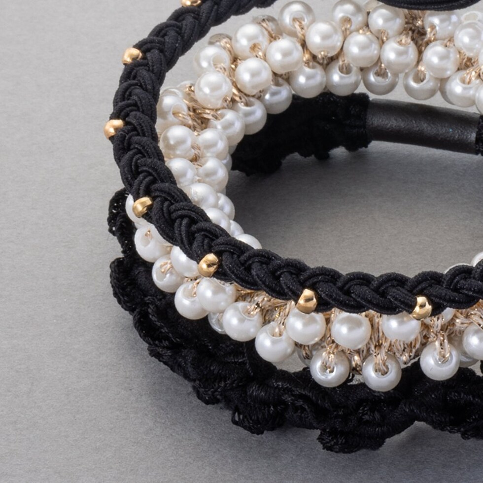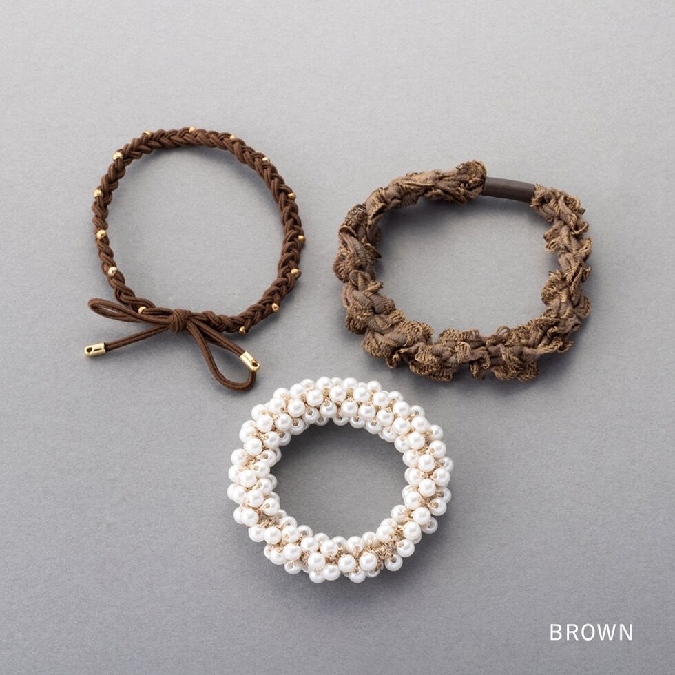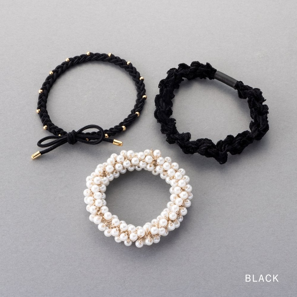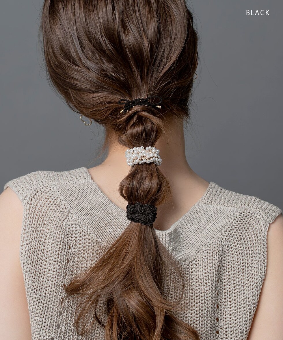 リボン、パール、ミニフリルの3セットヘアゴム。単品使いはもちろん、組み合わせても可愛い使い勝手抜群なデザイン◎アレンジを楽しめるオススメのアイテムです♪