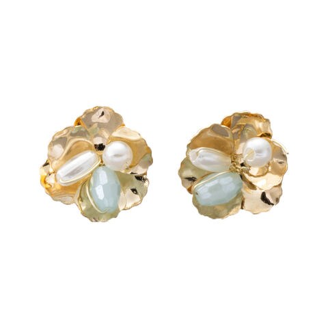 艶めく立体メタルフラワーに、パール/カラービーズを飾った涼しげなスタッドピアス。主張しすぎない程よい大きさで大人コーデのワンポイントとして活躍しそう◎