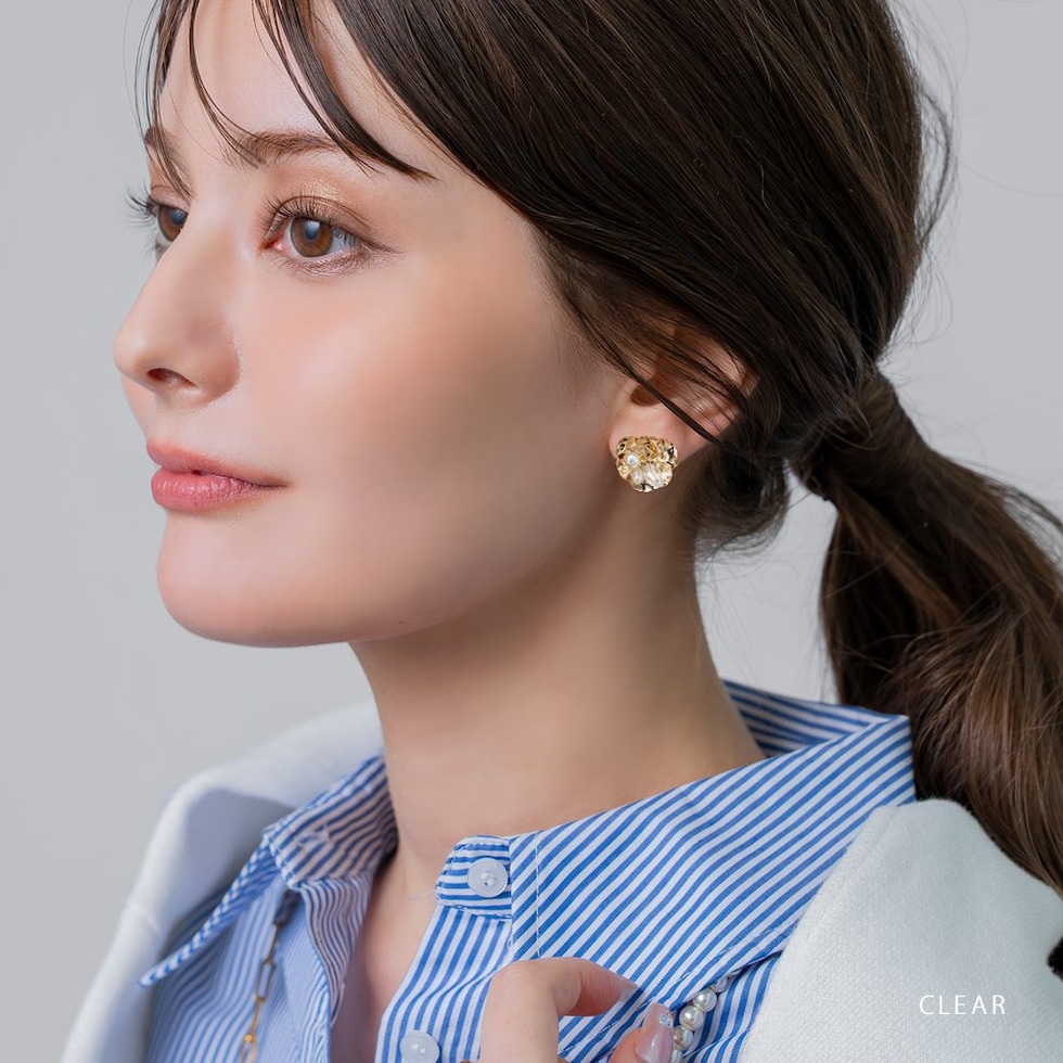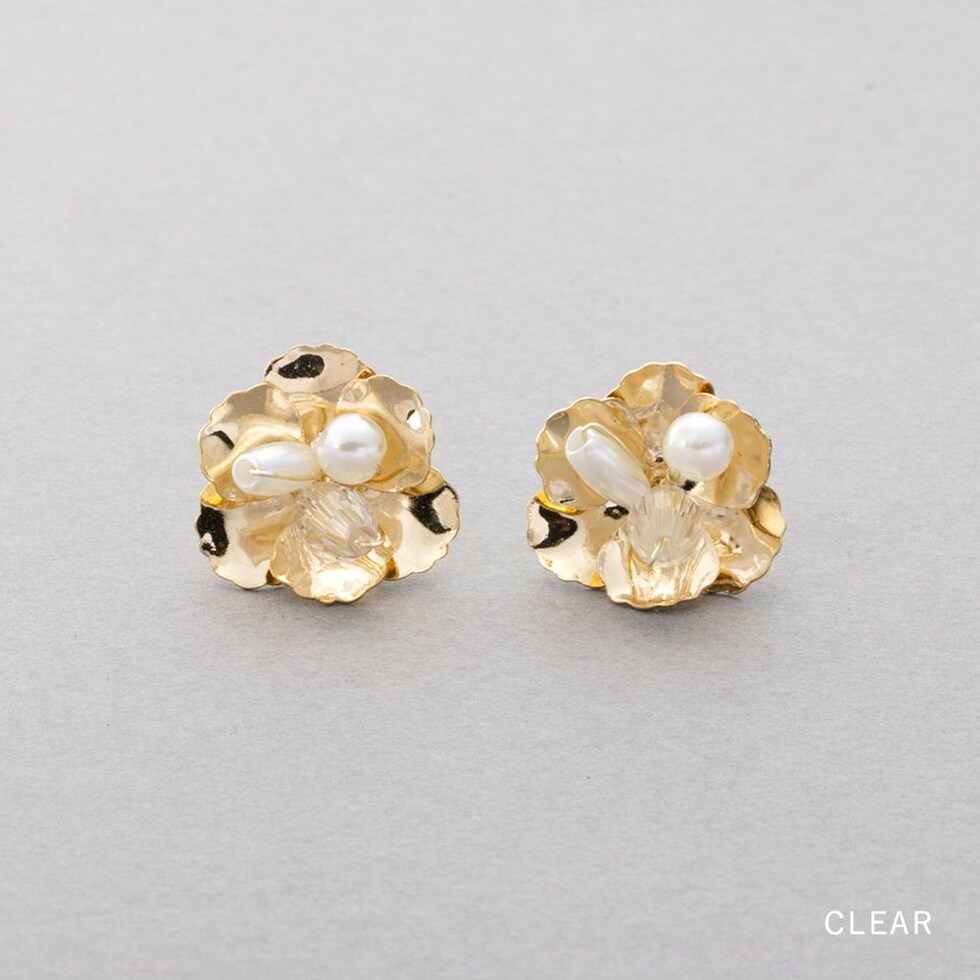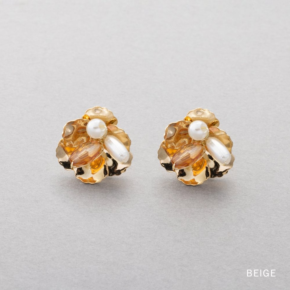 艶めく立体メタルフラワーに、パール/カラービーズを飾った涼しげなスタッドピアス。主張しすぎない程よい大きさで大人コーデのワンポイントとして活躍しそう◎