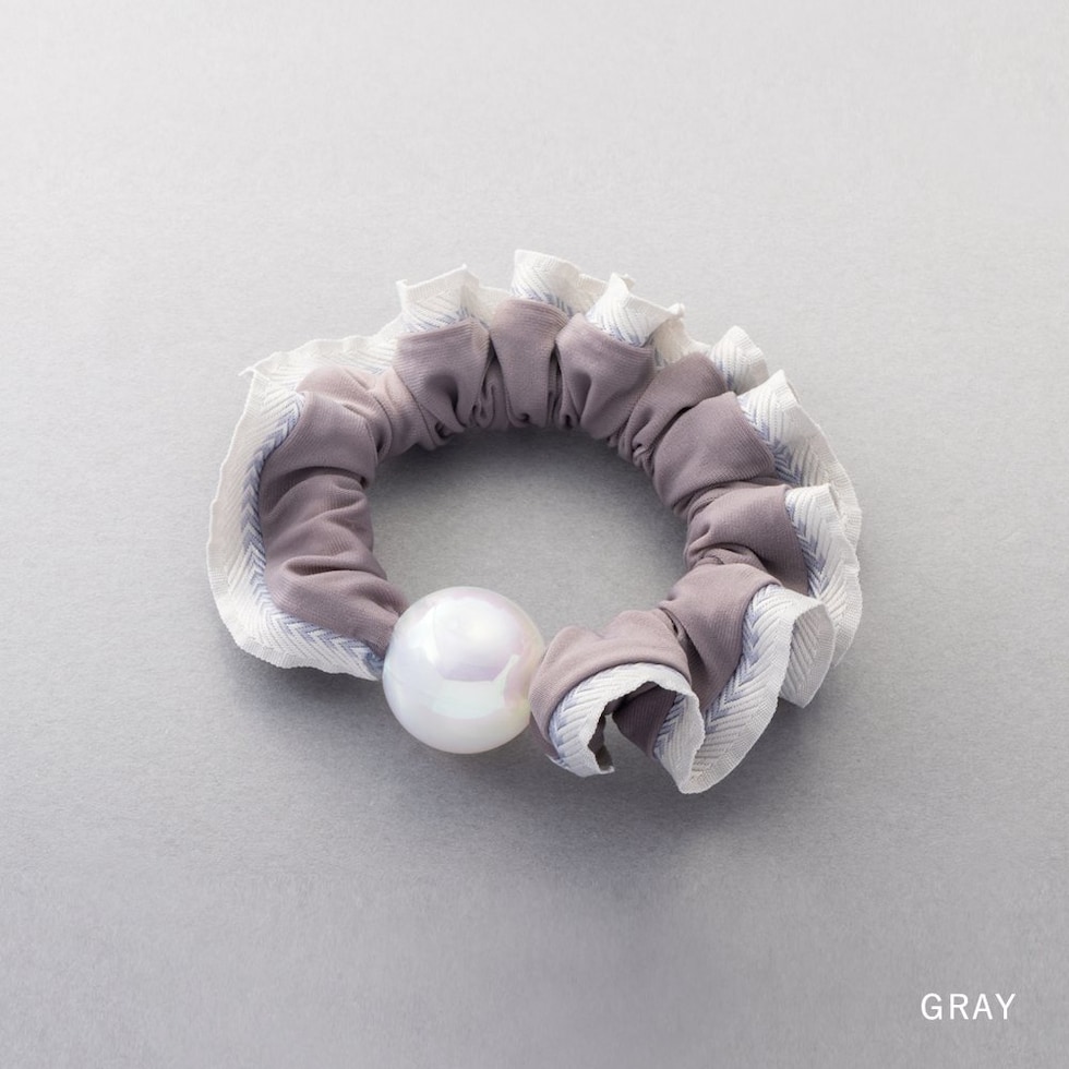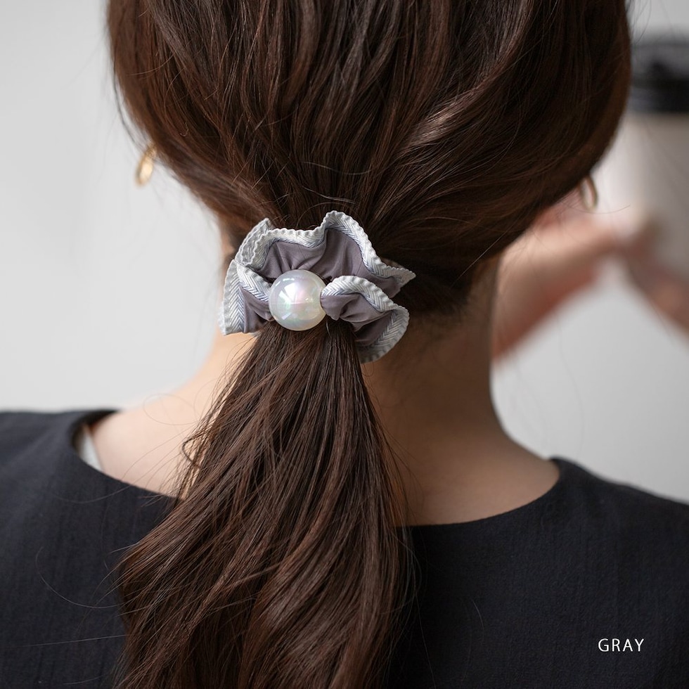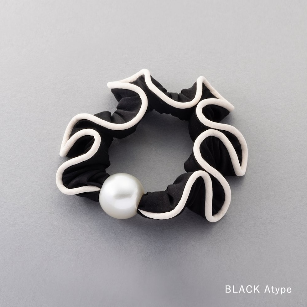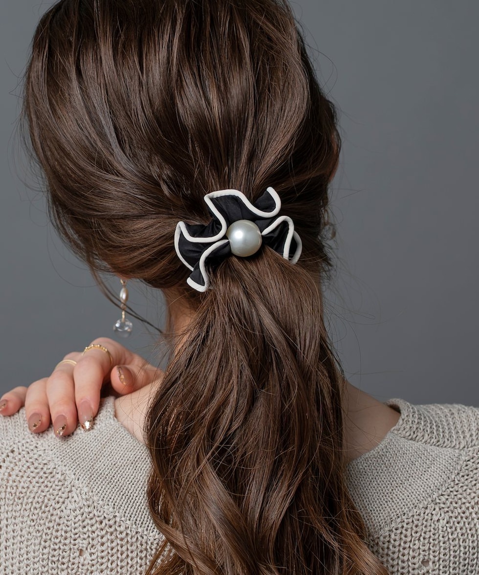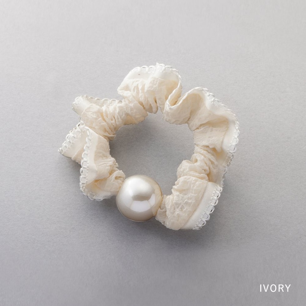 艶めく大きめパールと波打つようなフリルが大人可愛いシュシュ。波型レースや切り替えリボンなどアクセントとして取り入れやすいデザインをご用意しました。立体感あるシルエットとフリルデザインが後ろ姿を華やかに演出してくれます。