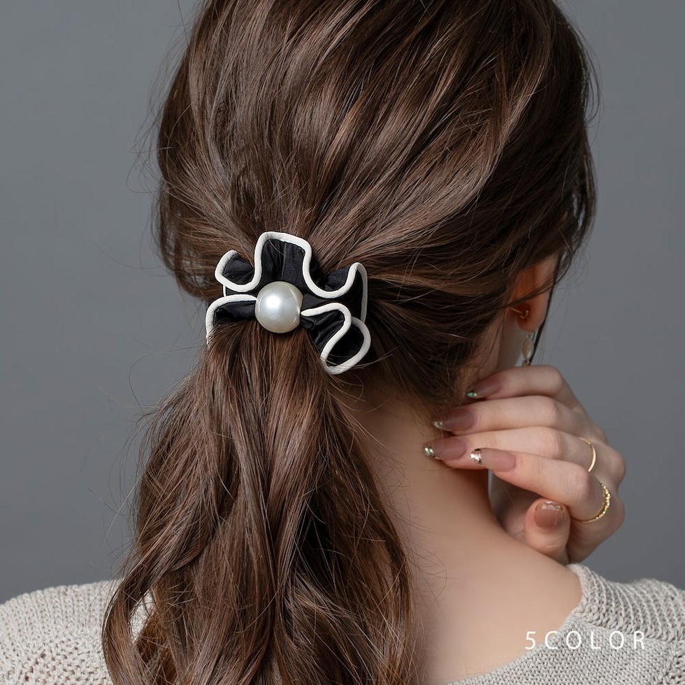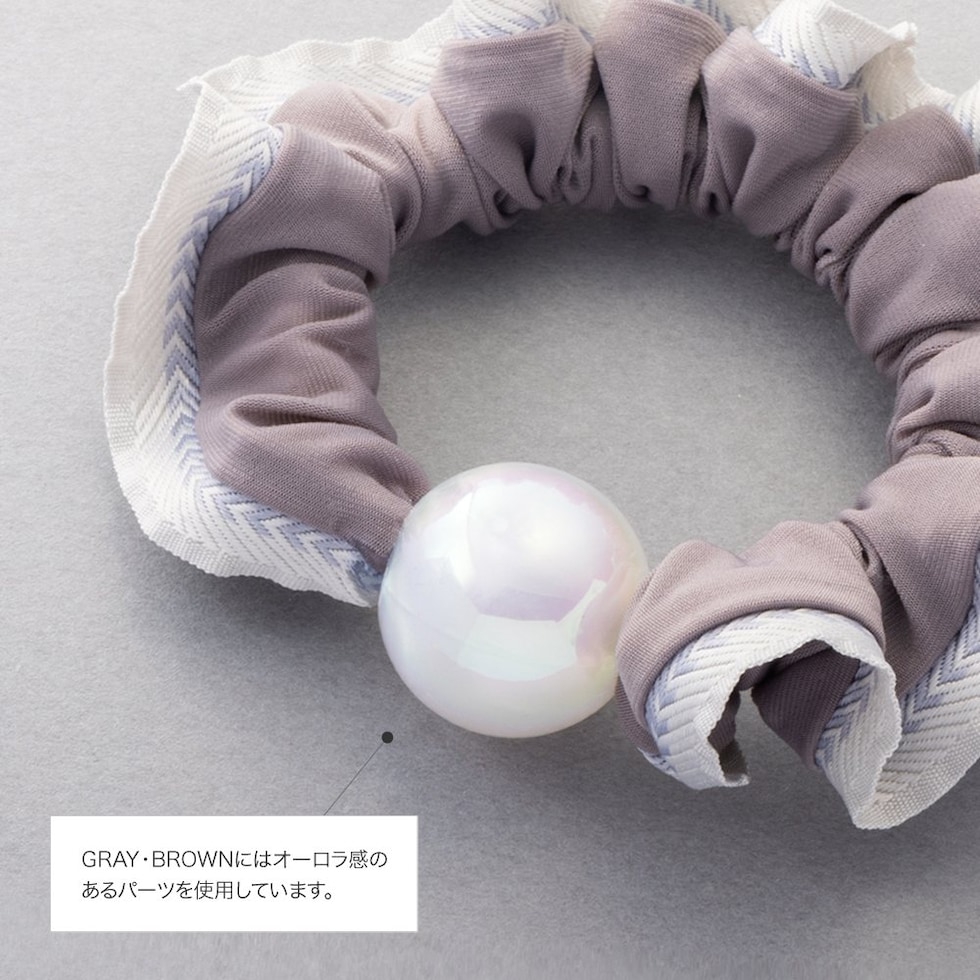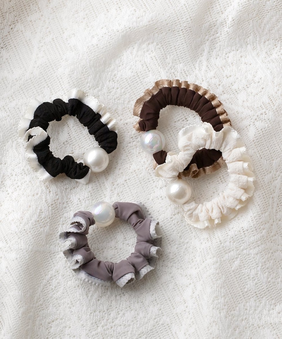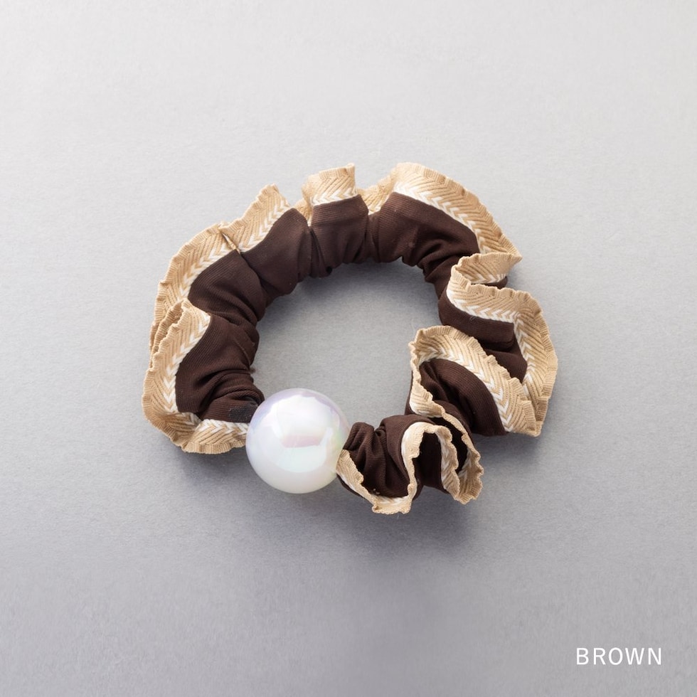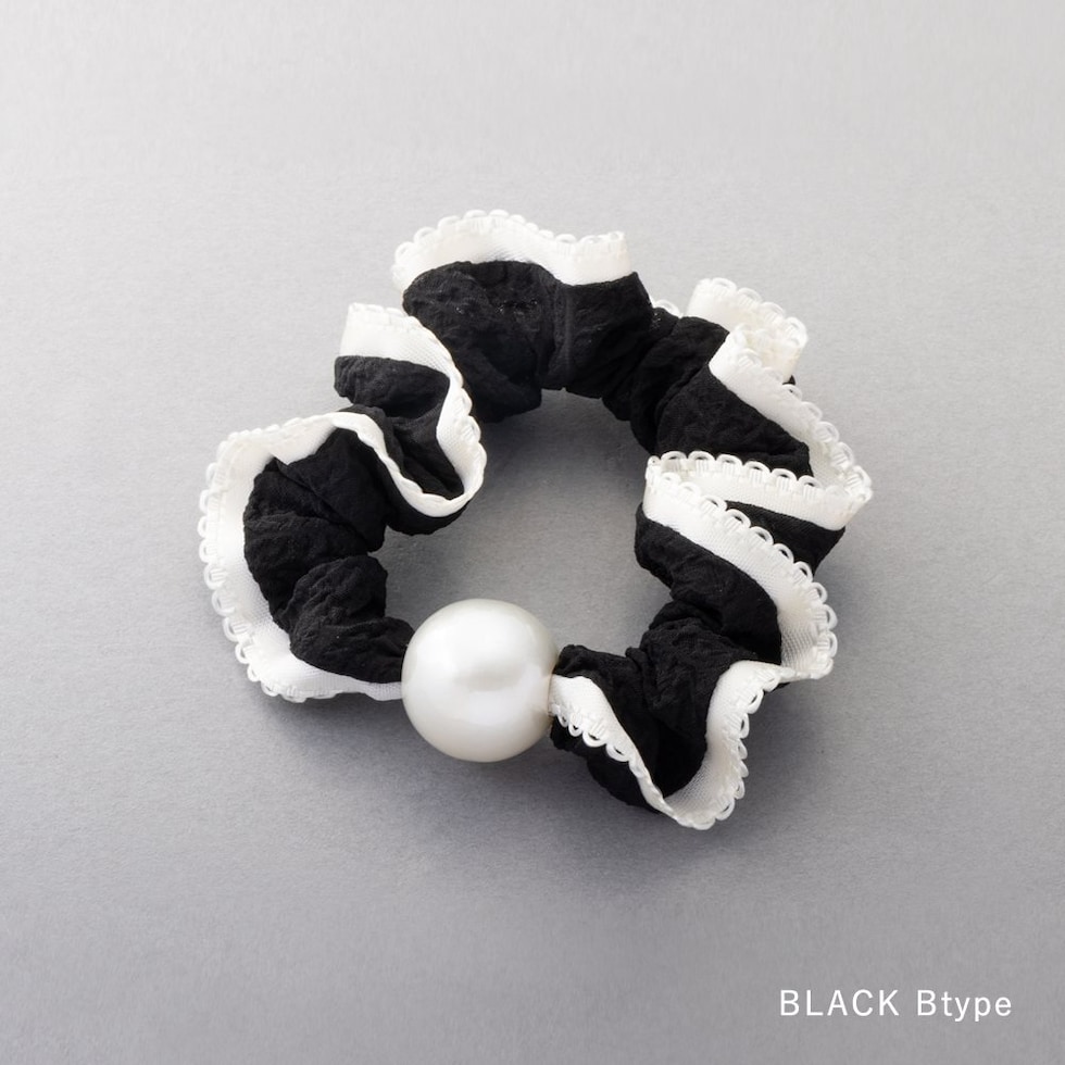 艶めく大きめパールと波打つようなフリルが大人可愛いシュシュ。波型レースや切り替えリボンなどアクセントとして取り入れやすいデザインをご用意しました。立体感あるシルエットとフリルデザインが後ろ姿を華やかに演出してくれます。