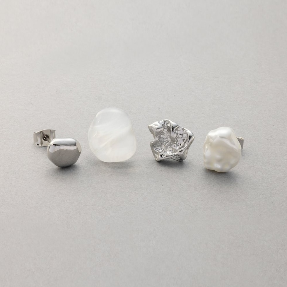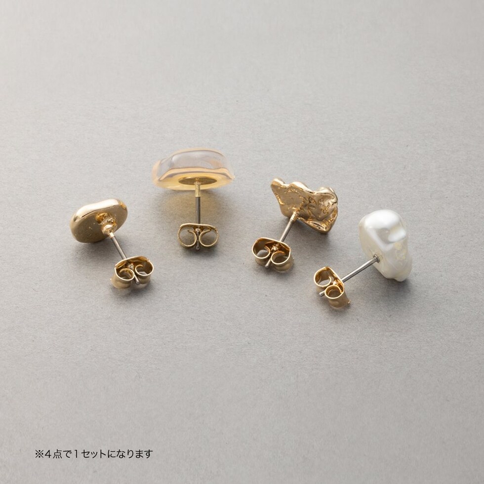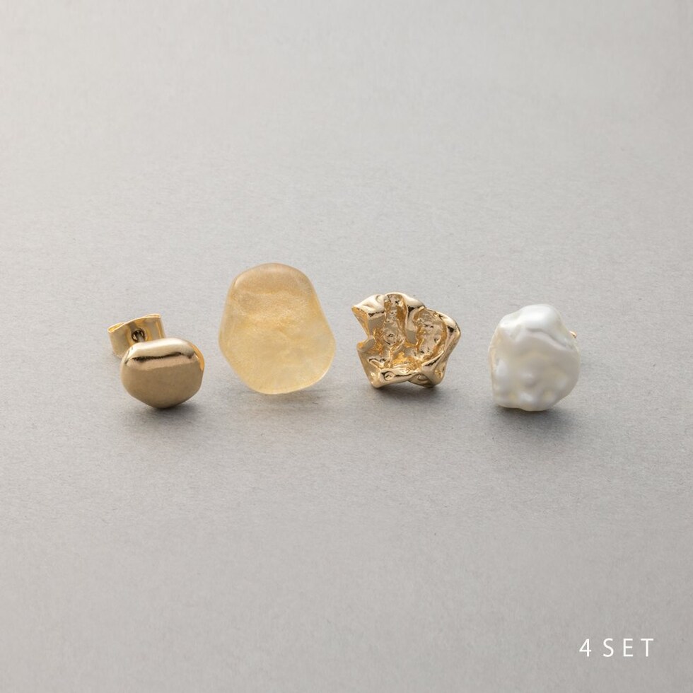 一つ一つデザインが異なる4点セットスタッドピアス。使いやすいサイズ感の歪メタル、クリアカラーストーンや凹凸メタル、バロック調パールの4点。それぞれ組み合わせ次第で表情が変わるのでスタイリングやシーンに合わせてお楽しみいただけます。低アレルギーのチタンポストを使用しているので、長時間の着用も安心です。