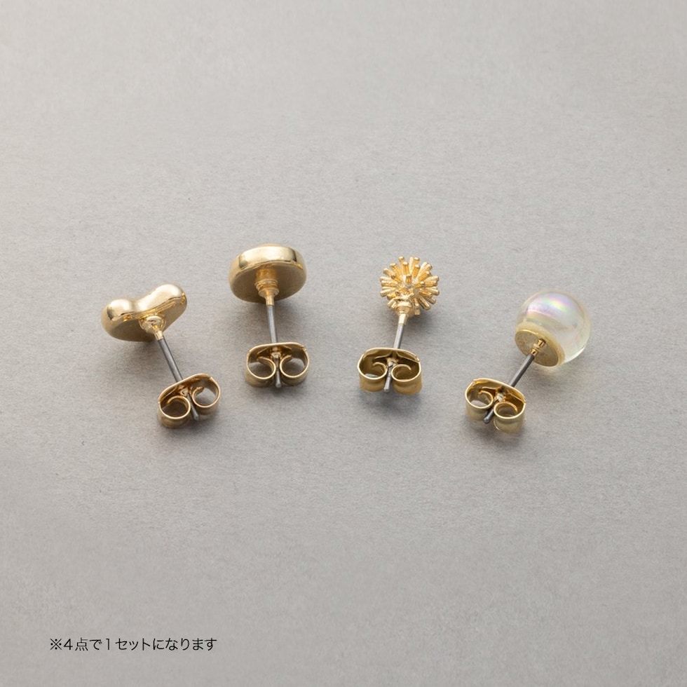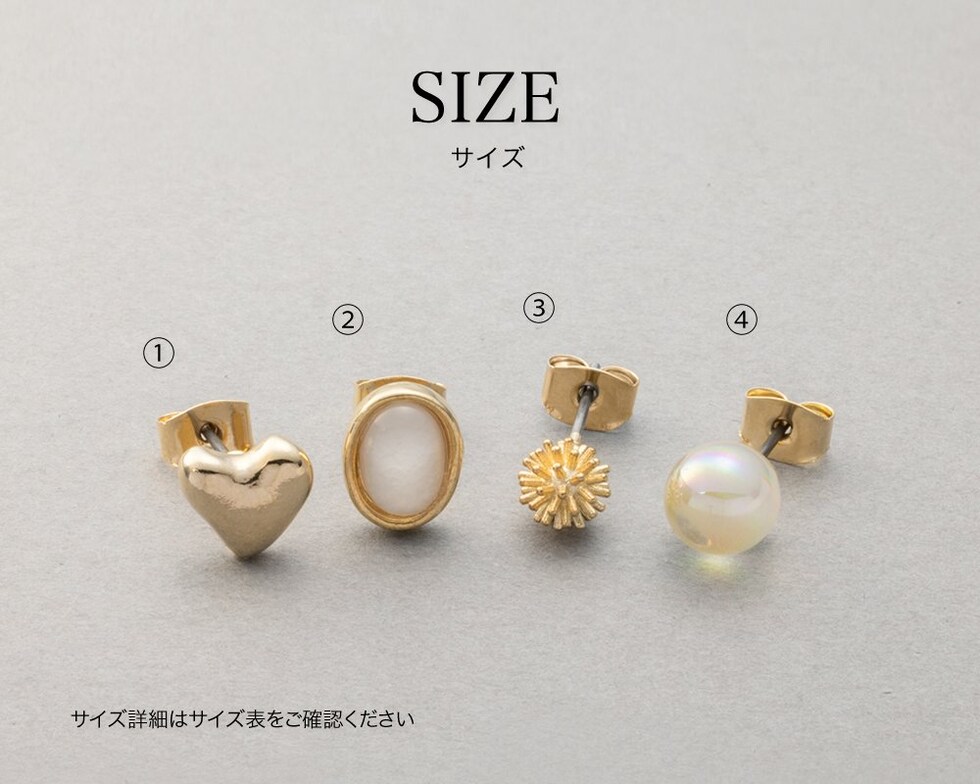 一つ一つデザインが異なる4点セットのスタッドピアス。使いやすいサイズ感の歪ハートモチーフ、ホワイトストーンや立体フラワー、オーロラスフィアの4点。それぞれ組み合わせ次第で表情が変わるのでスタイリングやシーンに合わせてお楽しみいただけます。低アレルギーのチタンポストを使用しているので、長時間の着用も安心です。