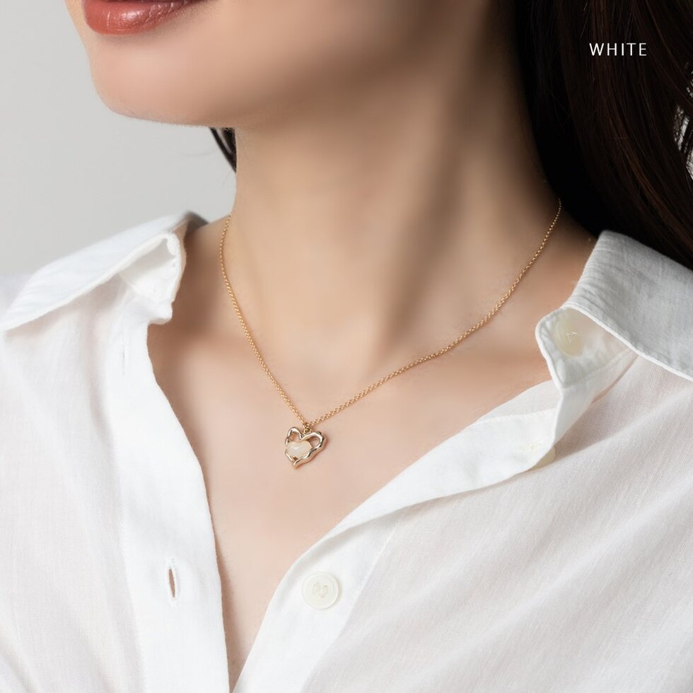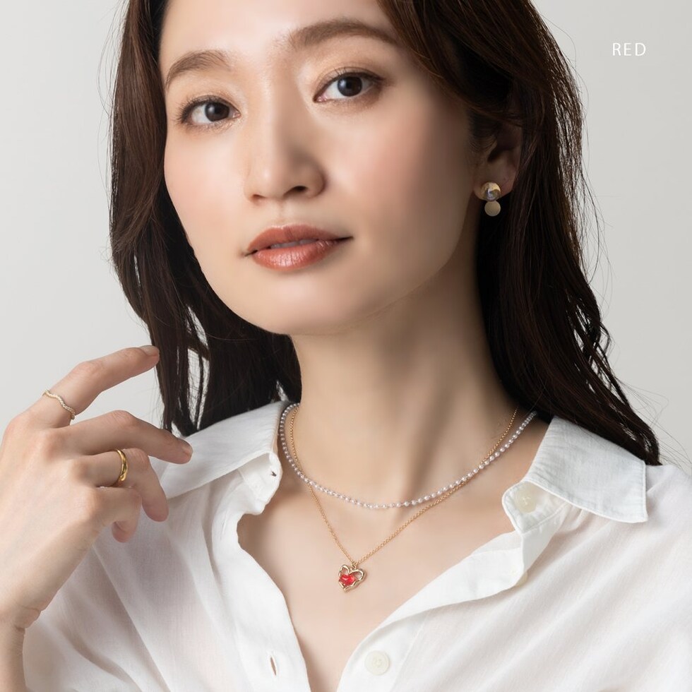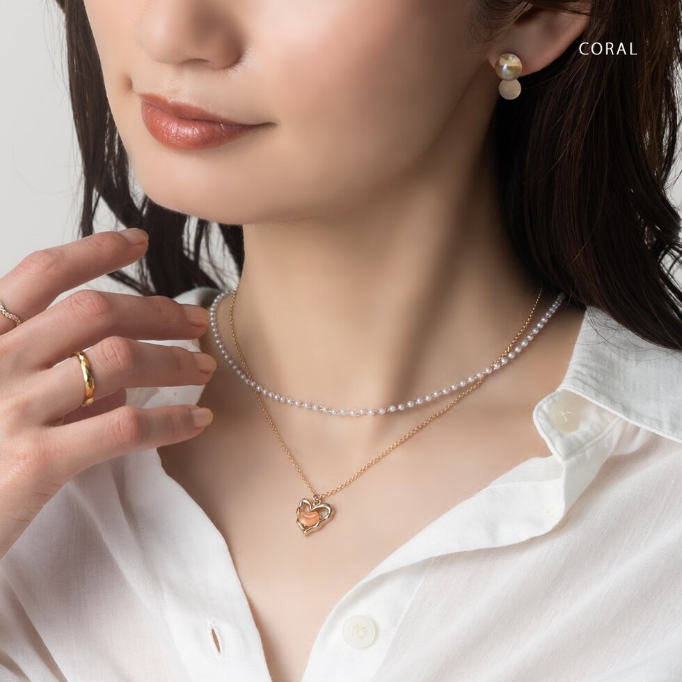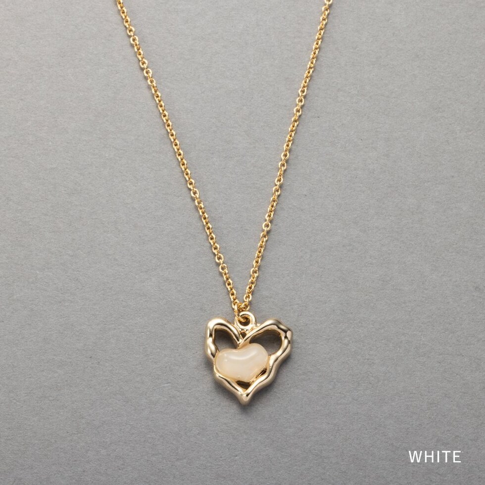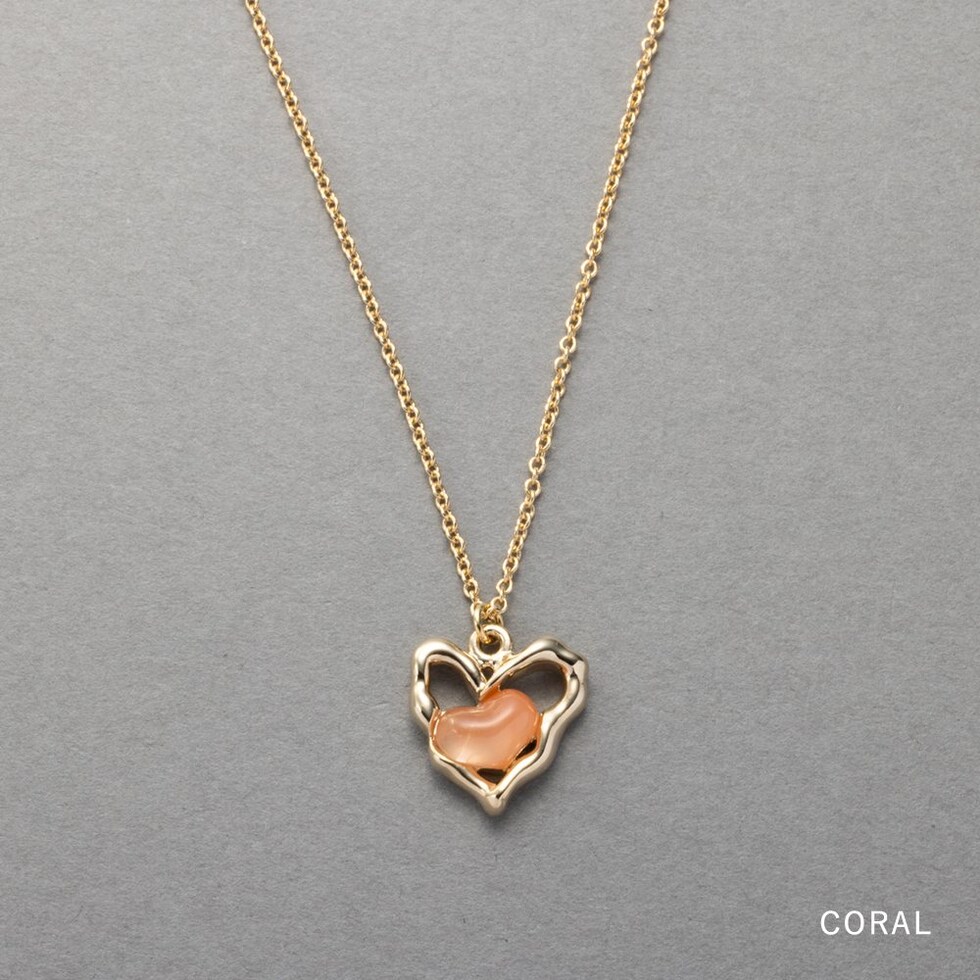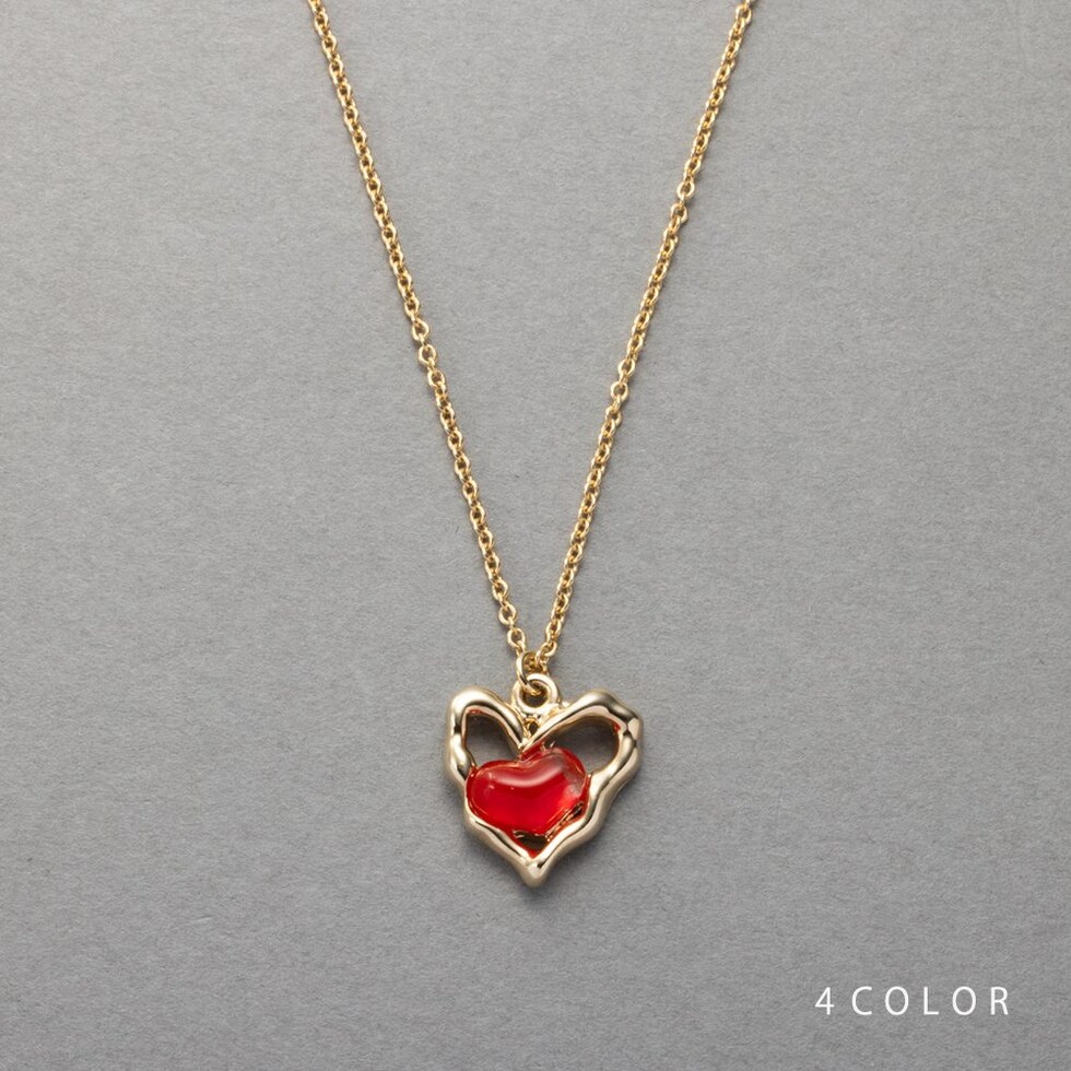 歪なメタルハートフレームにぷっくりとしたハートストーンを組み合わせたネックレス。カラーのハートモチーフが、コーデにエッジの効いたアクセントとこなれた印象を演出してくれます。子供っぽくなりすぎず、大人の女性にも着用いただけるひと品です。