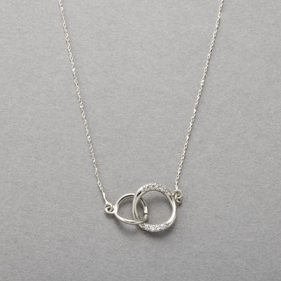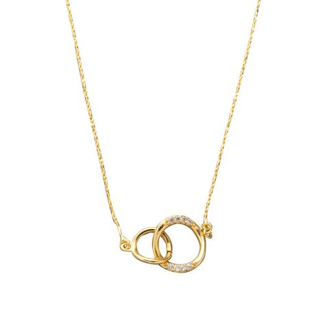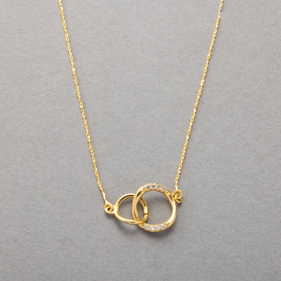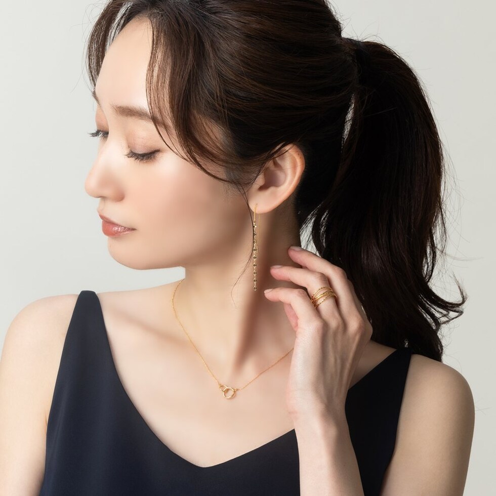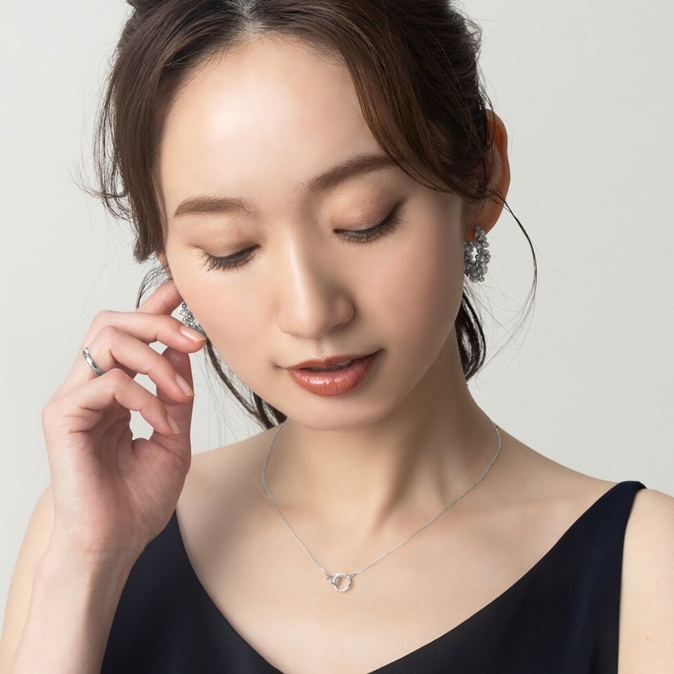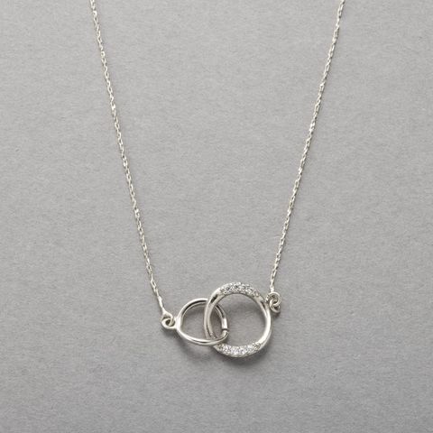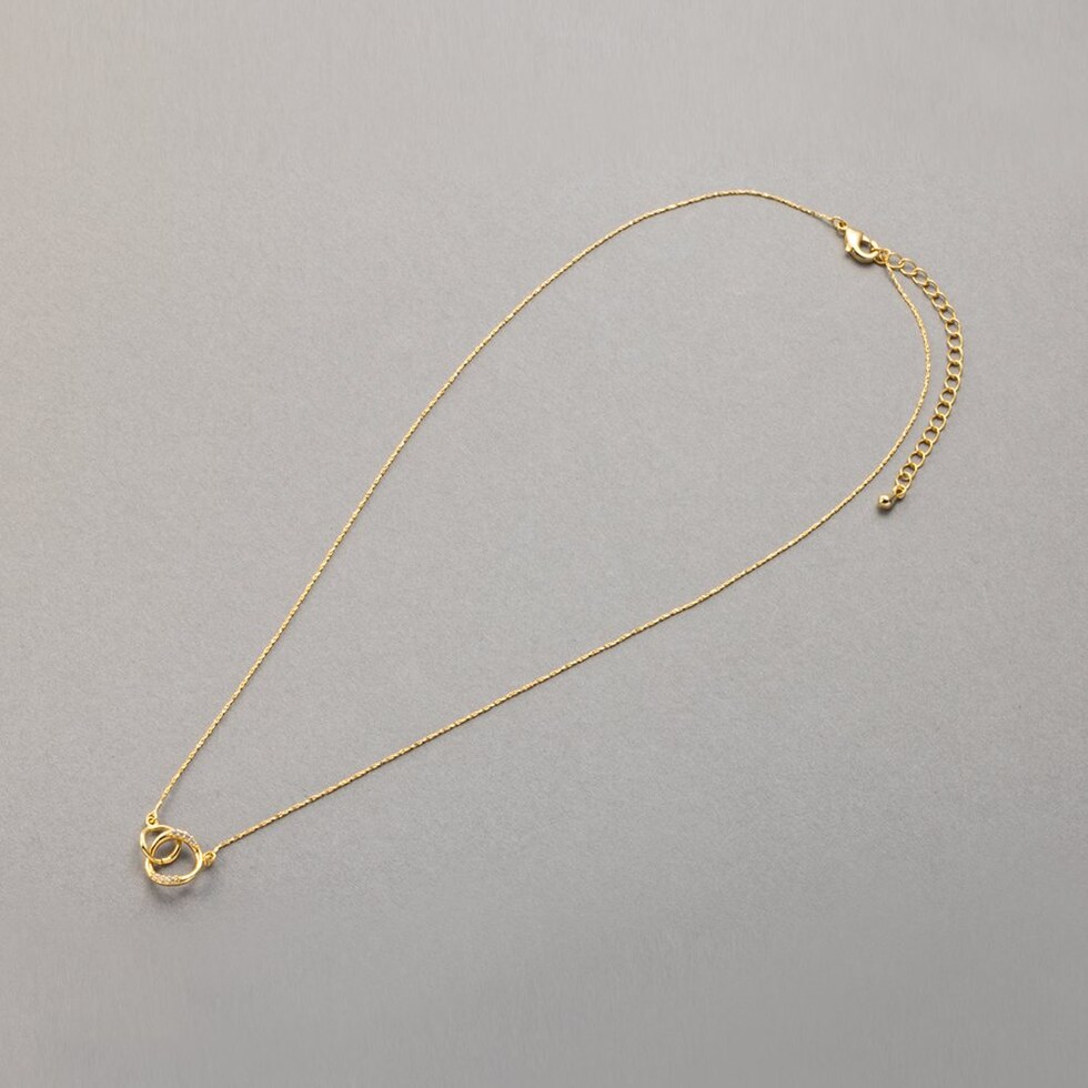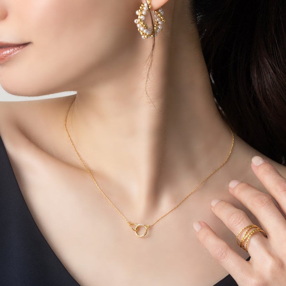 大きさの異なるリングを2つ連ねたネックレス。リングの片方に並べた煌めくビジューがデコルテを美しく引き立てます。華奢なチェーンが繊細な女性らしさを演出◎シンプルなデザインだから、流行に左右されず長くご愛用いただけます。