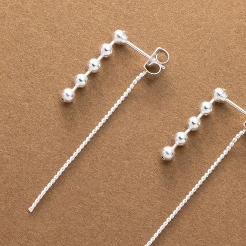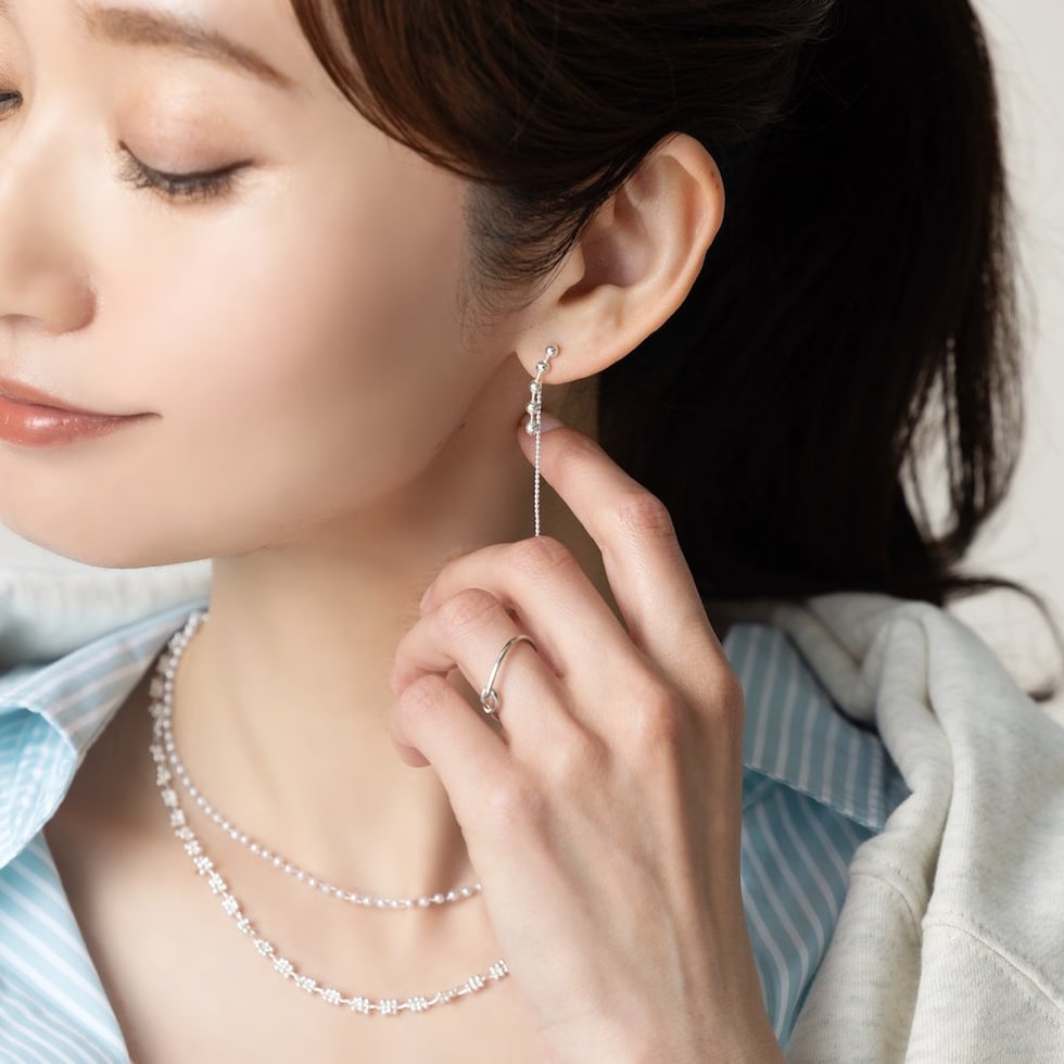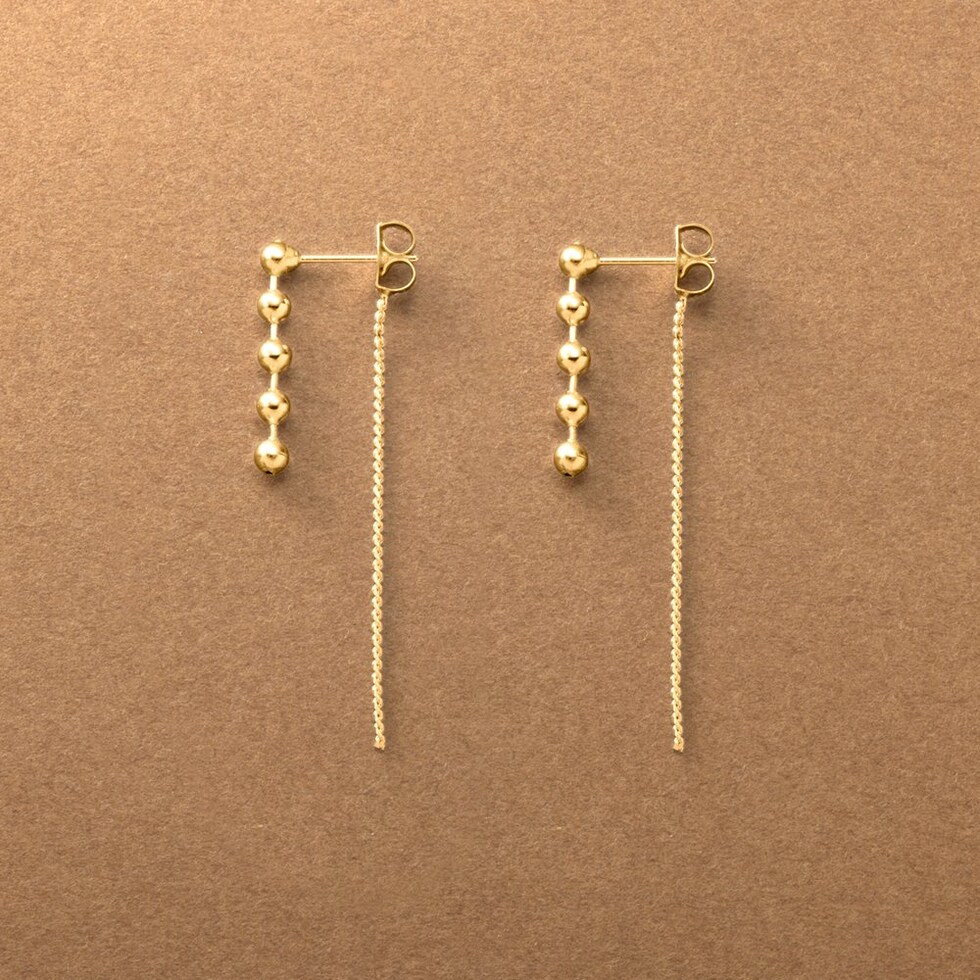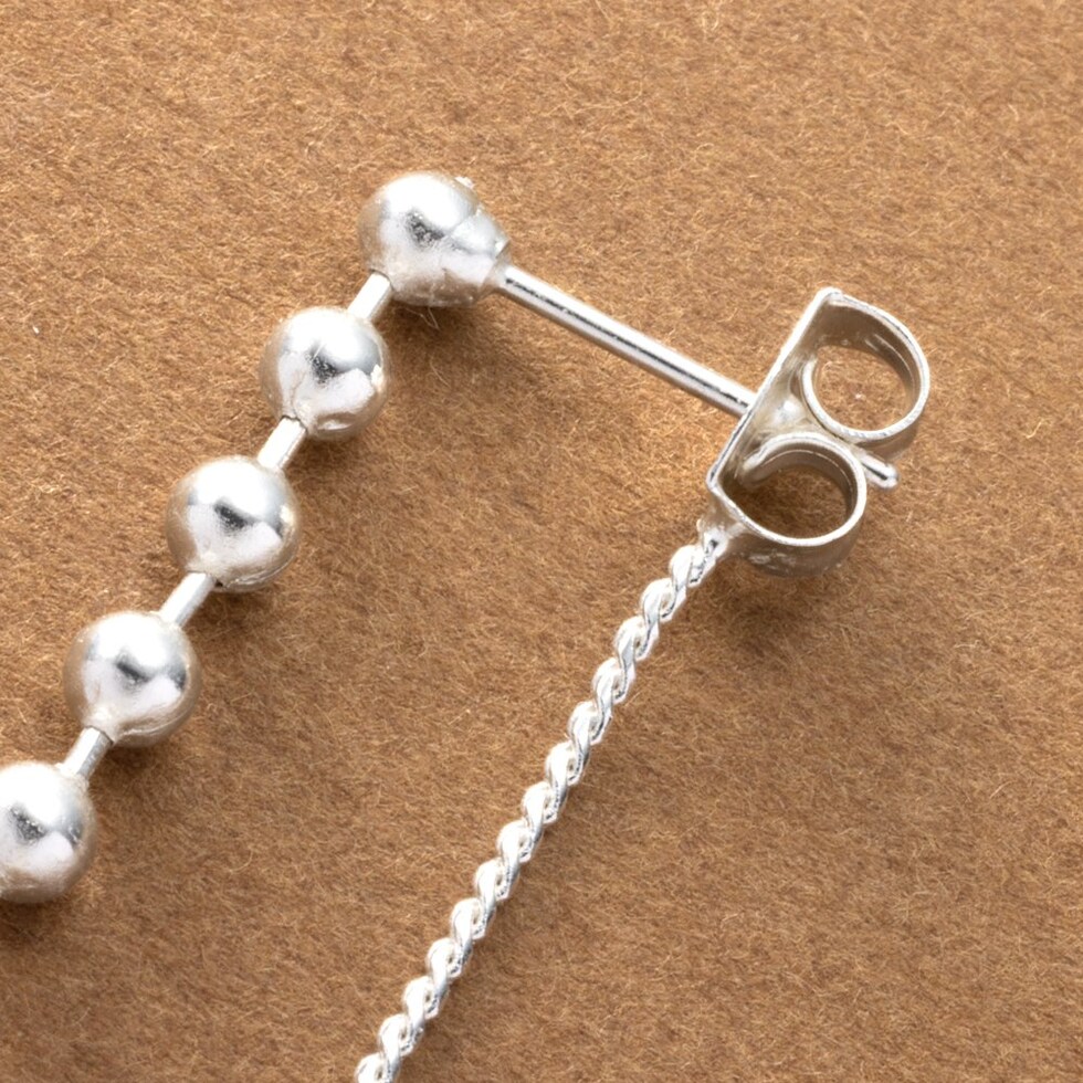 華奢ボールチェーンのバックキャッチピアス。トップには控えめなボールチェーンを、バックキャッチにはとっても華奢なチェーンを垂らした揺れ感ピアスで、縦長ラインが視線を誘うからお顔周りのすっきり見せも期待できちゃいそう◎