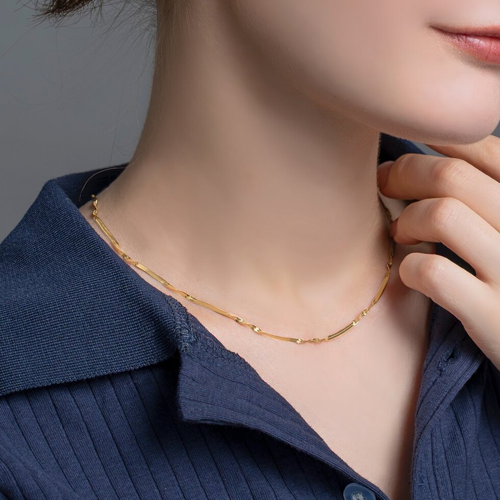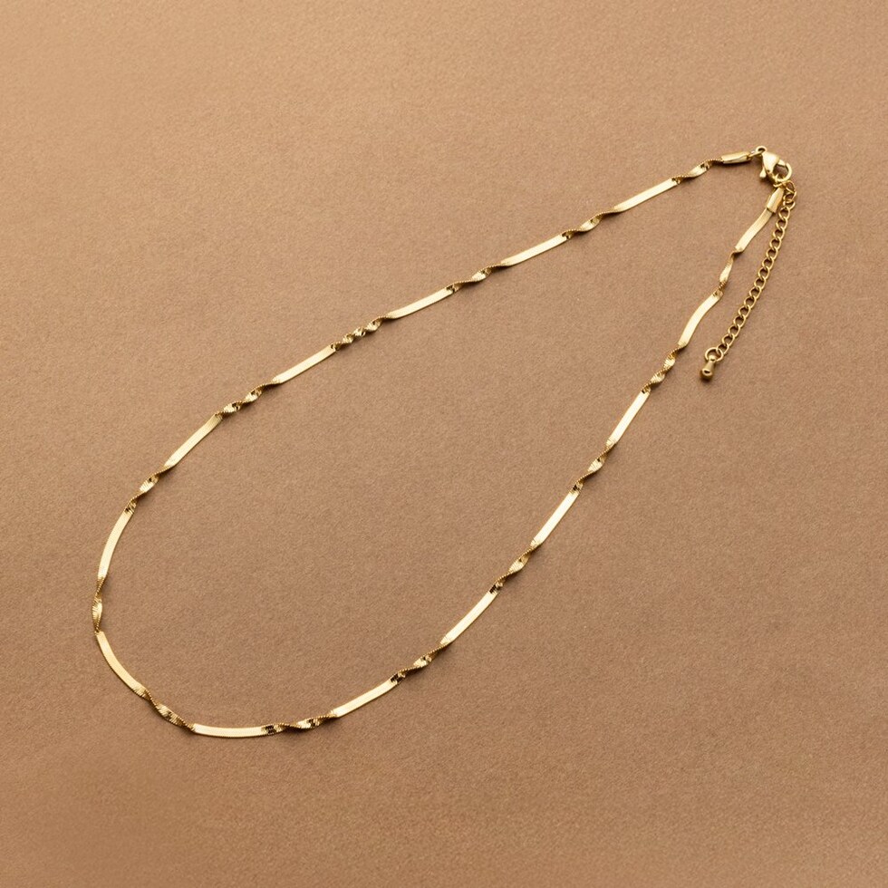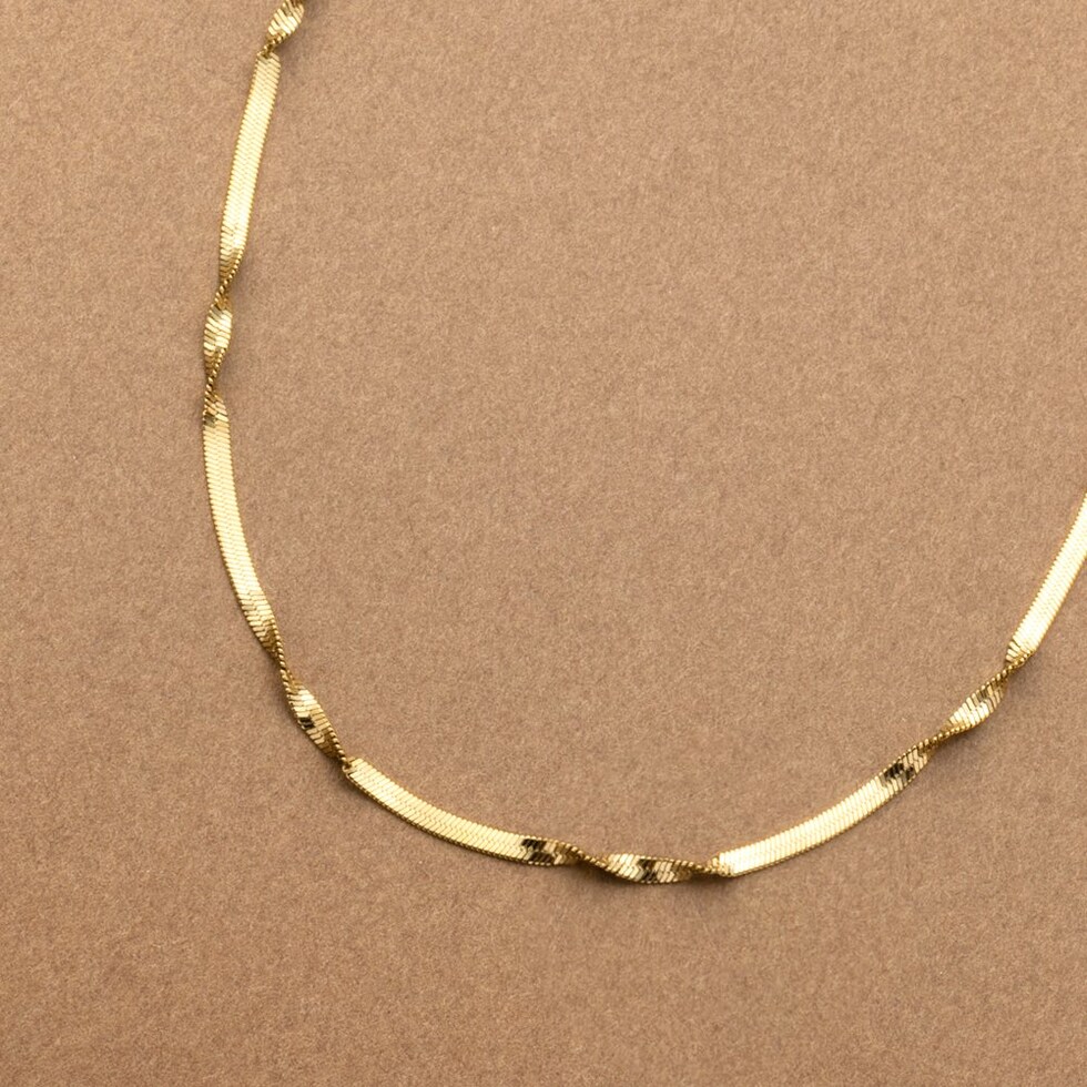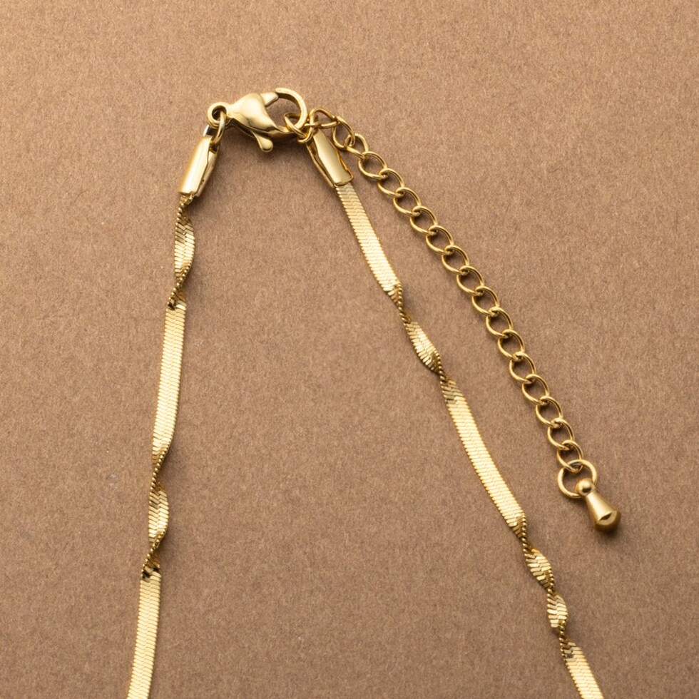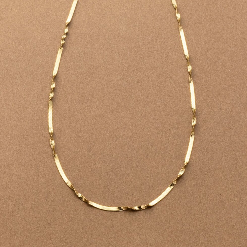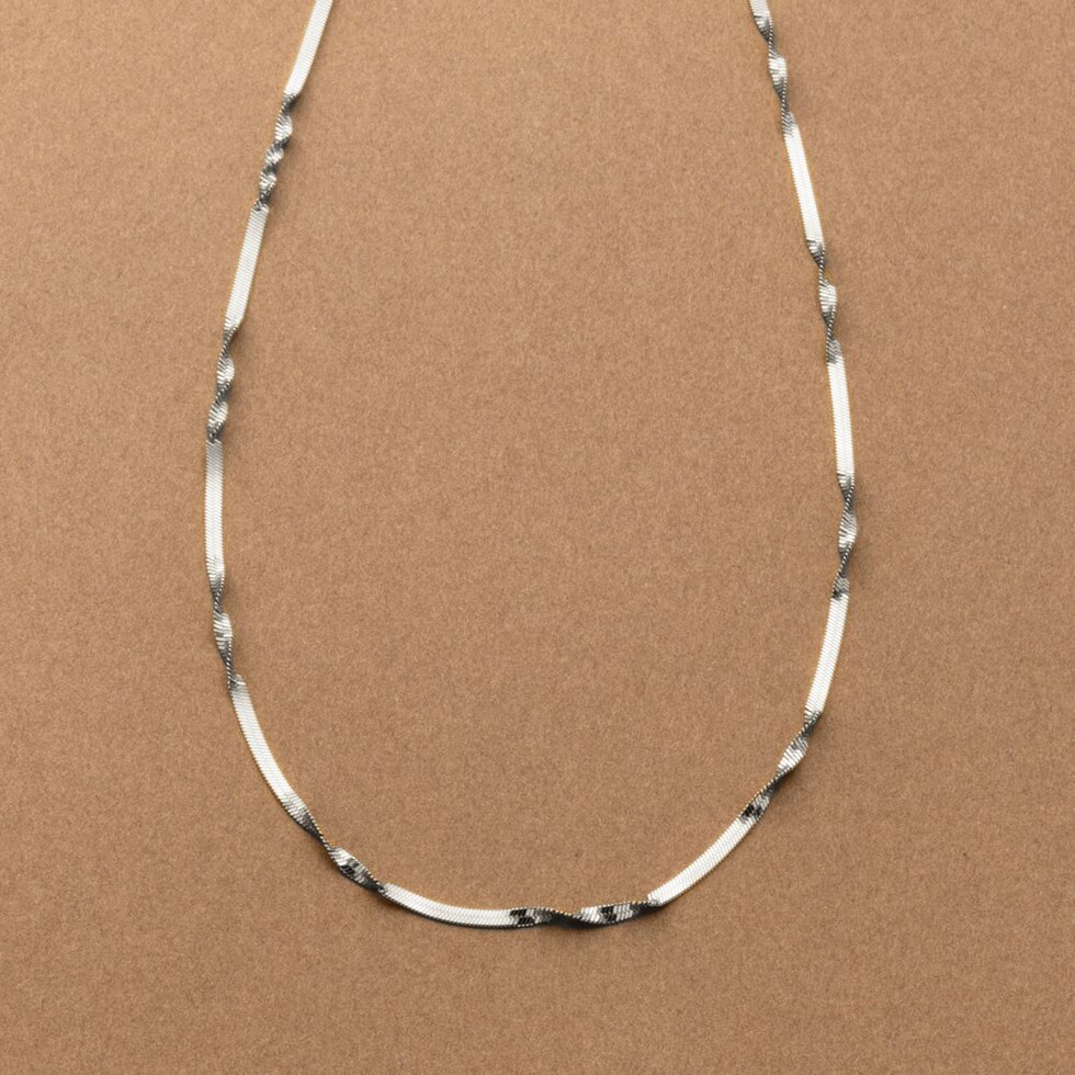 キラキラと光を反射する平スネークチェーンのネックレス。等間隔でツイストを加えたデザインで、シンプルすぎずデコルテの程よいアクセントに。どんなお洋服にも大人っぽく馴染んでくれるからデイリーに活躍しそう◎錆びにくく傷に強いステンレス製です。
