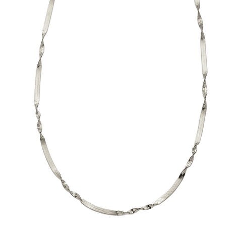 キラキラと光を反射する平スネークチェーンのネックレス。等間隔でツイストを加えたデザインで、シンプルすぎずデコルテの程よいアクセントに。どんなお洋服にも大人っぽく馴染んでくれるからデイリーに活躍しそう◎錆びにくく傷に強いステンレス製です。