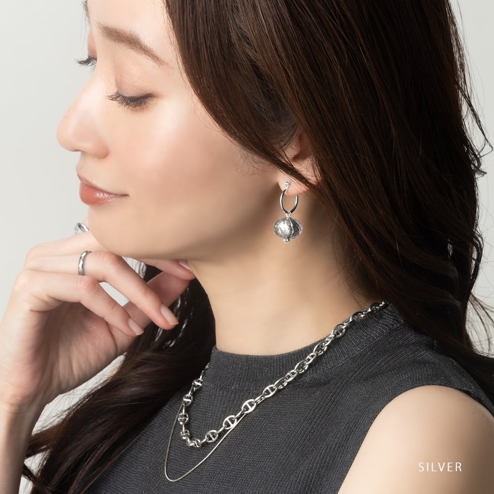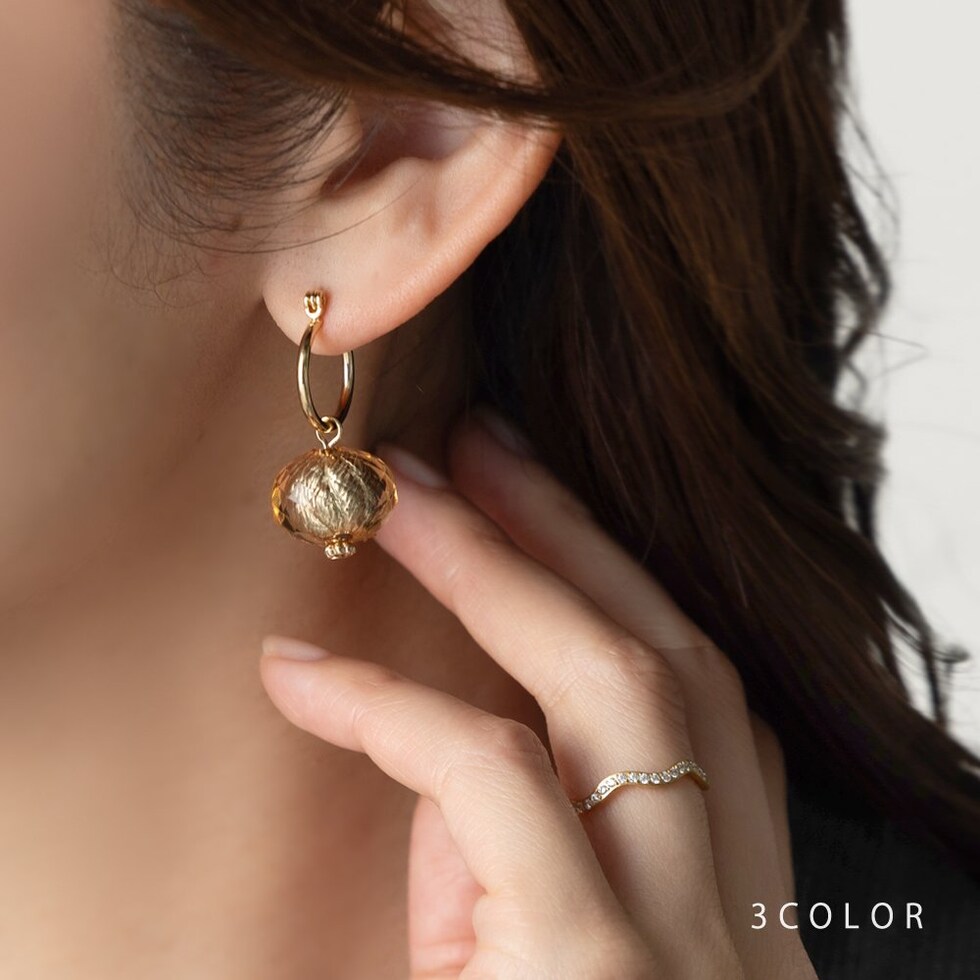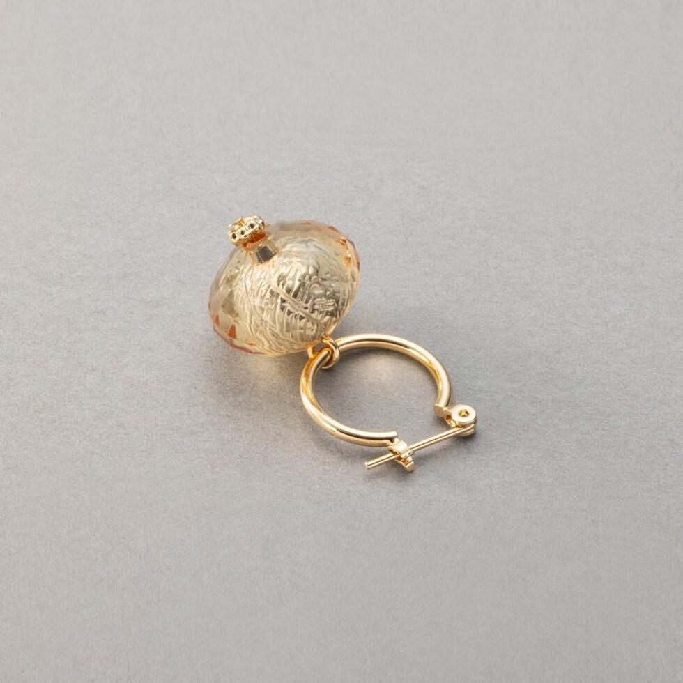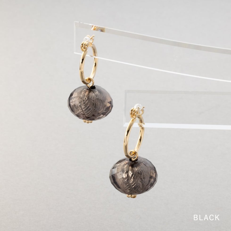 繊細な模様が浮かび上がった多面カットクリアストーンのキャッチレスフープピアス。耳元で揺らめくモチーフと個性的なフォルムが存在感際立つアイテム。顔周りを明るく華やかに演出してくれるので、スタイリングのアクセントにオススメ◎