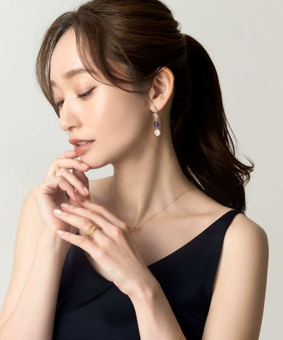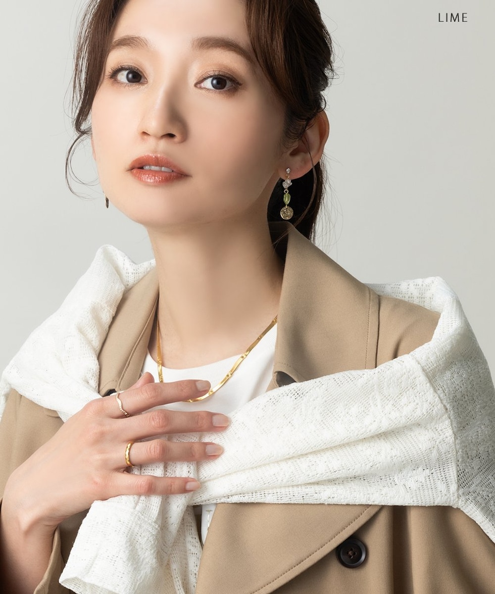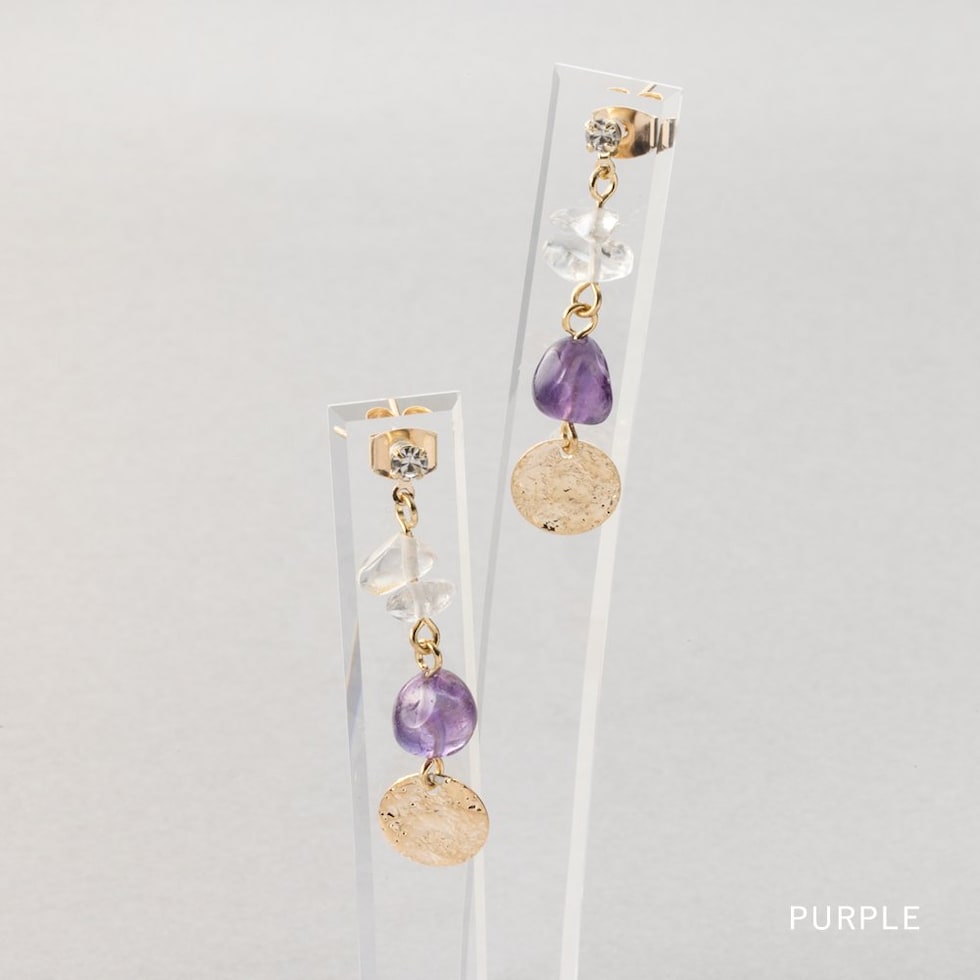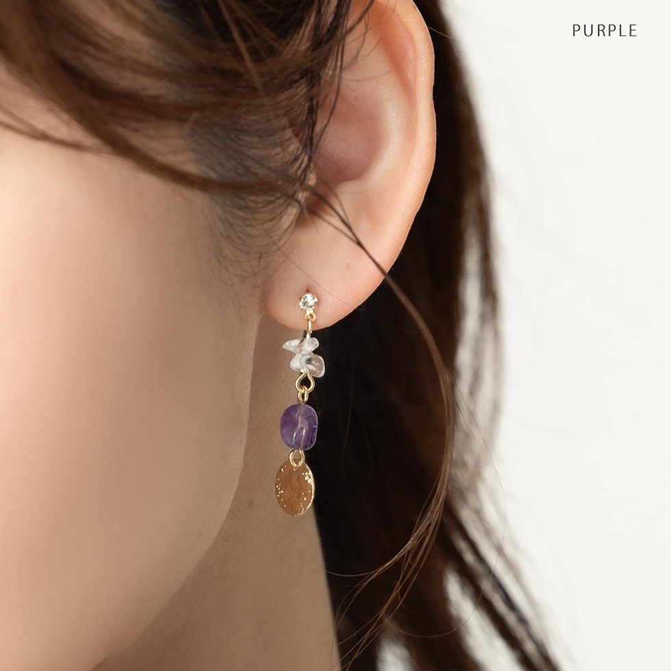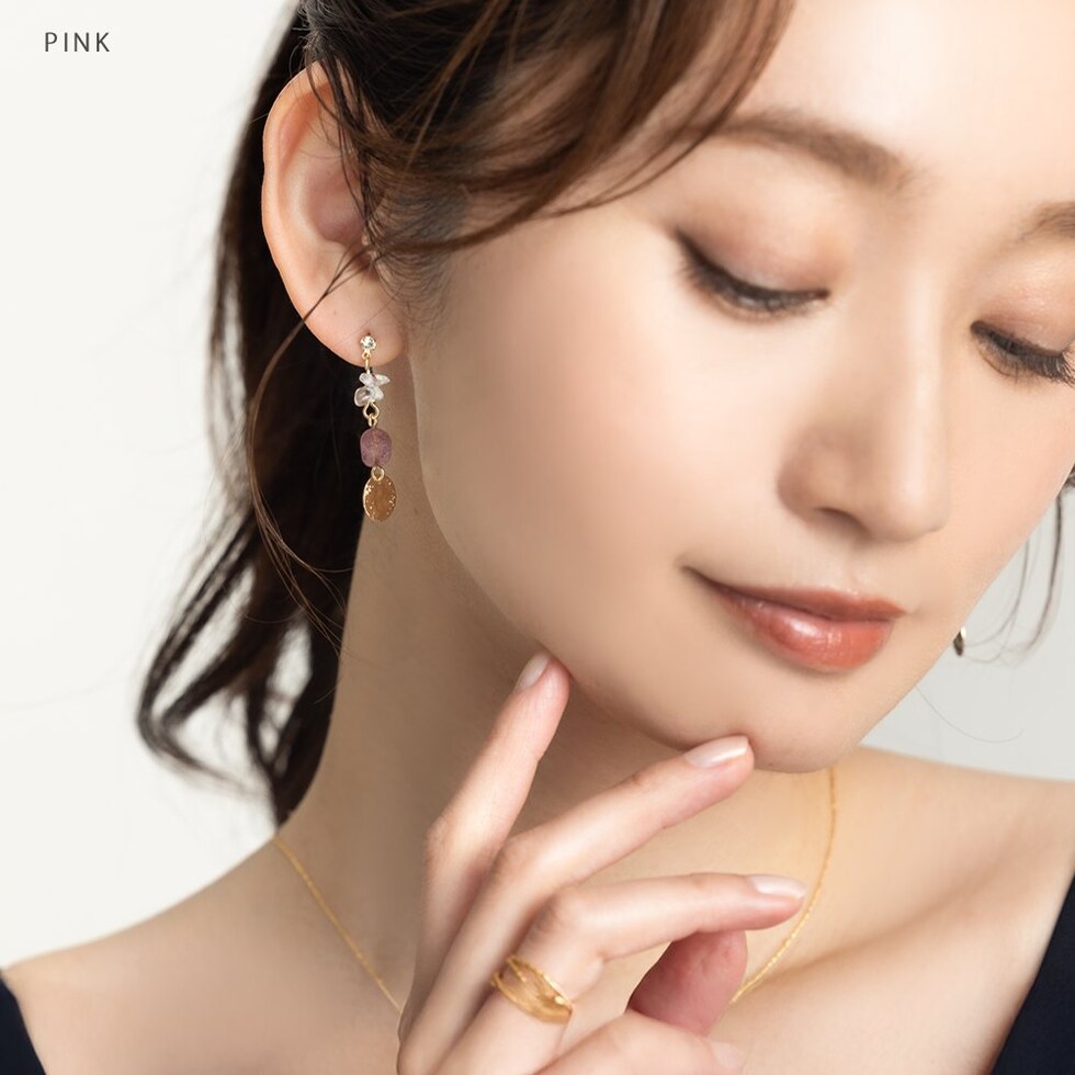 天然石とクラフト加工のメタルが耳元で揺れるピアス。小ぶりなサイズ感と細かなデザインが普段使いにもオススメなひと品。一粒ビジューのさりげない煌めきもプラスした大人に似合うアイテムです。