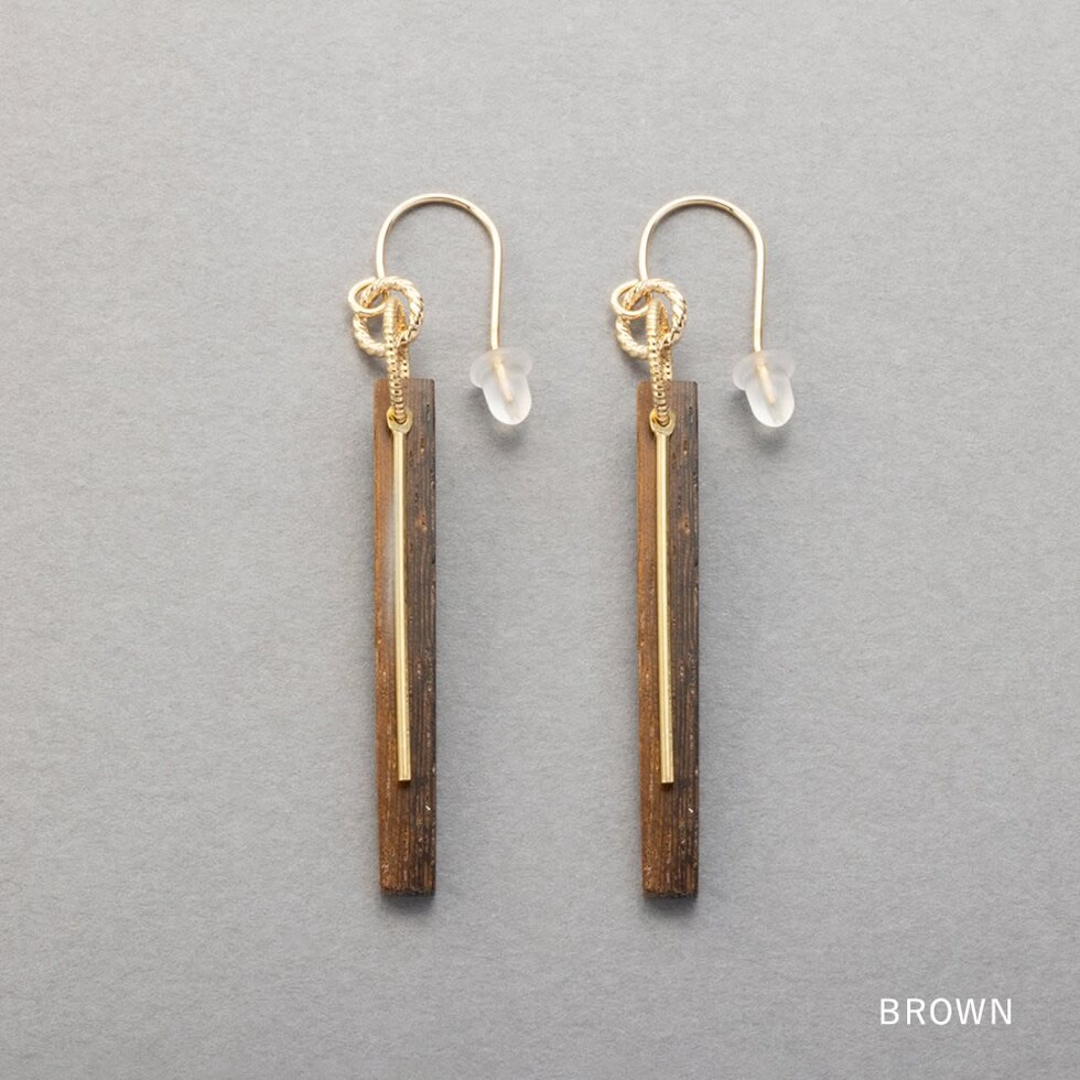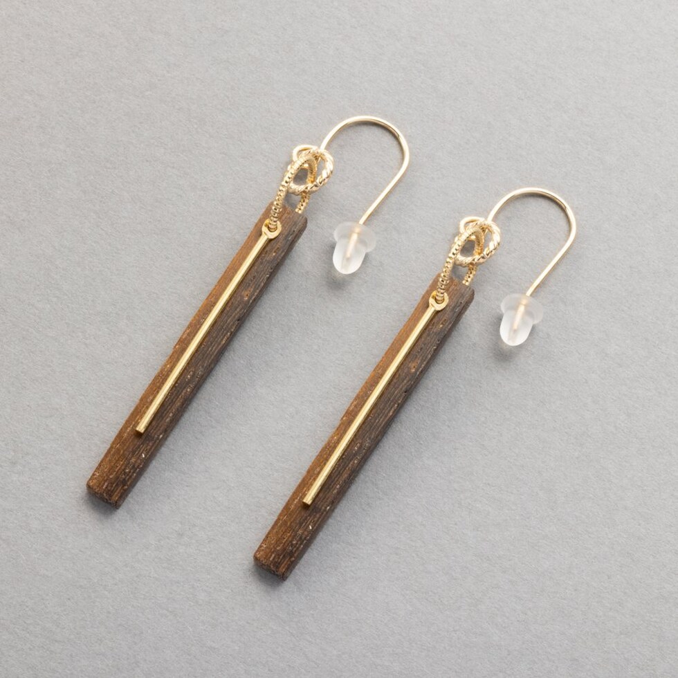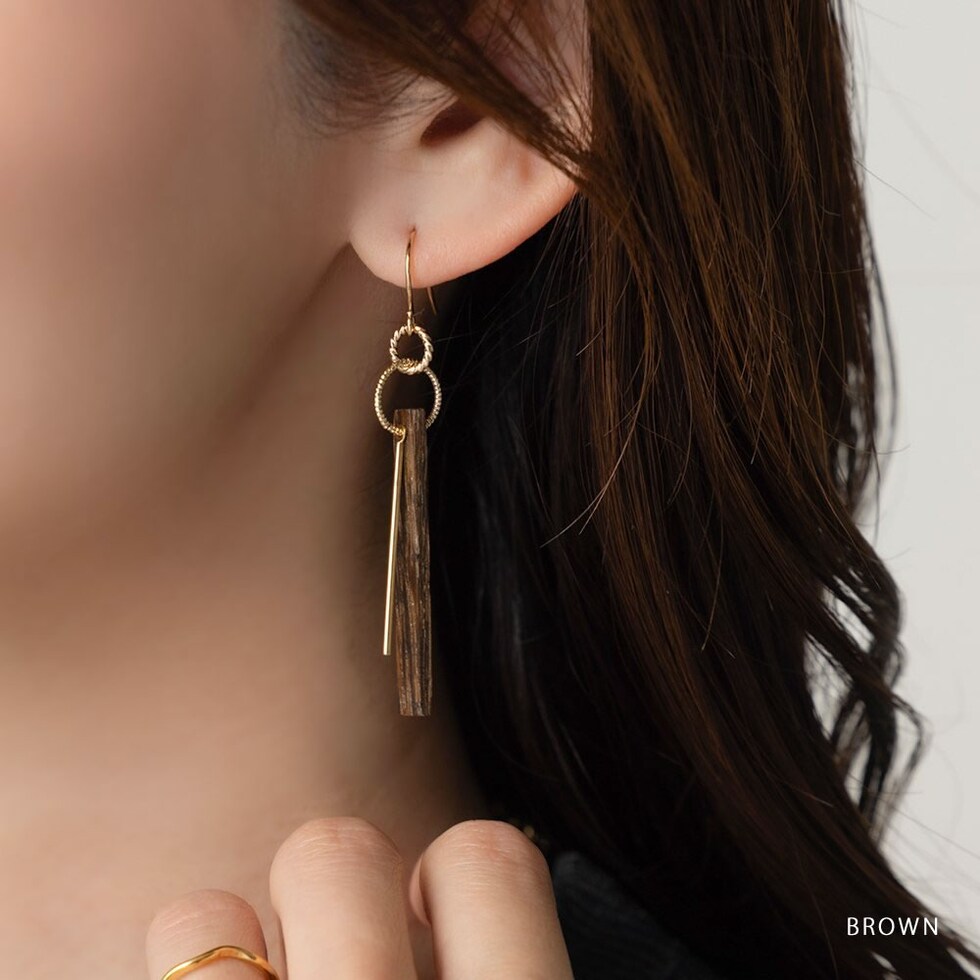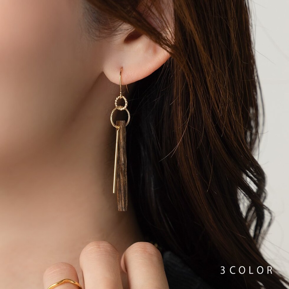 ウッドとメタルを組み合わせた縦長シルエットのバーピアス。落ち着きのある風合いのウッドにメタルが艶めく大人っぽいデザインがポイント。揺れるたびに程よい存在感を放ち、コーデを格上げしてくれるアイテムです。