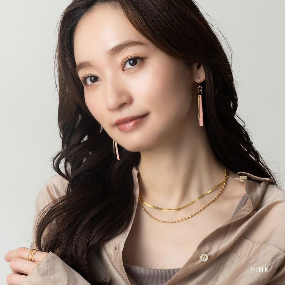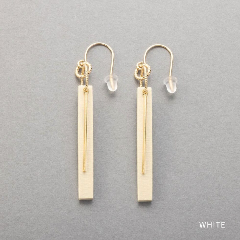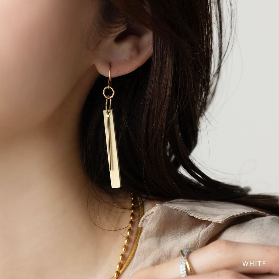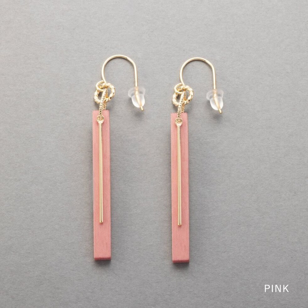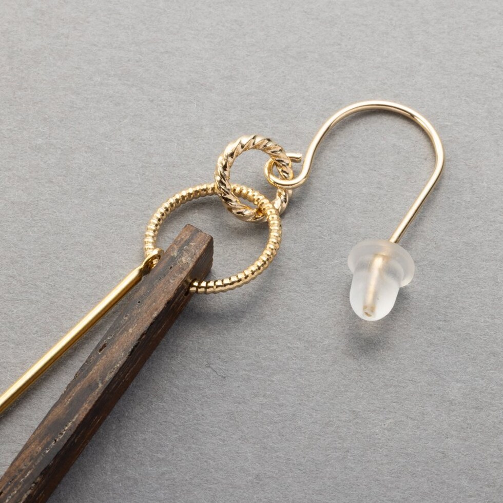 ウッドとメタルを組み合わせた縦長シルエットのバーピアス。落ち着きのある風合いのウッドにメタルが艶めく大人っぽいデザインがポイント。揺れるたびに程よい存在感を放ち、コーデを格上げしてくれるアイテムです。