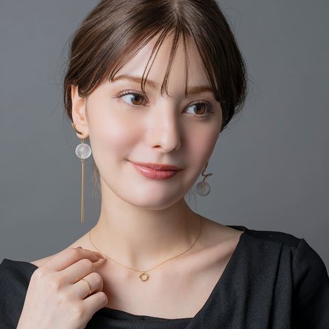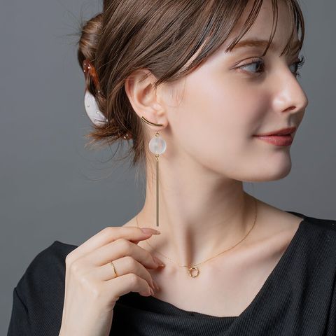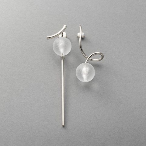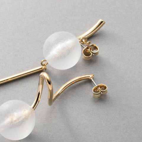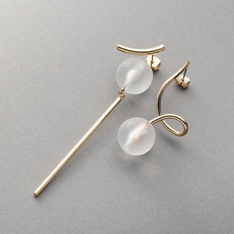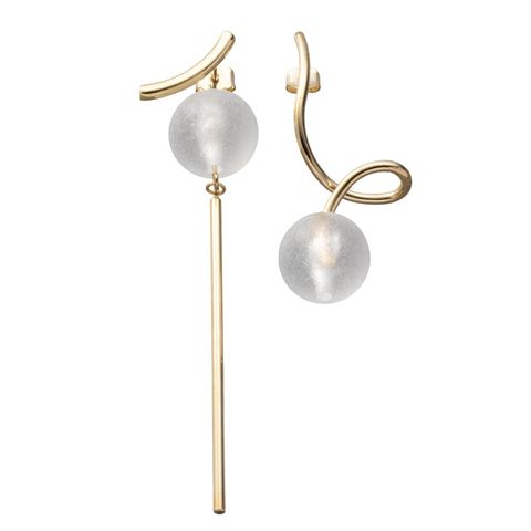 クリアボールとメタルバーを組み合わせたアシンメトリーデザインのピアス。大ぶりの揺れるシルエットがお顔周りを華やかに演出してくれます。カジュアルコーデはもちろん、パーティーなど華やかなシーンの装いにもぴったりなひと品です。
