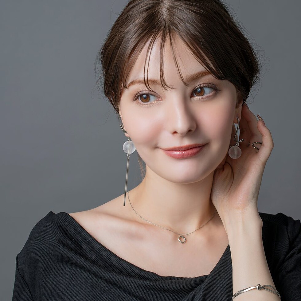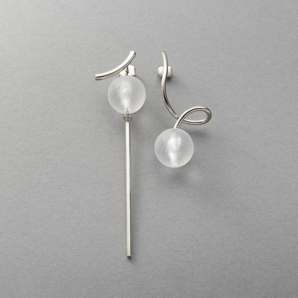 クリアボールとメタルバーを組み合わせたアシンメトリーデザインのピアス。大ぶりの揺れるシルエットがお顔周りを華やかに演出してくれます。カジュアルコーデはもちろん、パーティーなど華やかなシーンの装いにもぴったりなひと品です。