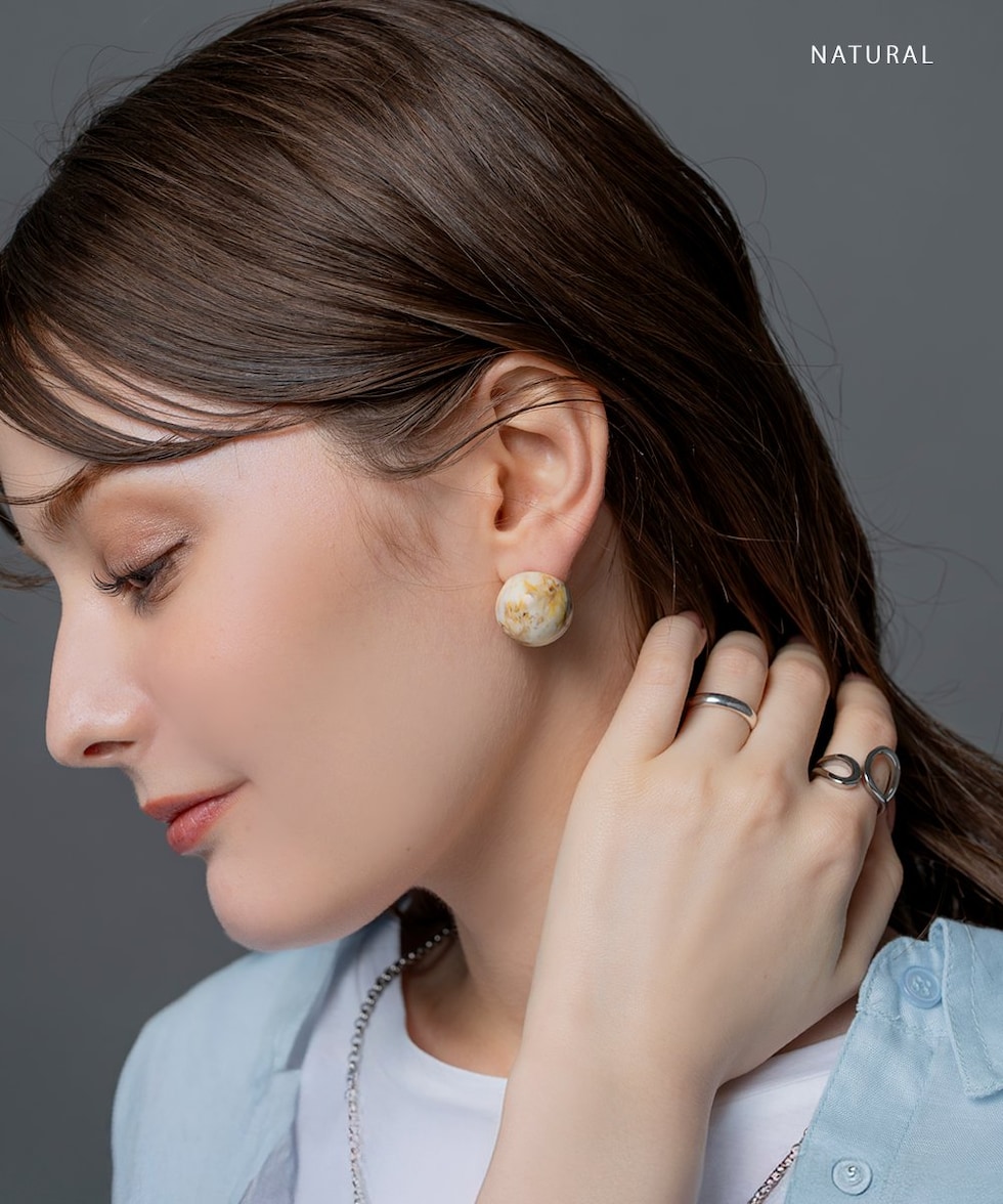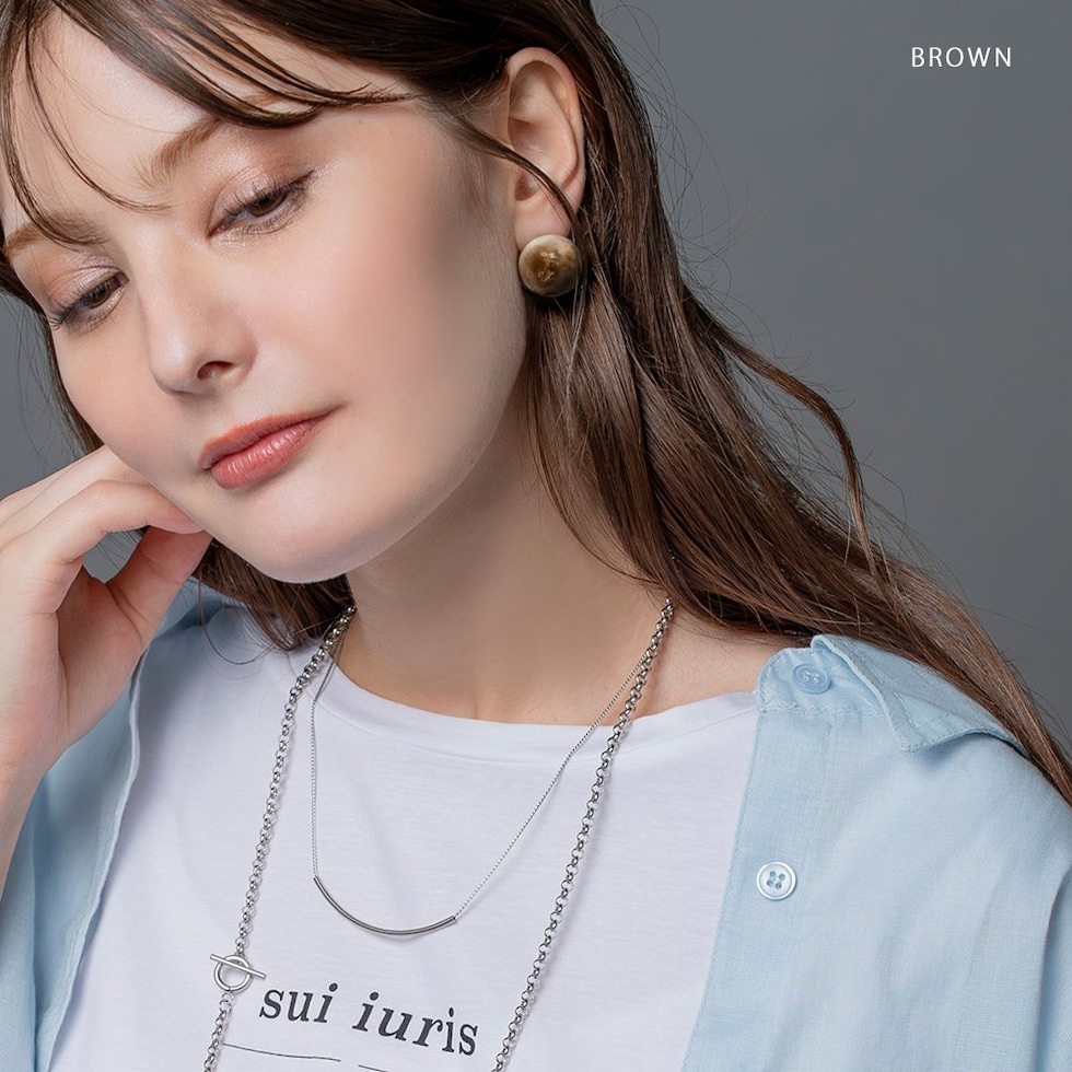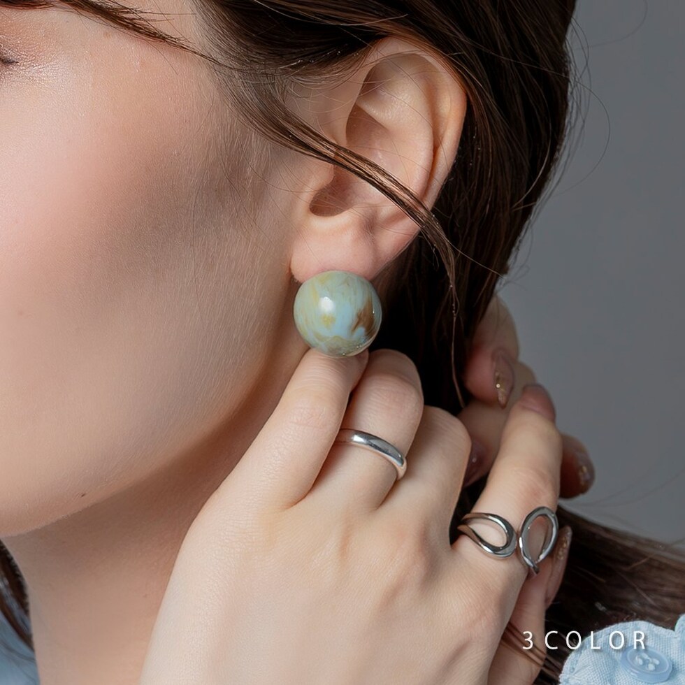 大人色マーブルのスフィアが存在感を放つピアス。見た目以上に軽い着け心地なのも嬉しいひと品。絶妙な色合いがコーデにアクセントをアクセントを添えてシーズンライクな雰囲気を演出します。