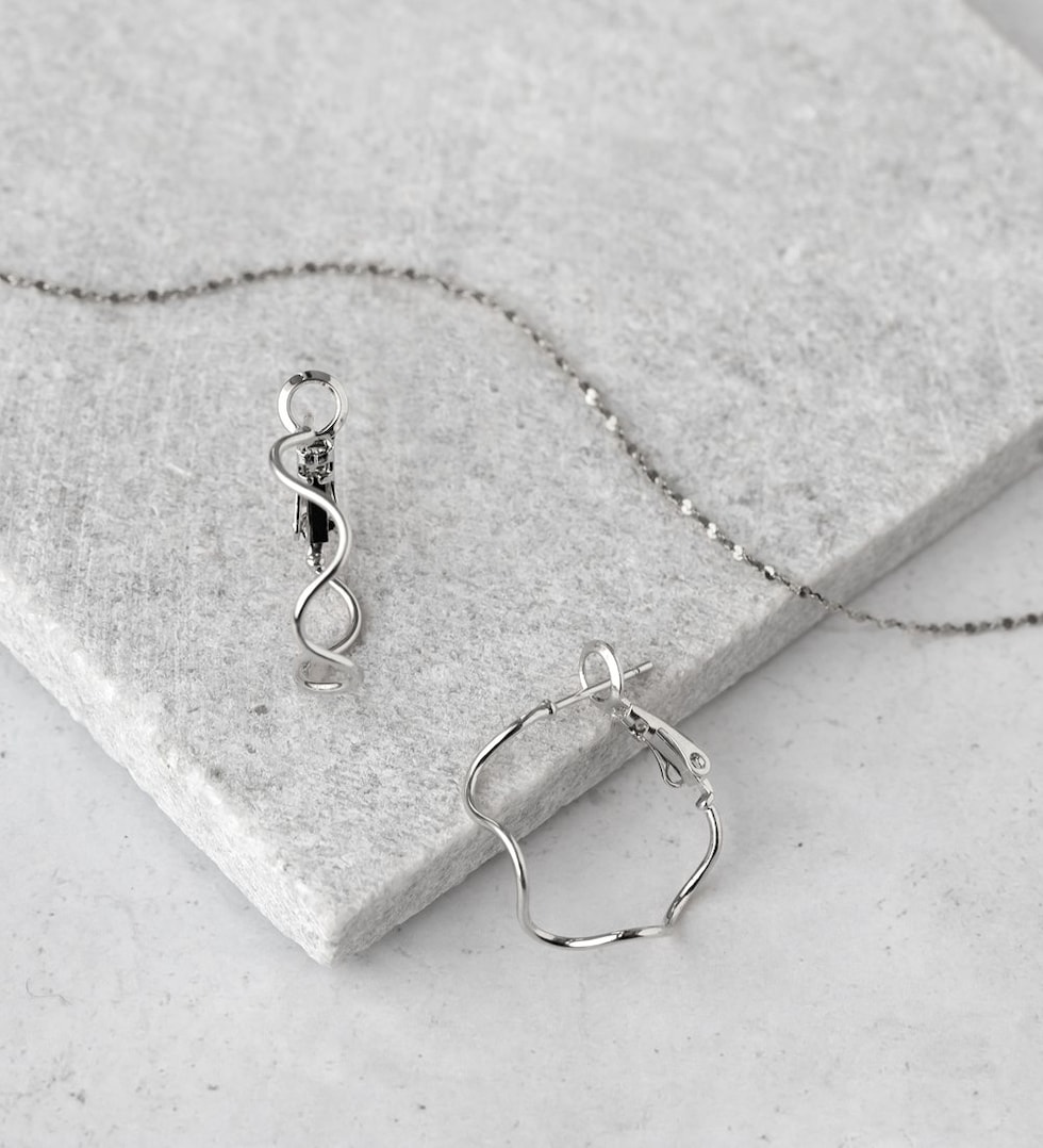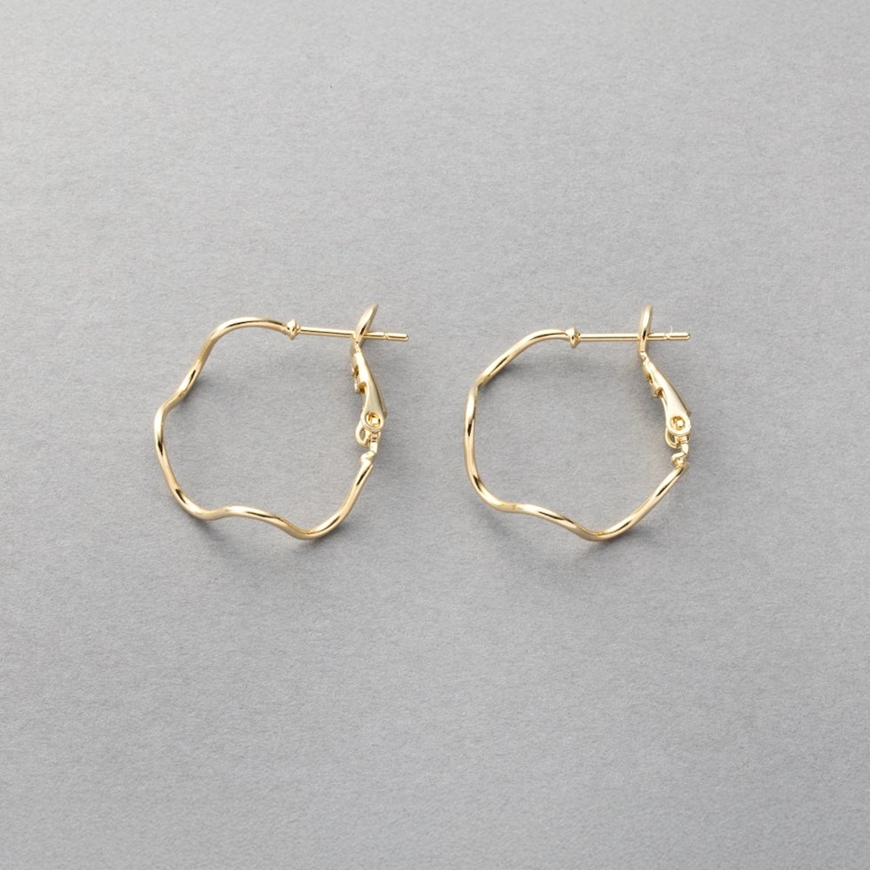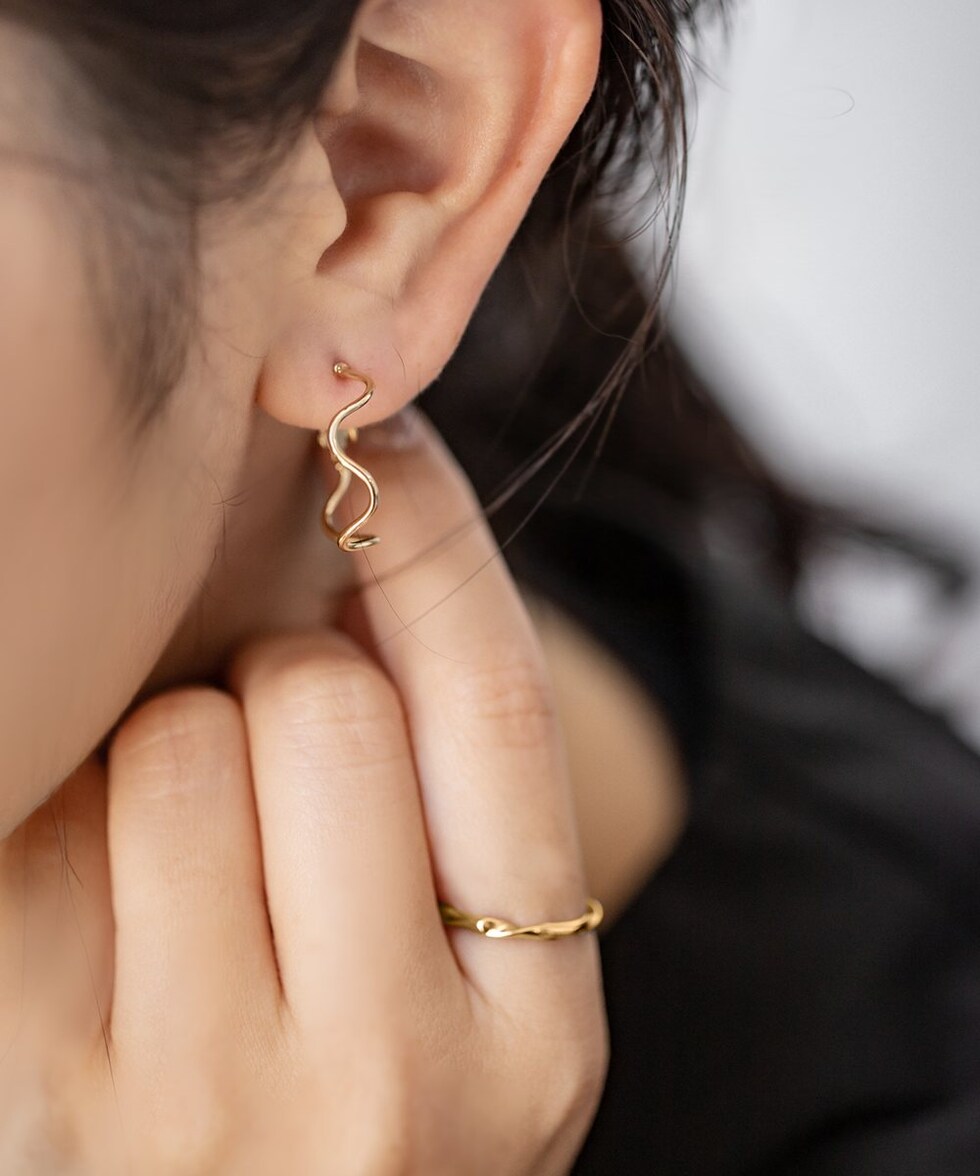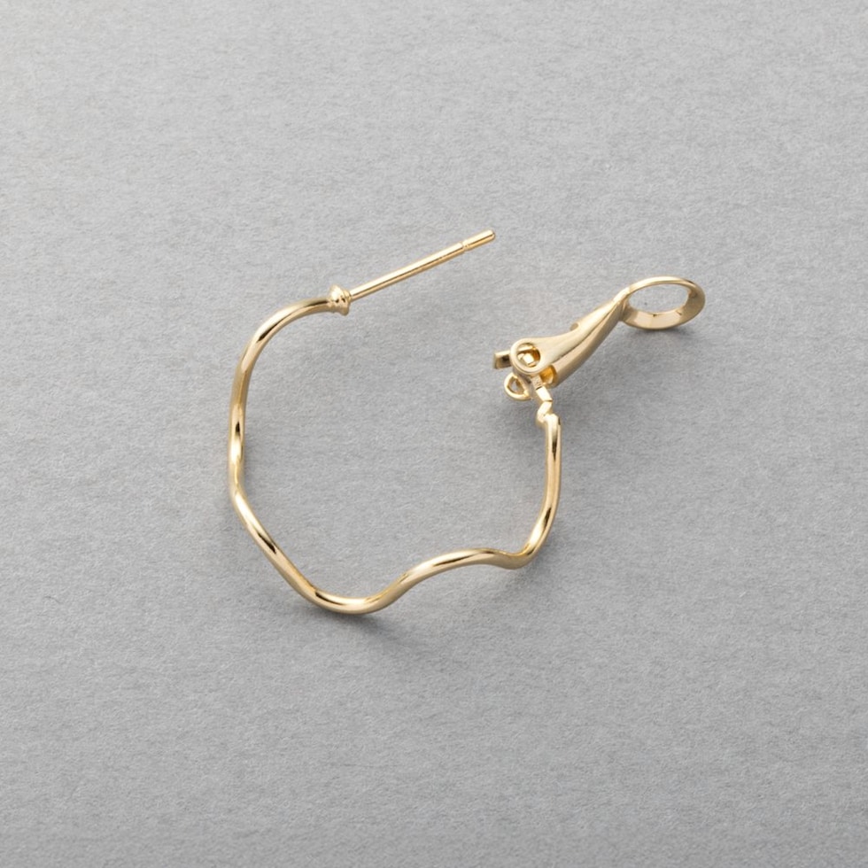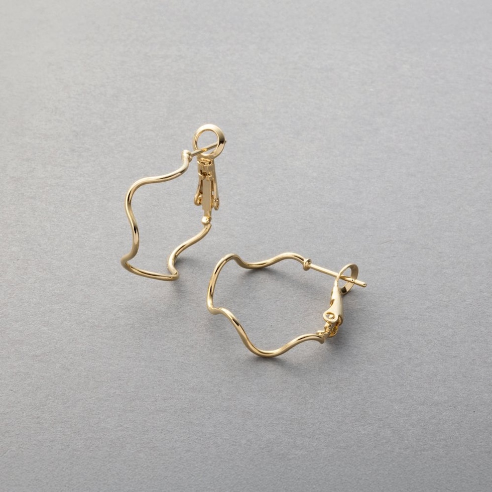 緩やかなウェーブラインが大人可愛いフープピアス。シンプルに見えてアクセントの効いたフォルムでコーデのワンポイントにぴったり。パチッと挟むだけのキャッチレスタイプで着用も簡単♪