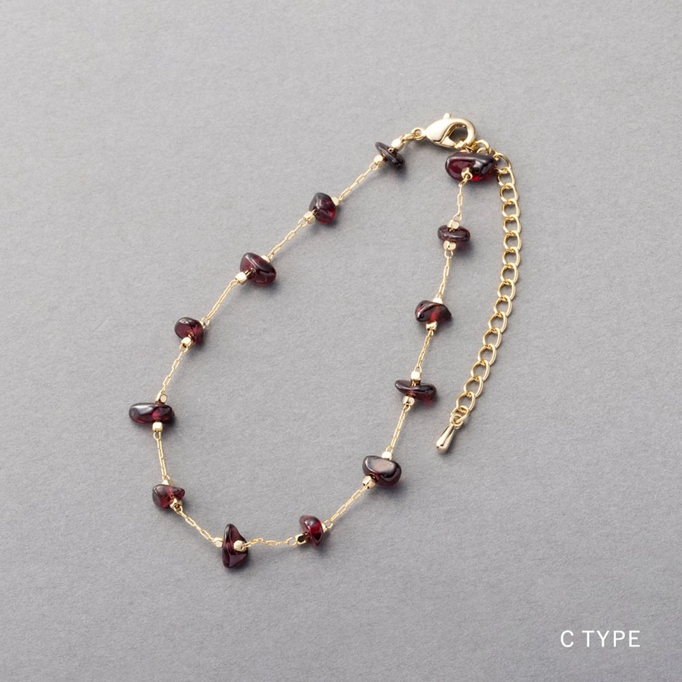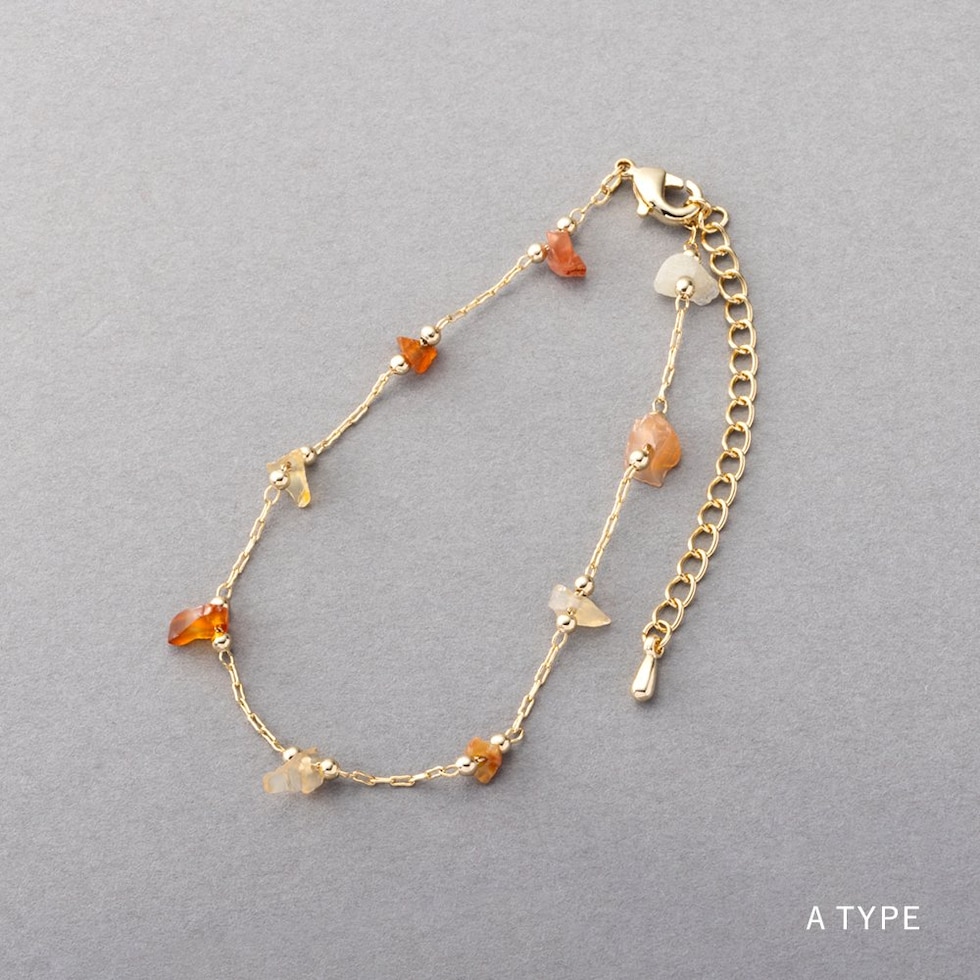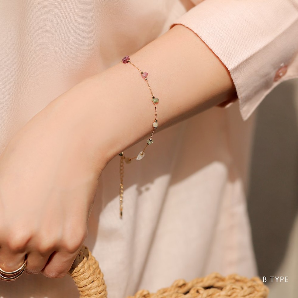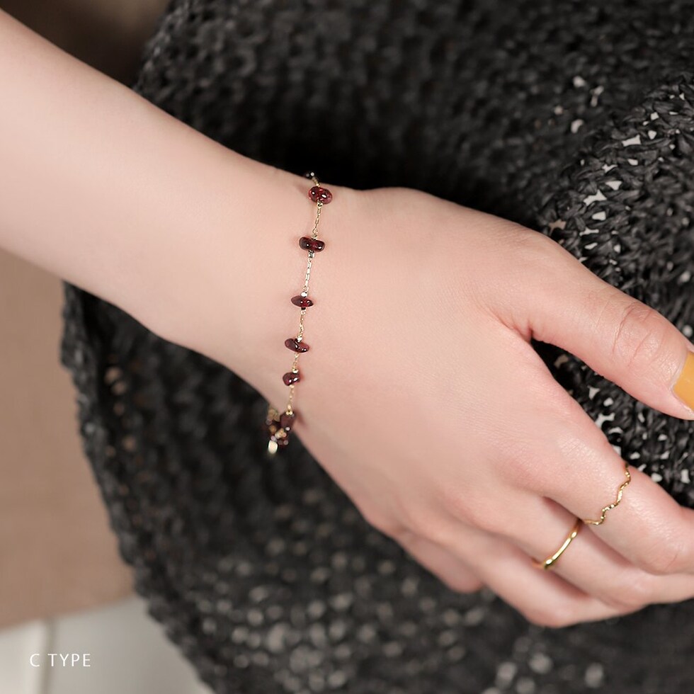 ニュアンス感たっぷりな天然石が手元を彩るブレスレット。それぞれ形の異なる天然石と華奢なチェーンの組み合わせで重ね付けにもしても楽しめるアイテムです。雰囲気の異なる3タイプから選べる、オススメのひと品。