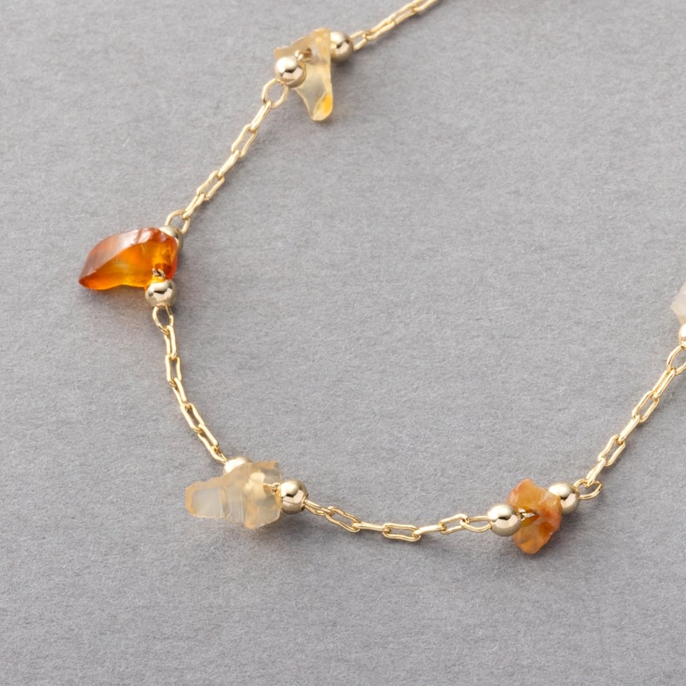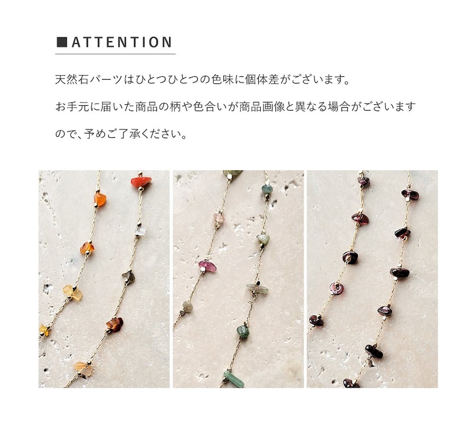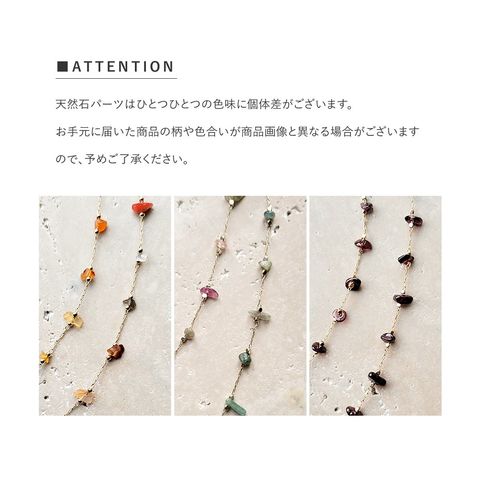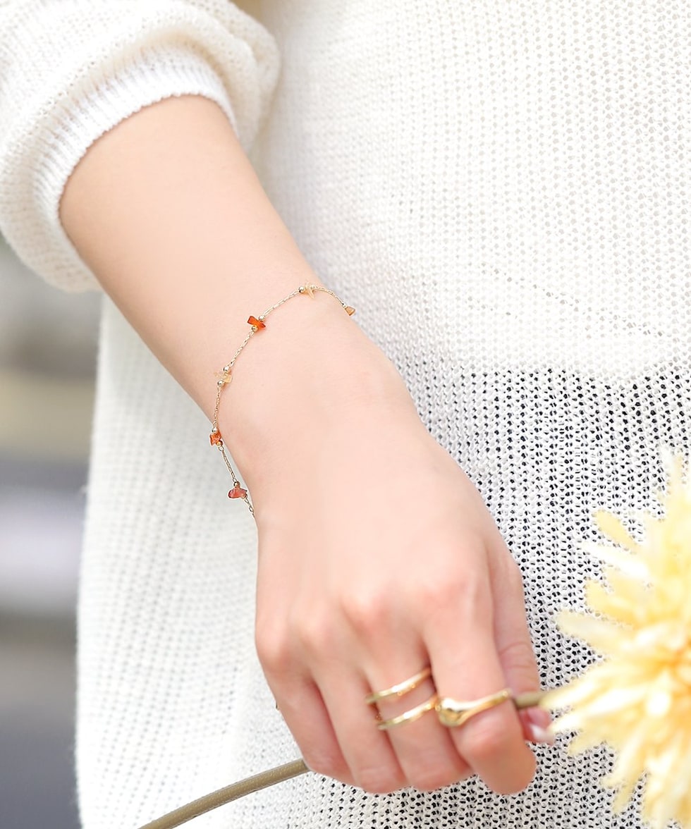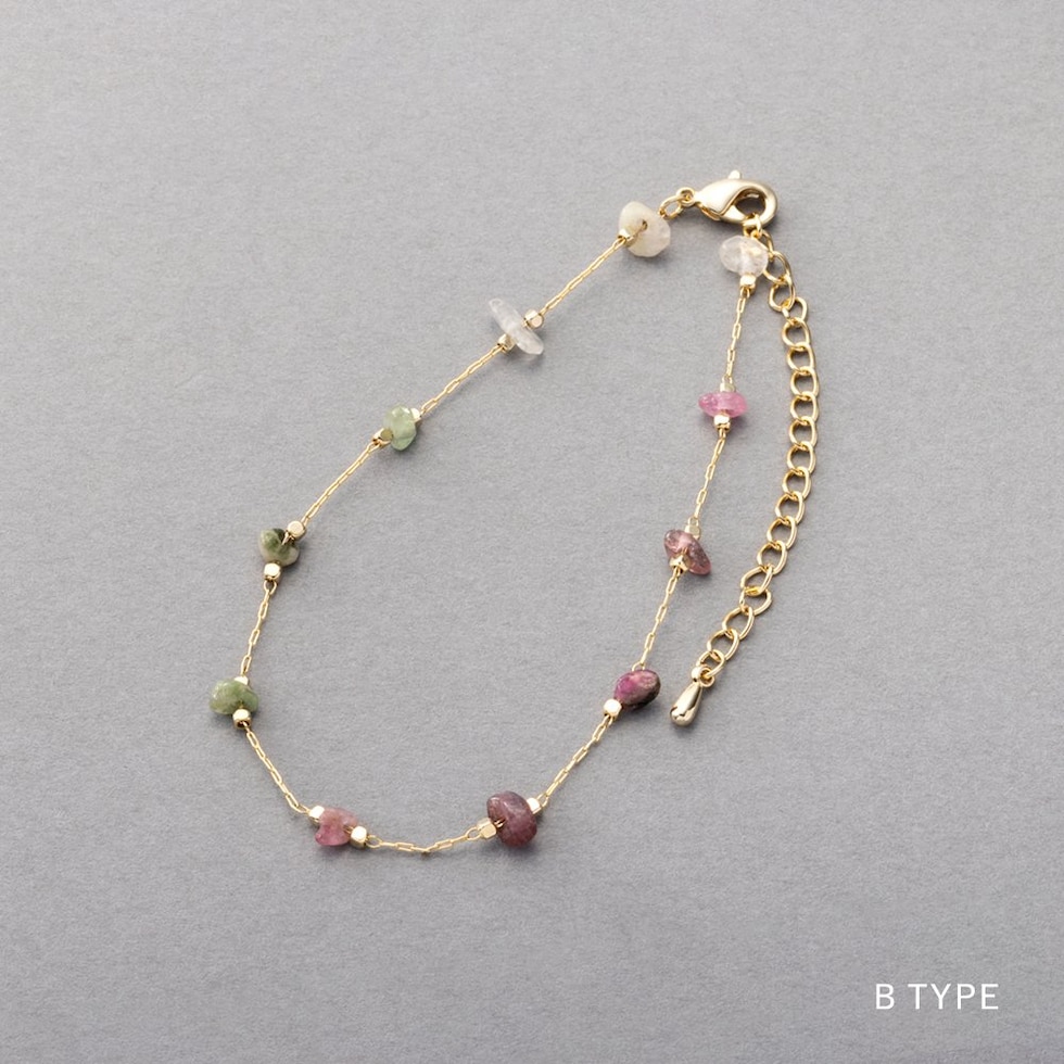 ニュアンス感たっぷりな天然石が手元を彩るブレスレット。それぞれ形の異なる天然石と華奢なチェーンの組み合わせで重ね付けにもしても楽しめるアイテムです。雰囲気の異なる3タイプから選べる、オススメのひと品。