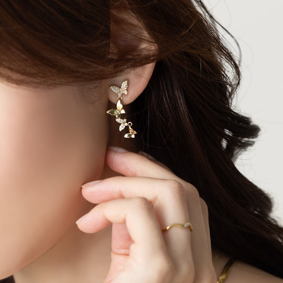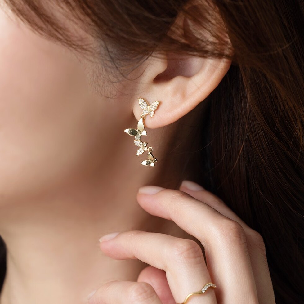 ほのかに揺らめく4連バタフライピアス。4つのバタフライモチーフがそれぞれ揺れて、まるで耳元に蝶が舞っているように見えるデザインがステキ。繊細な煌めきが大人上品に仕上げてくれるから、デイリーに取り入れやすいアイテムです。