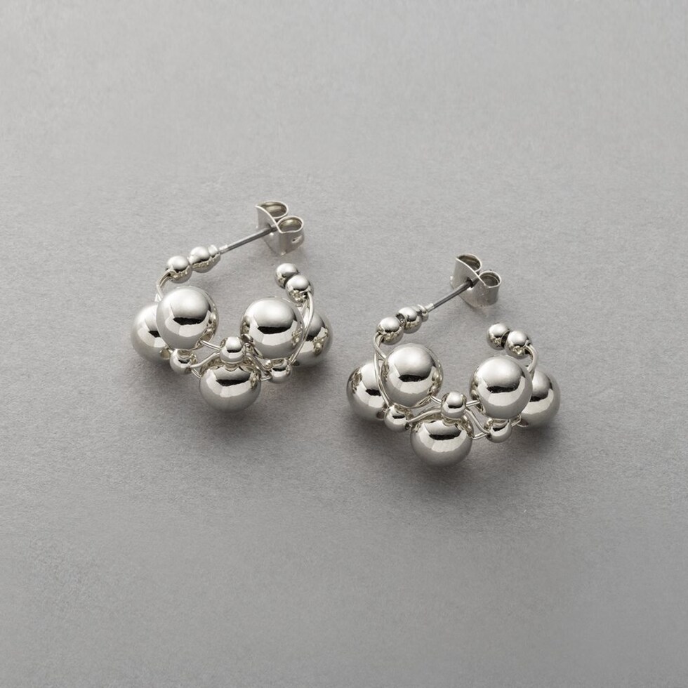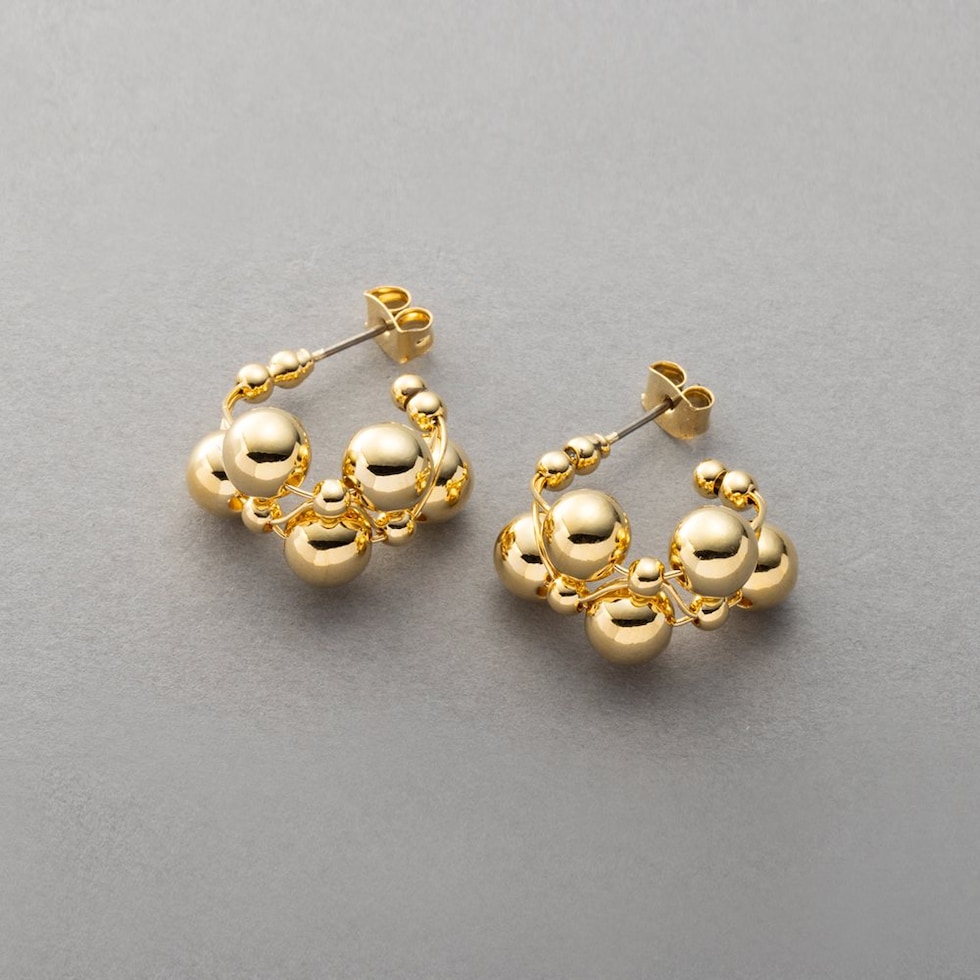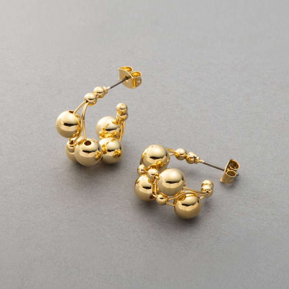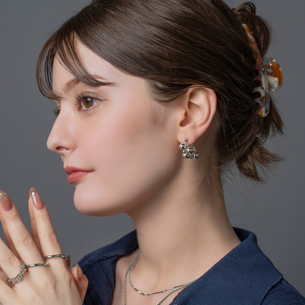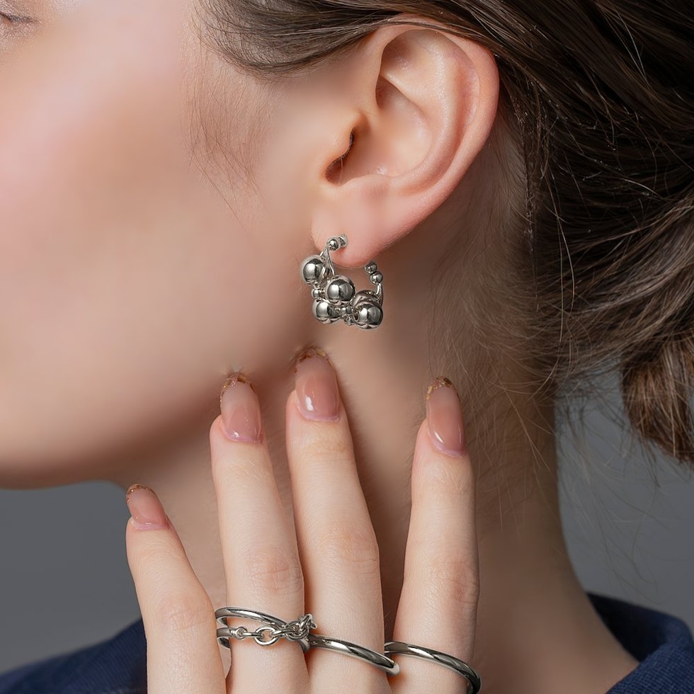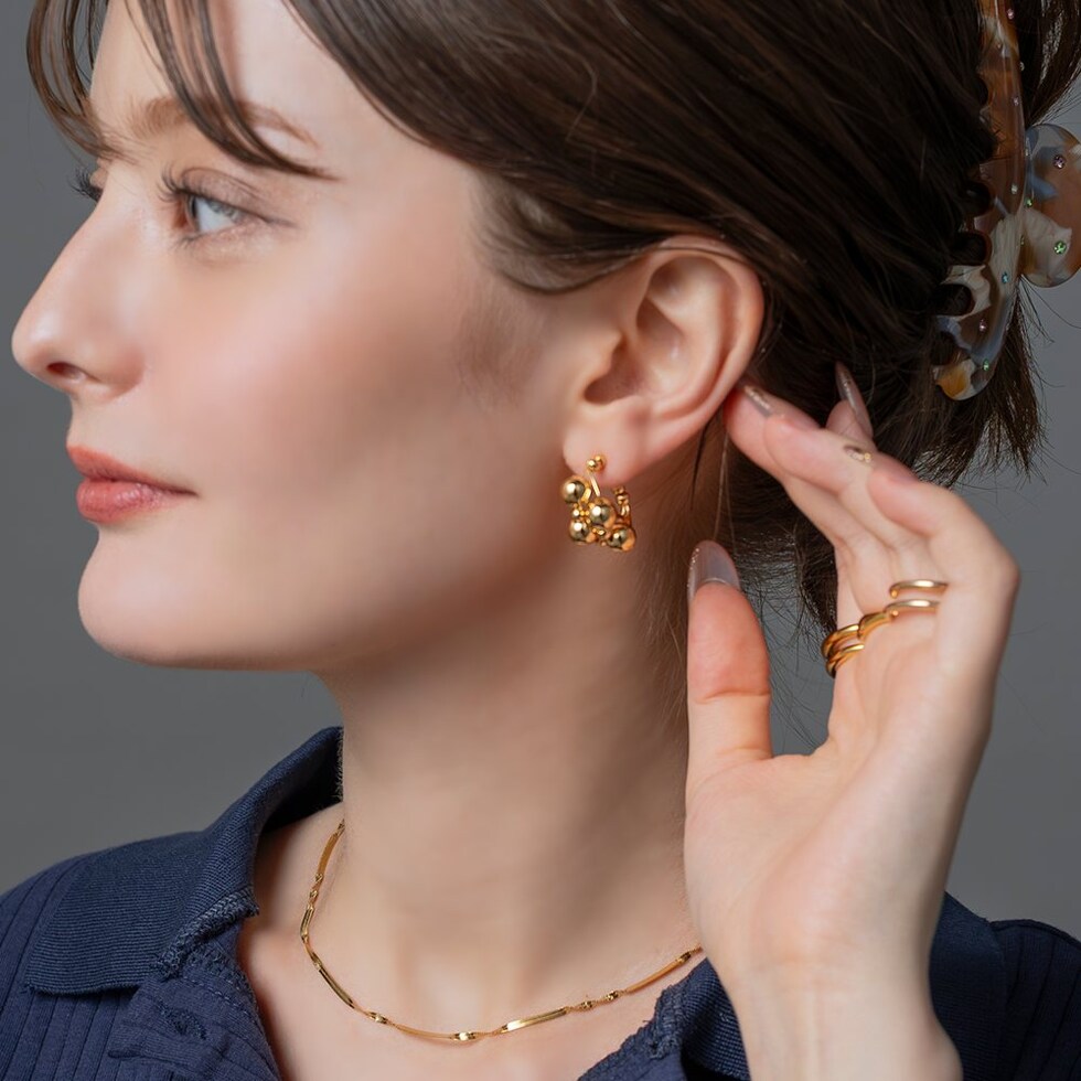 大きさの異なるメタルボールを立体的に連ねたバブルフープピアス。メタルの艶めきと個性的なフォルムが目を惹くデザインで、横顔をグッと印象づけてくれます。低アレルギーのチタンポストを使用しているので、長時間の着用も安心です。