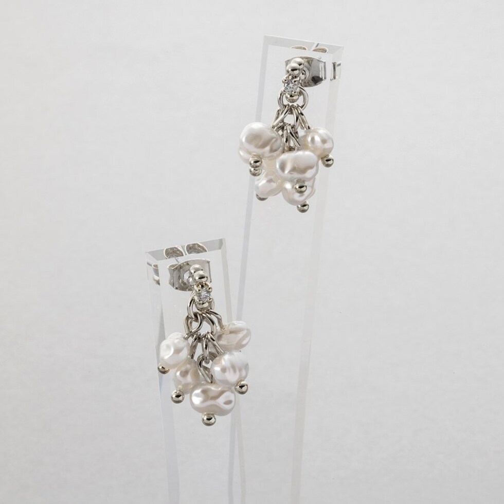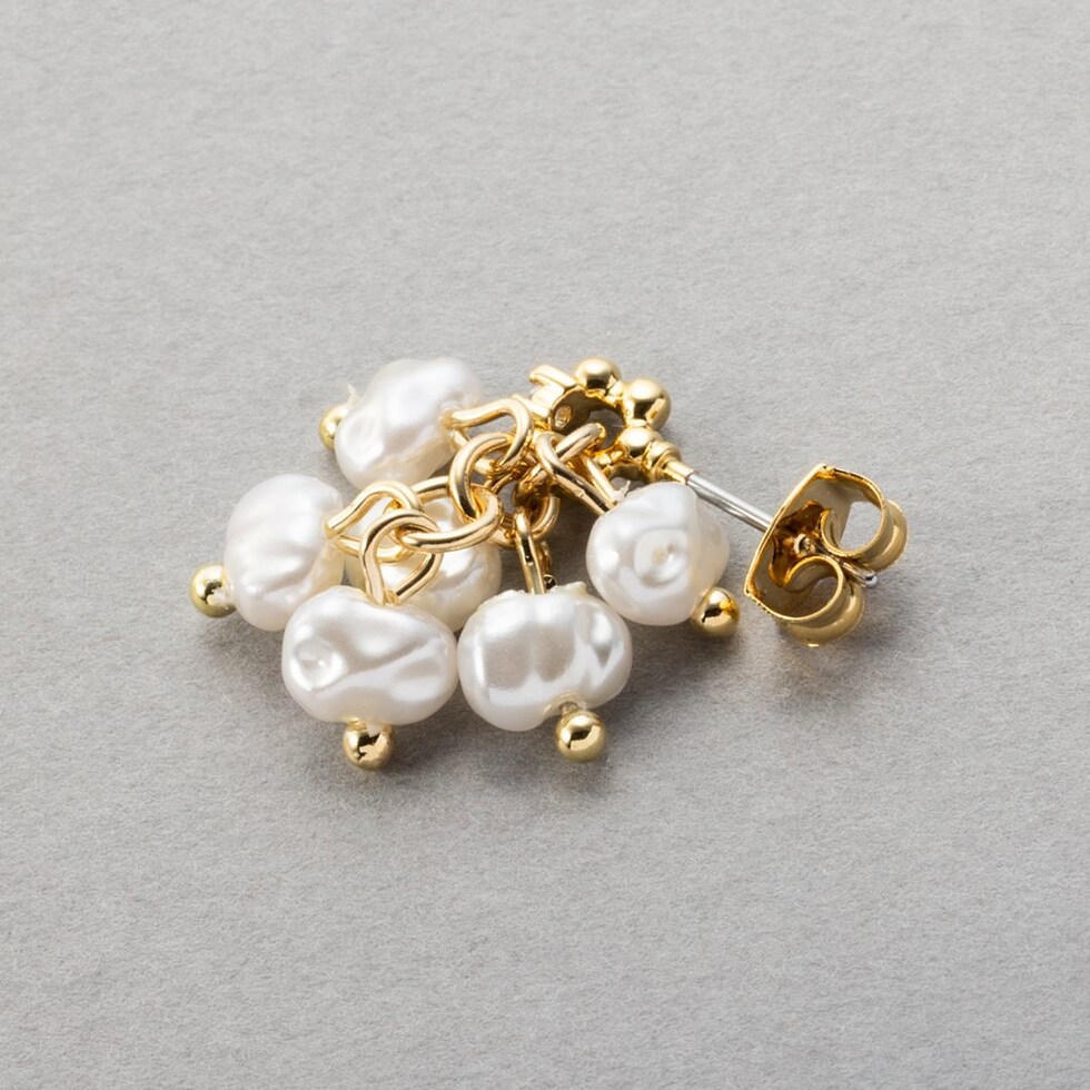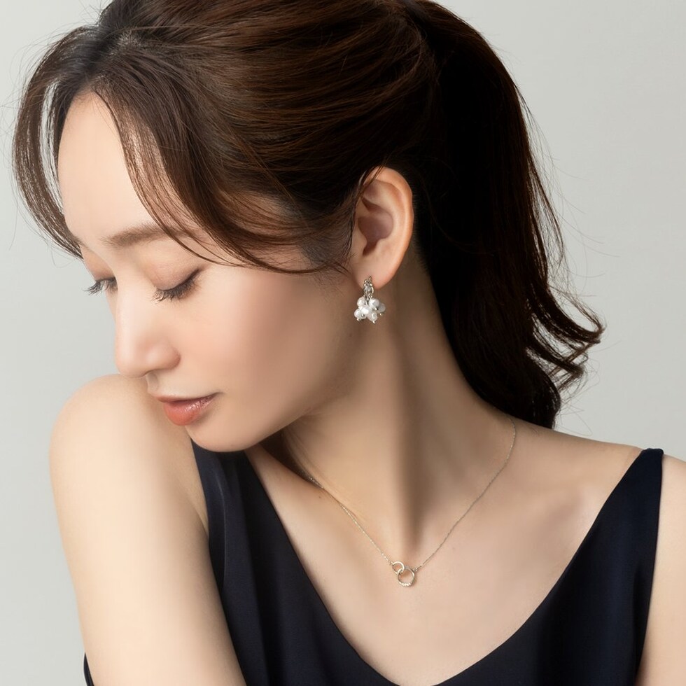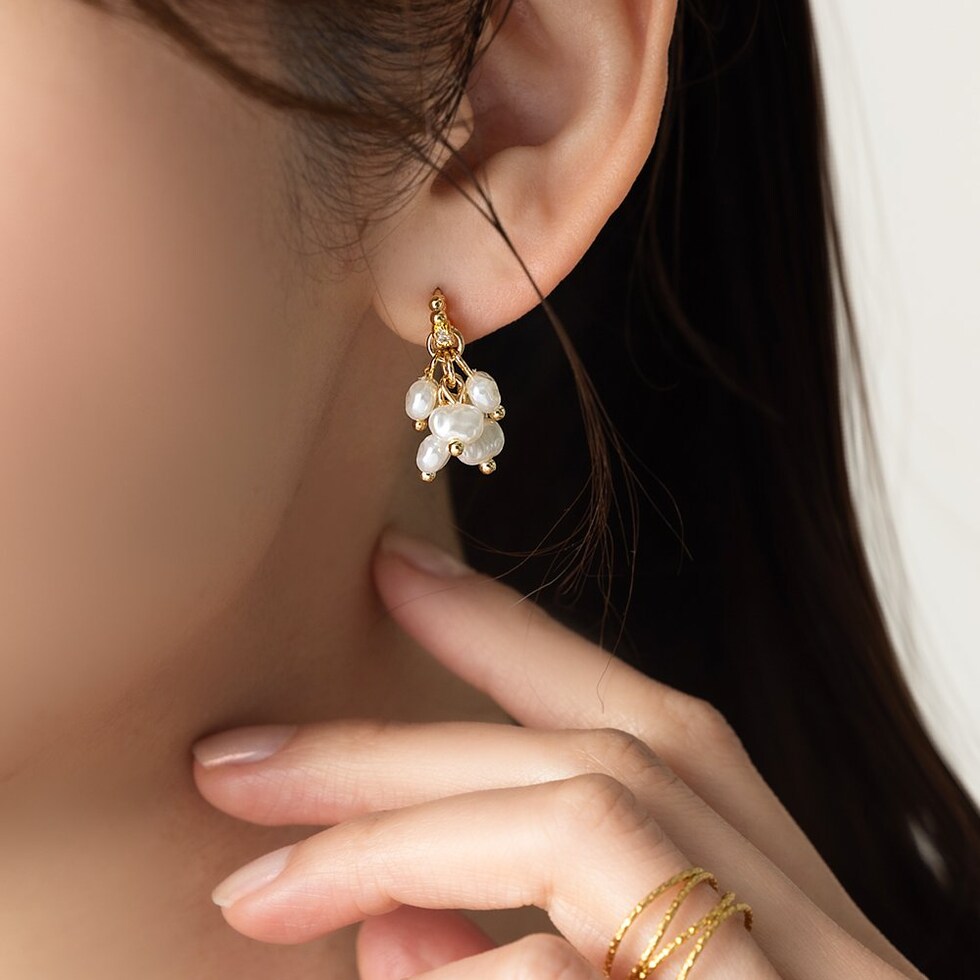 ニュアンス感たっぷりな変形パールのピアス。パールを集めたフォルムがさりげなく揺れて艶めくひと品。小粒なビジューや細部にもこだわったデザインが大人に似合うオススメのアイテムです。