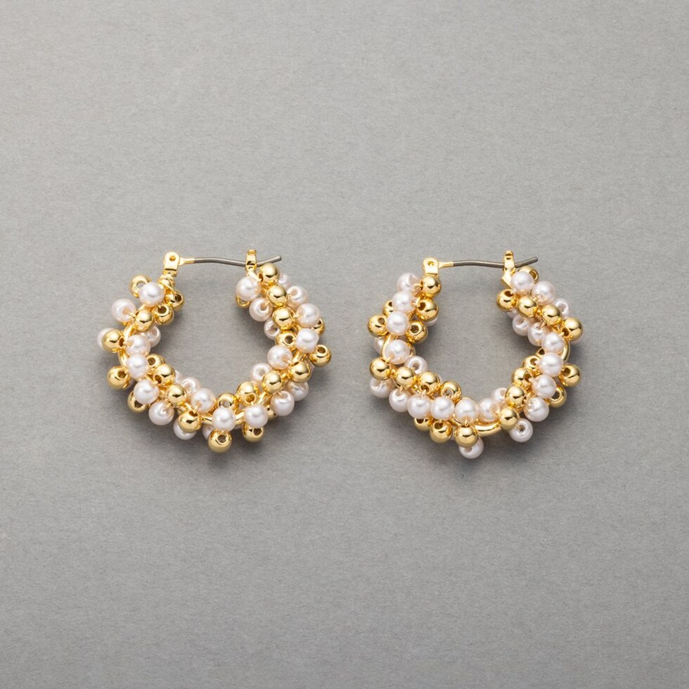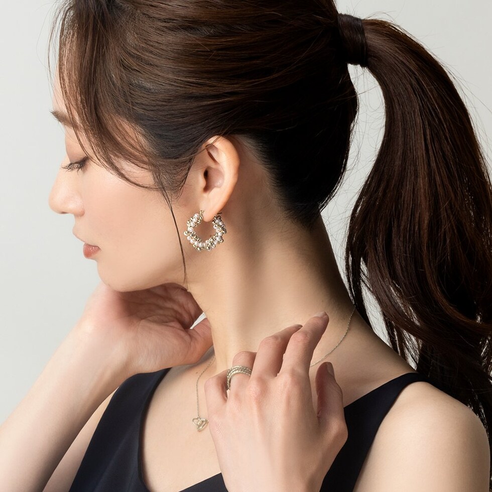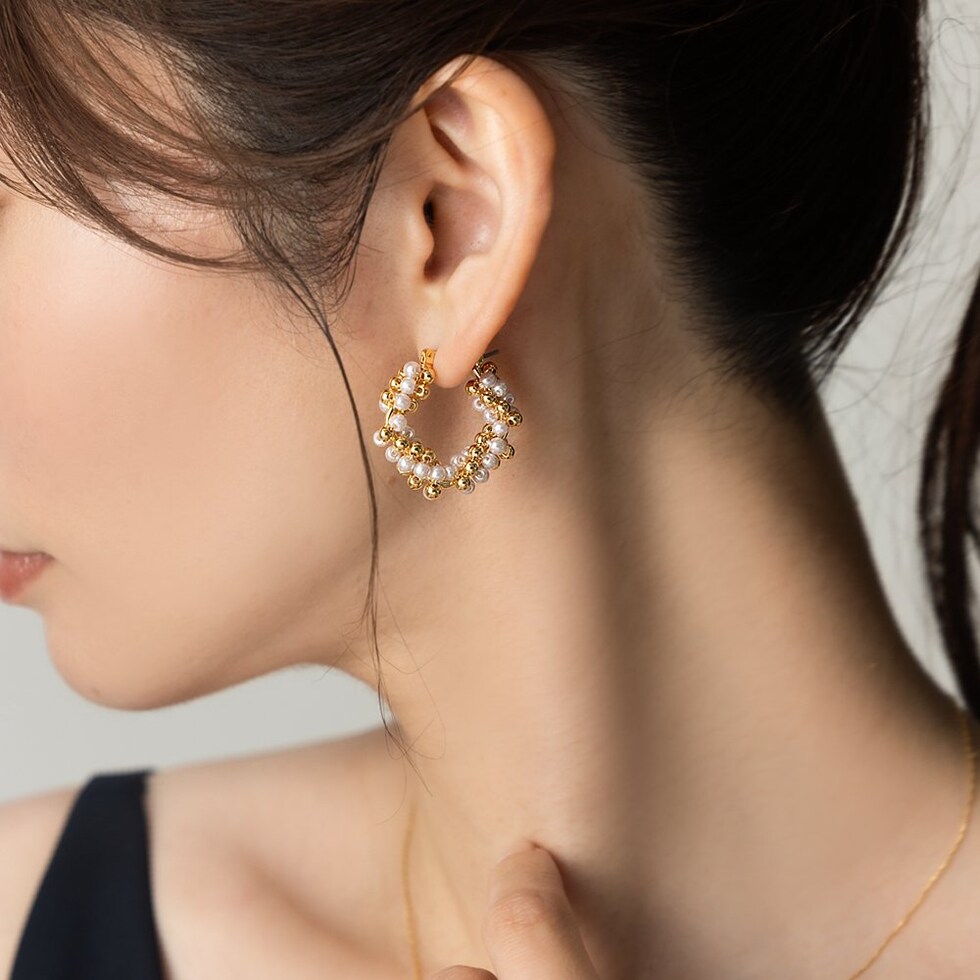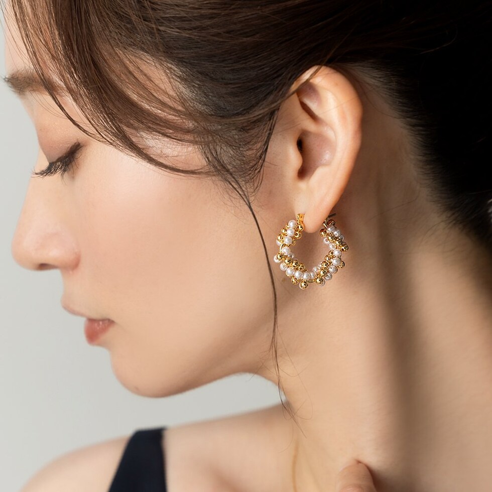 パールとメタルビーズがMIXされたキャッチレスフープピアス。ツイストしたデザインが繊細な艶めきを演出します。これひとつでお顔周りがグッと華やぐひと品◎