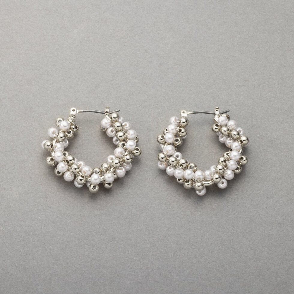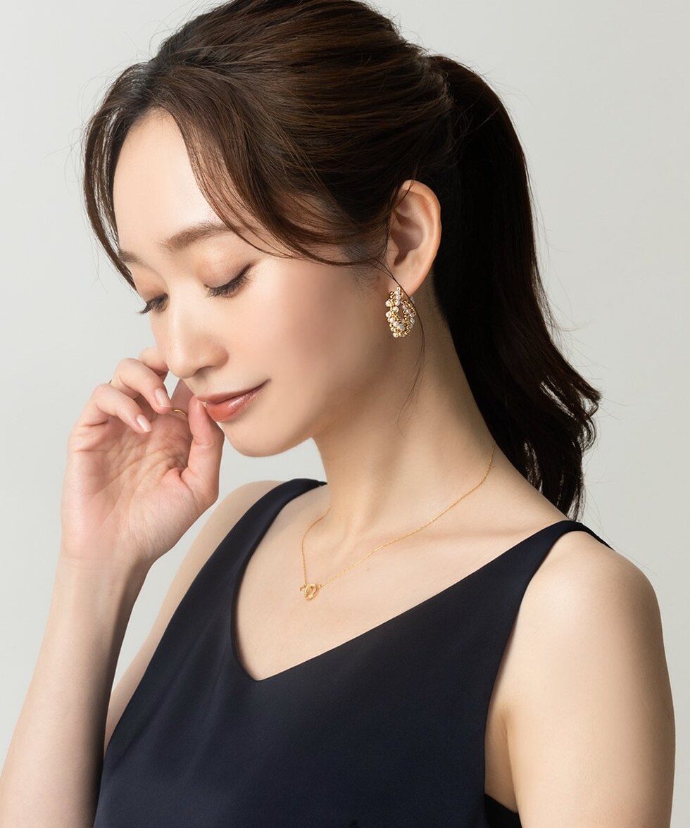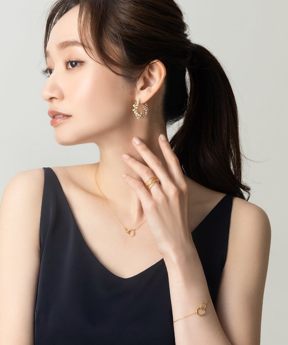 パールとメタルビーズがMIXされたキャッチレスフープピアス。ツイストしたデザインが繊細な艶めきを演出します。これひとつでお顔周りがグッと華やぐひと品◎