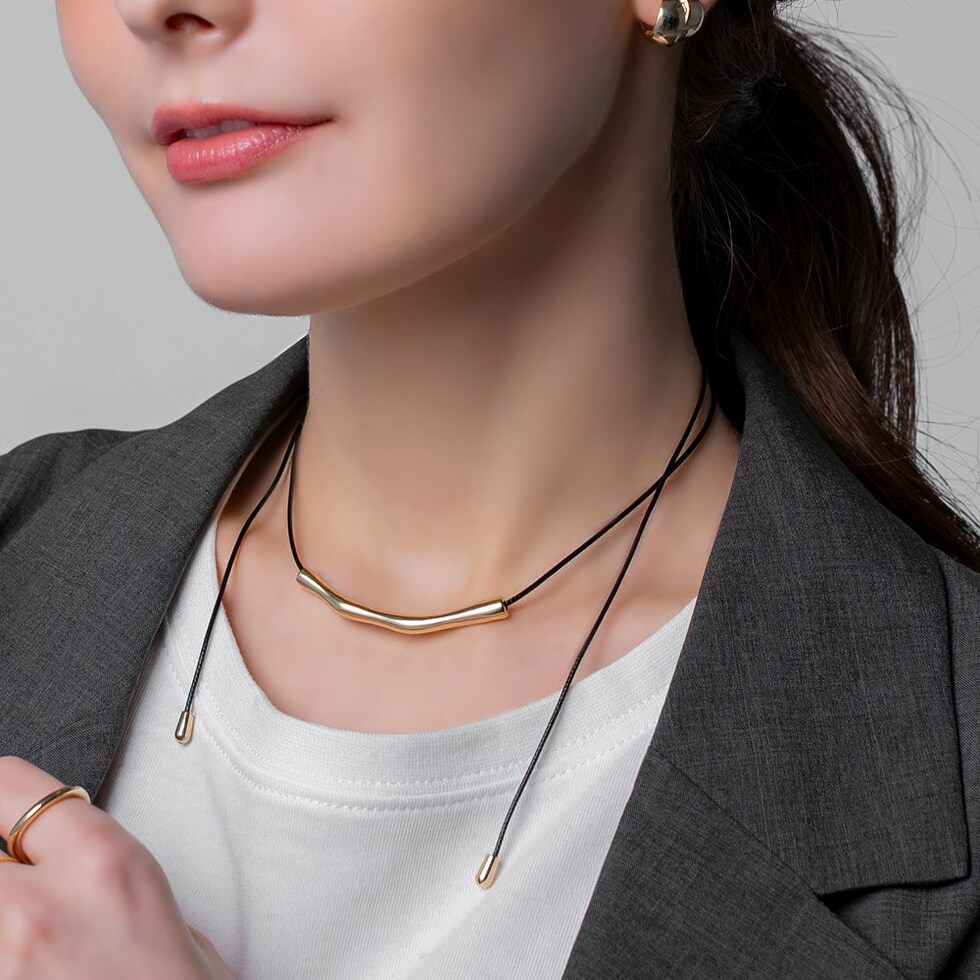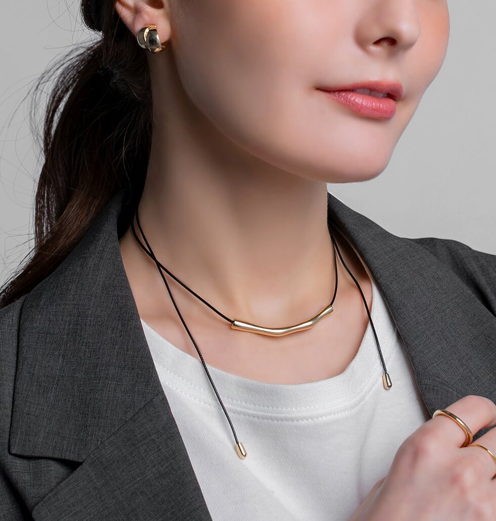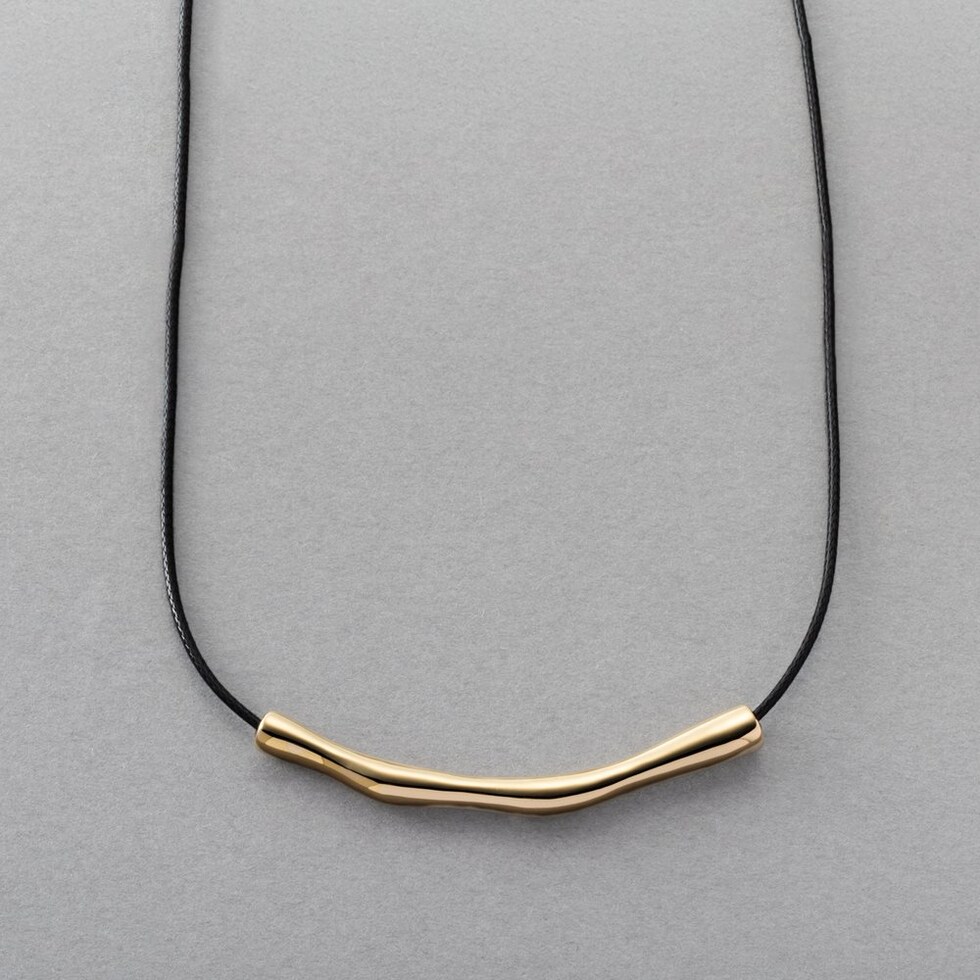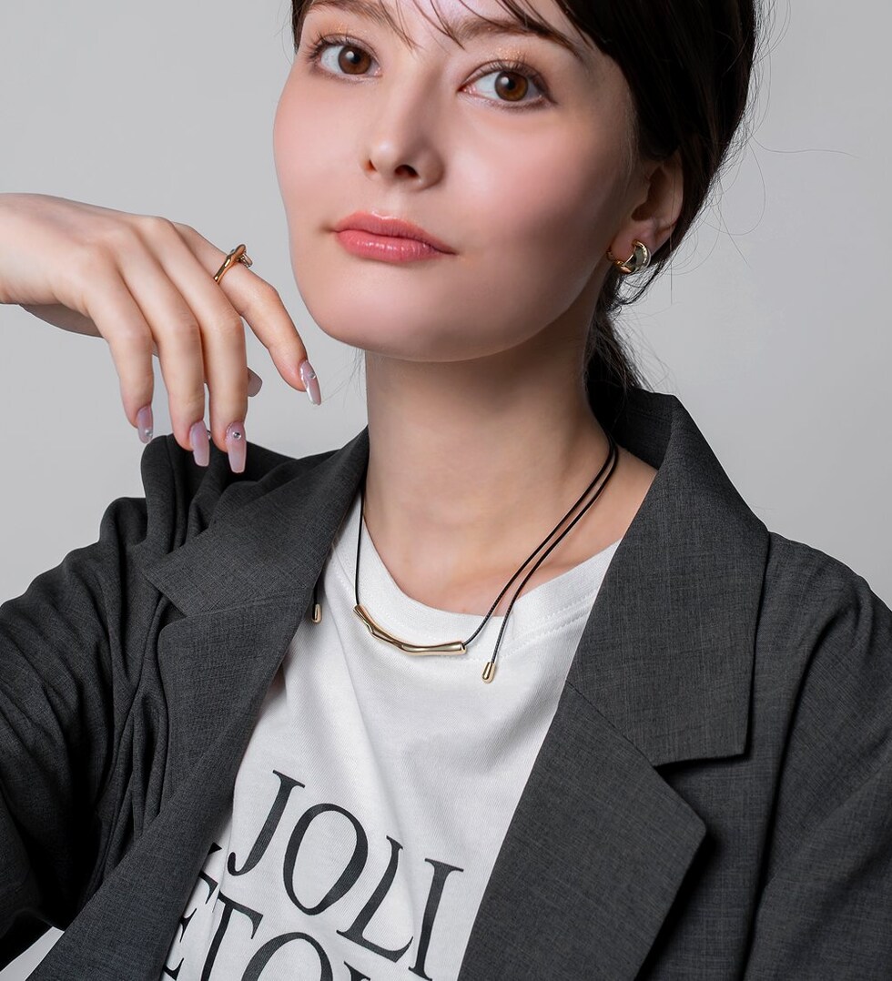 こなれ感漂うメタルパイプのコードネックレス。ニュアンスメタルと細めのレザーコードがトレンド感溢れる印象に。後ろを長くしてネックレスとしてもラリエットとしても使えるアレンジ自在なアイテム。気分やスタイルに合わせてお楽しみいただけます。