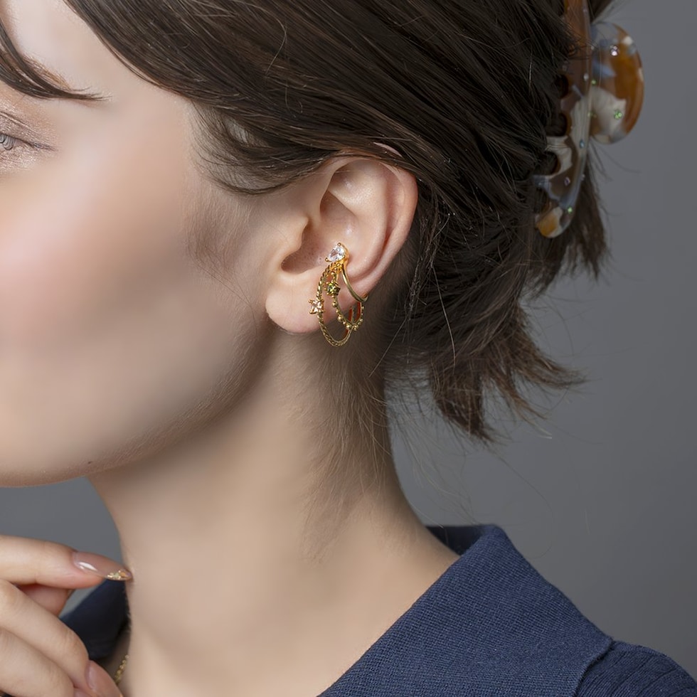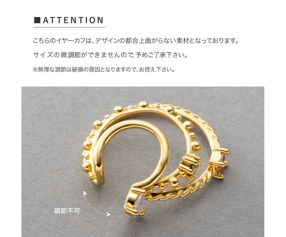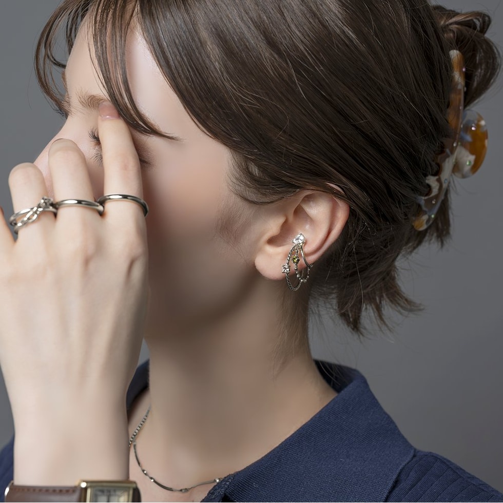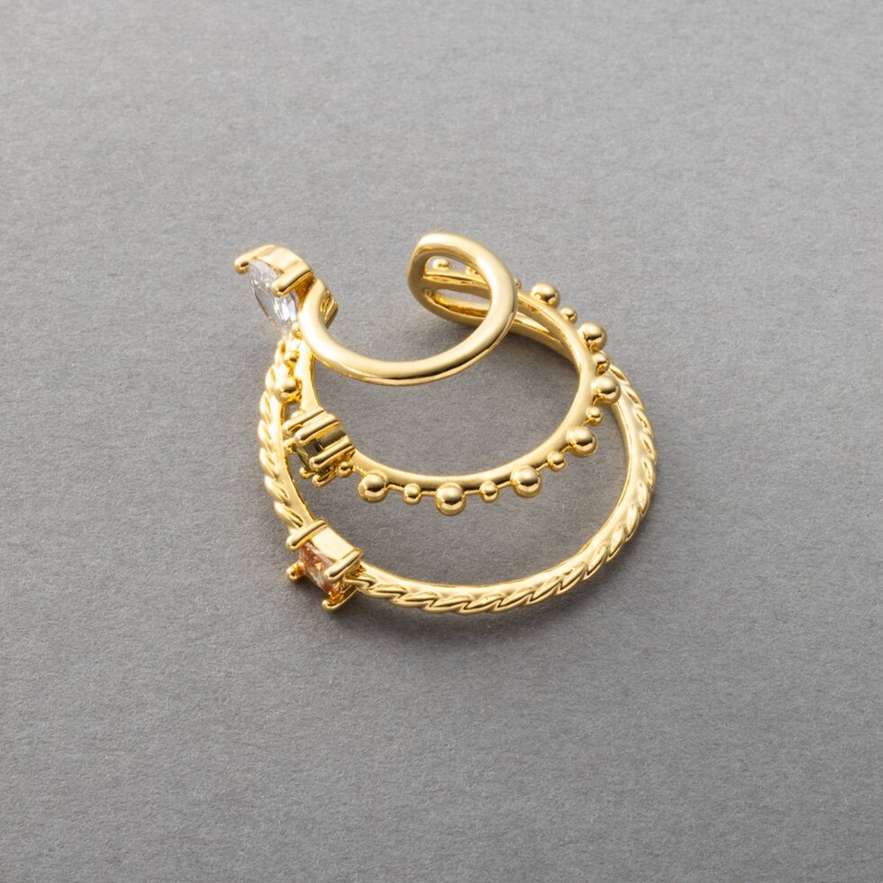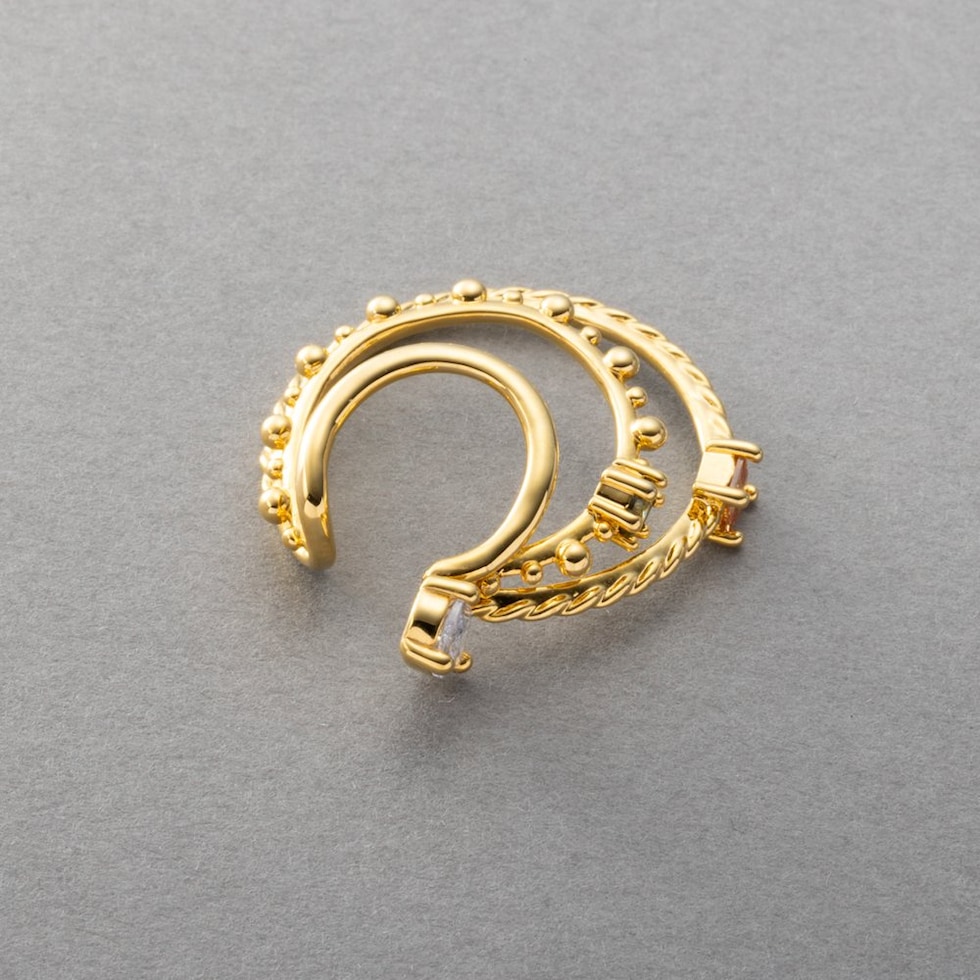 ラグジュアリーな3連フープの片耳用イヤーカフ。一粒のドロップビジューから3種のビジュー付きフープラインが広がるラグジュアリーなデザインで、お顔周りをパッと華やか&上品に飾ります。さりげなく添えた大人色ビジューがpoint。