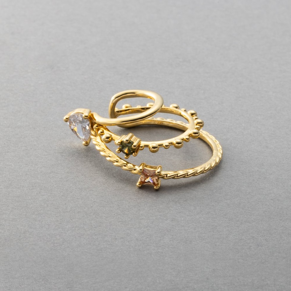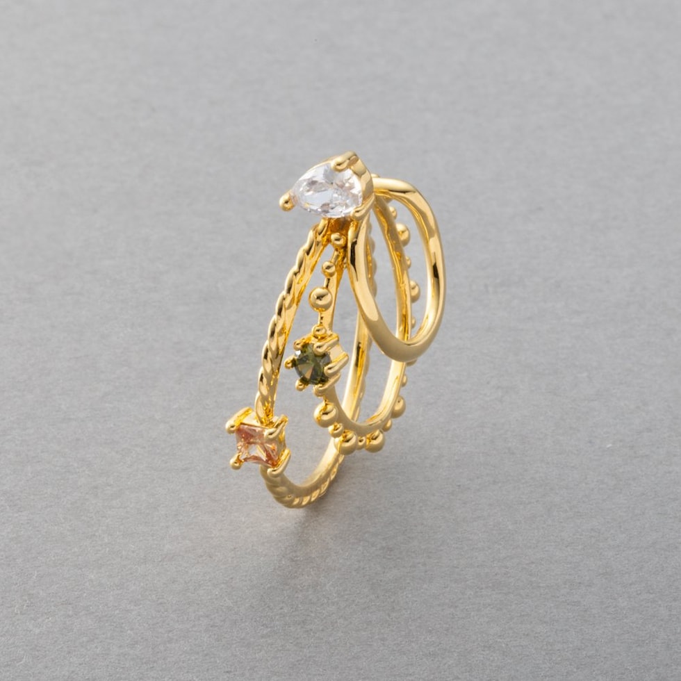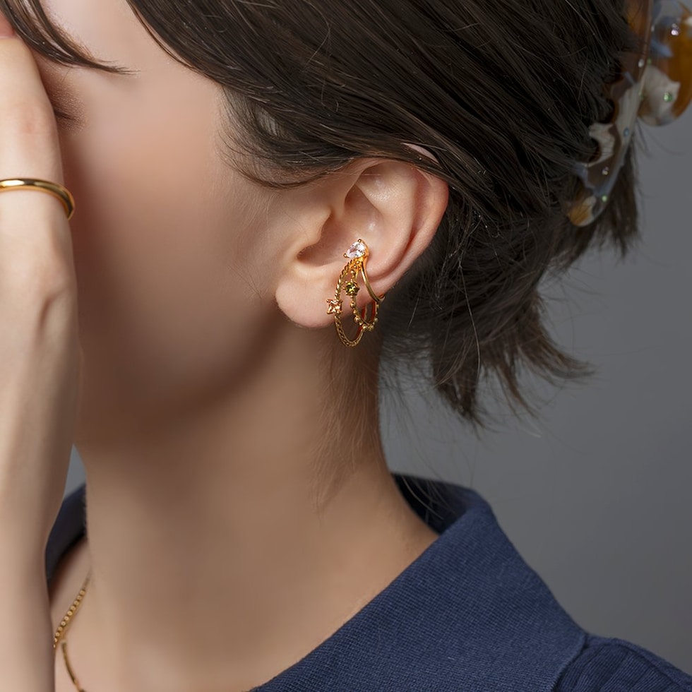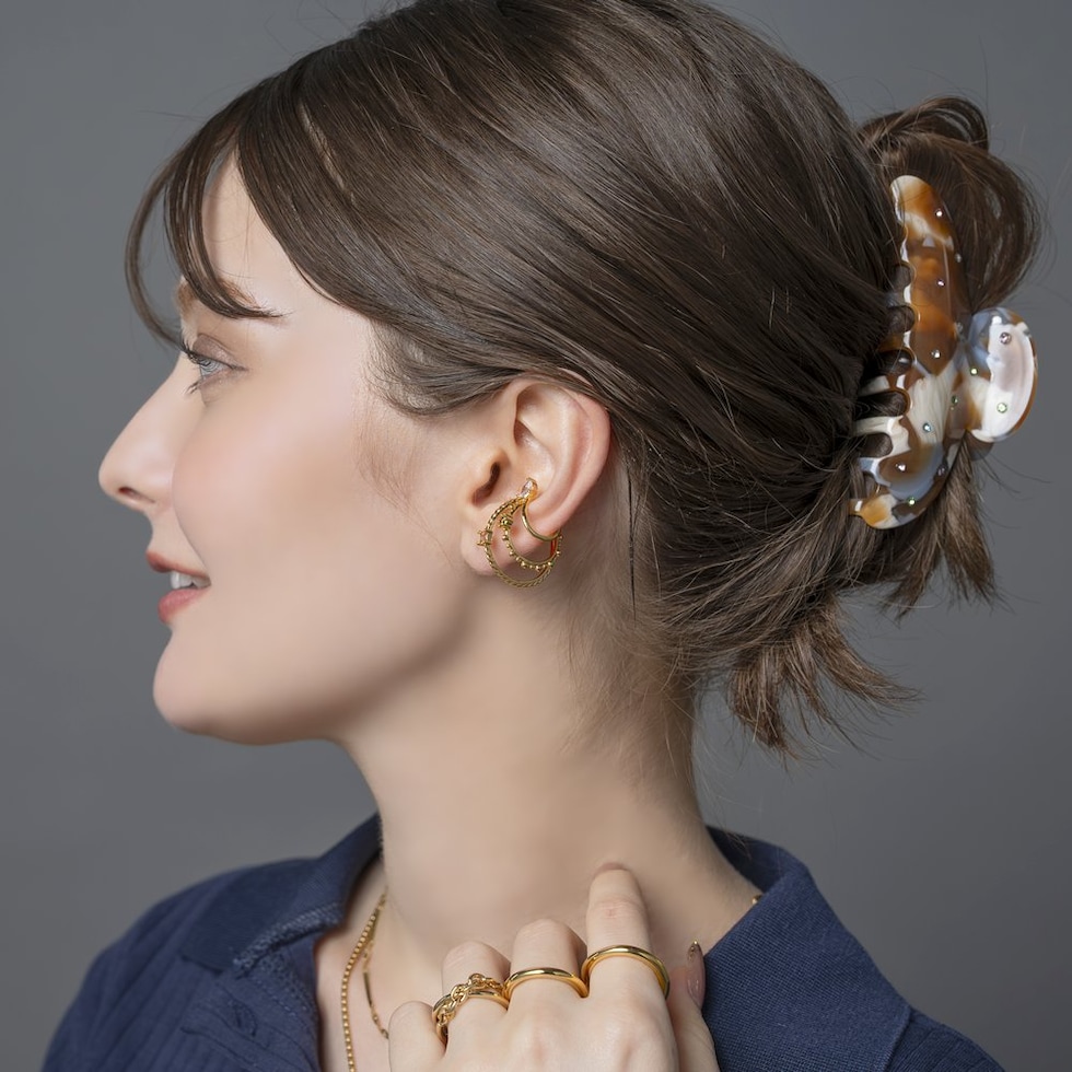 ラグジュアリーな3連フープの片耳用イヤーカフ。一粒のドロップビジューから3種のビジュー付きフープラインが広がるラグジュアリーなデザインで、お顔周りをパッと華やか&上品に飾ります。さりげなく添えた大人色ビジューがpoint。