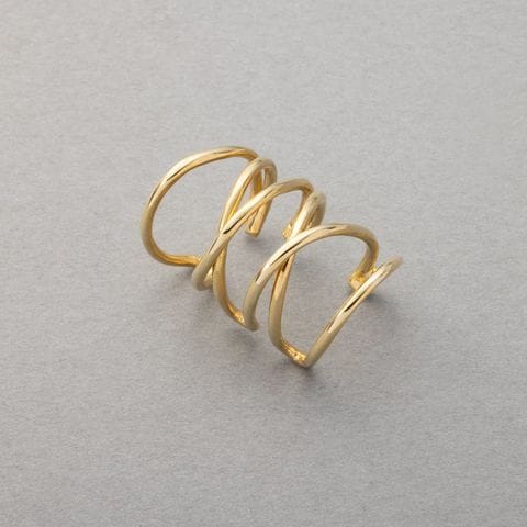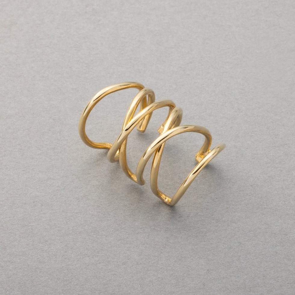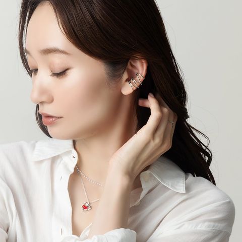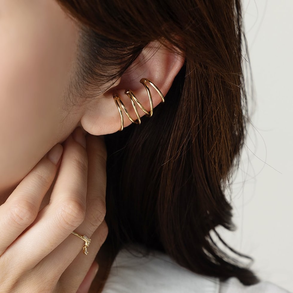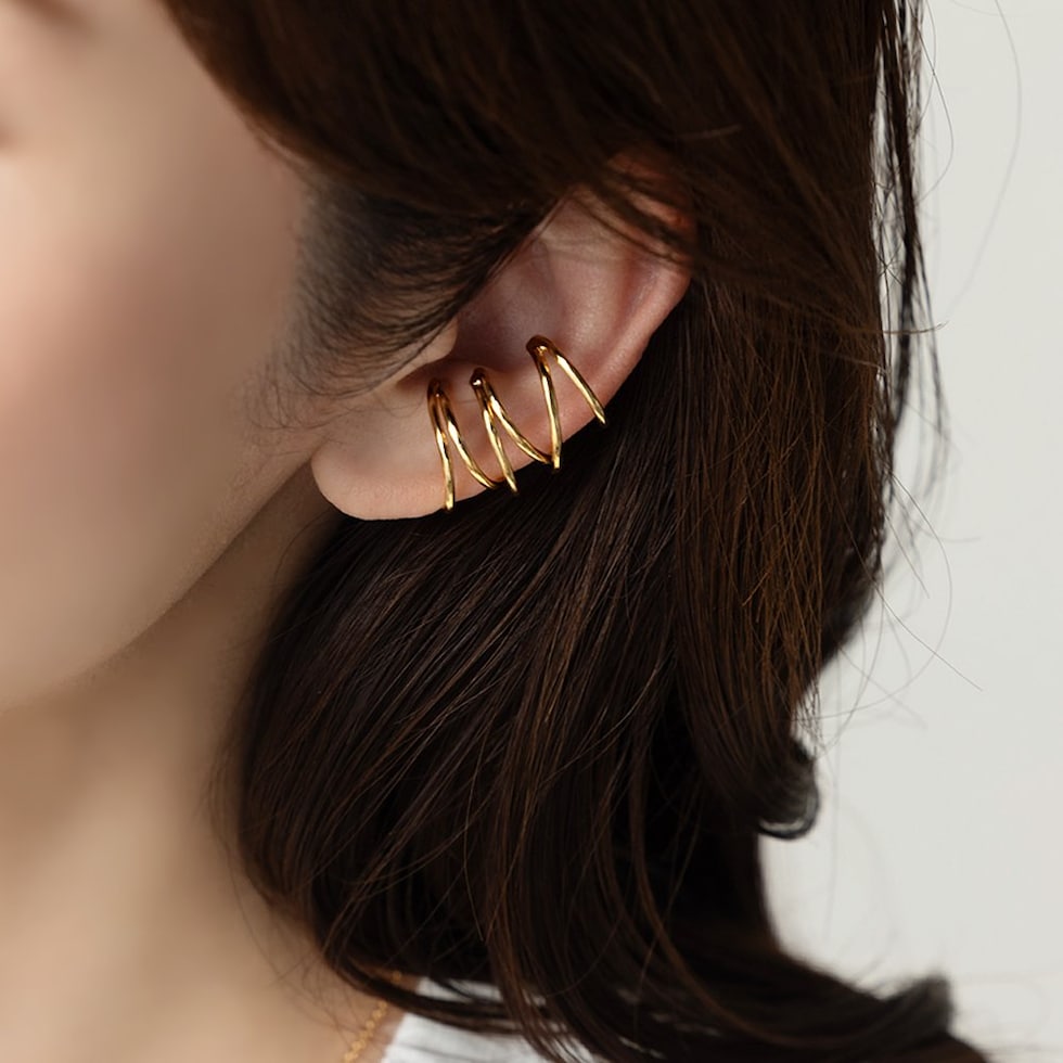 6連クロスラインのレイヤード風イヤーカフ。幾つかのフープを重ね着けしてるようにも見える贅沢な6連ラインが、シンプルながらも存在感バツグン。シンプルなカジュアルコーデに加えるだけで、こなれた大人っぽい表情に◎