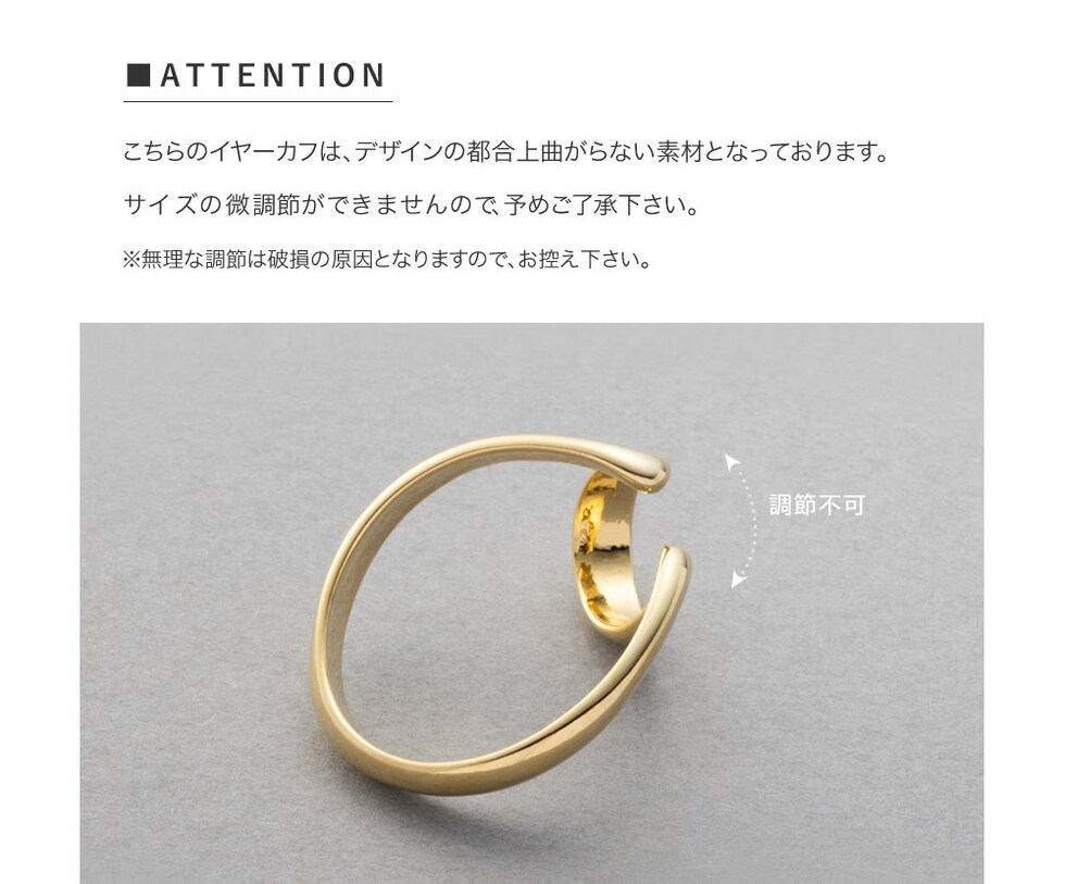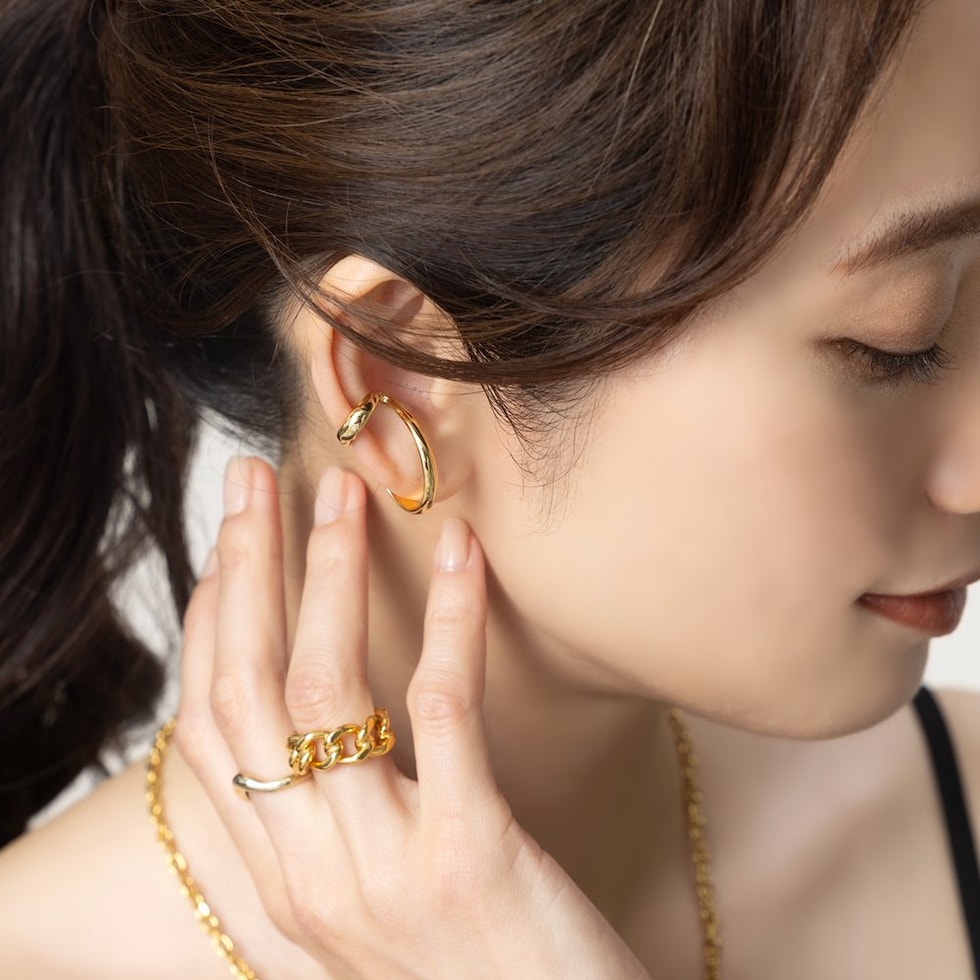 重ねづけしているようなレイヤード風デザインの片耳用イヤーカフ。耳たぶに沿うように着用できる個性的なデザインで、一点投入するだけでこなれ感ある印象的な耳元を演出します。単品使いはもちろん、お手持ちのピアスやイヤーカフと合わせてスタイリングを楽しんで◎